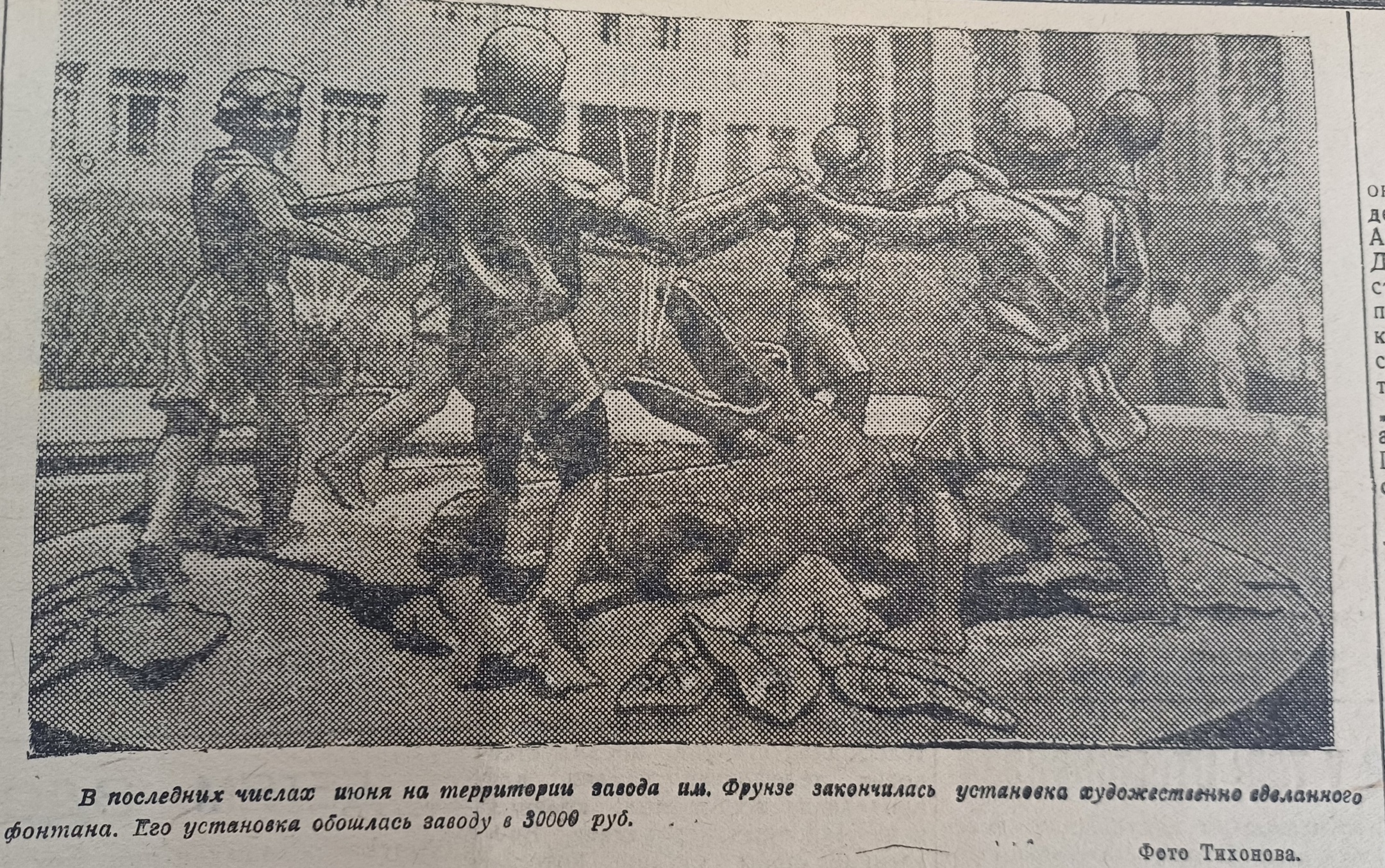 В конце июня 1936 года около Дома культуры обустраивается фонтан. Его установка обошлась Заводу им. Фрунзе в 30 тыс. рублей. Фонтан авторства скульптора Ольги Кудрявцевой получил в народе название «Бармалей» или «Детский хоровод», «Крокодил», «Дети», «Дети и крокодил», «Танцующие дети». В центре фонтана располагался круг из шести детей, водящих хоровод вокруг крокодила.