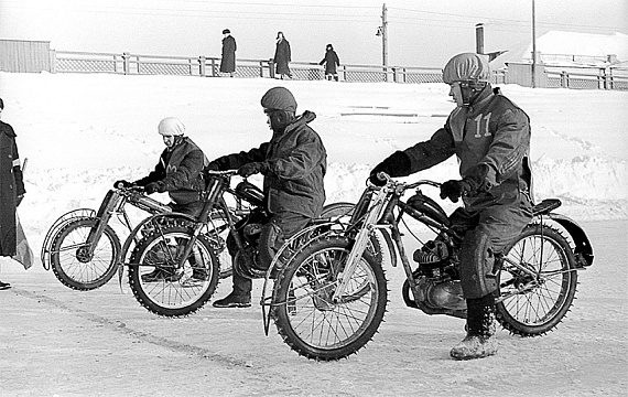 В зимнюю пору советские стадионы заливались льдом, где проводись соревнования по хоккею, конькобежному спорту и спидвею. Сегодня трудно сказать, кому впервые пришла иедя выкатить мотоцикл зимой, да еще и на лед.