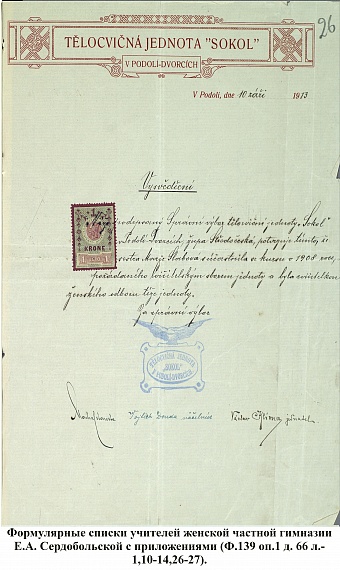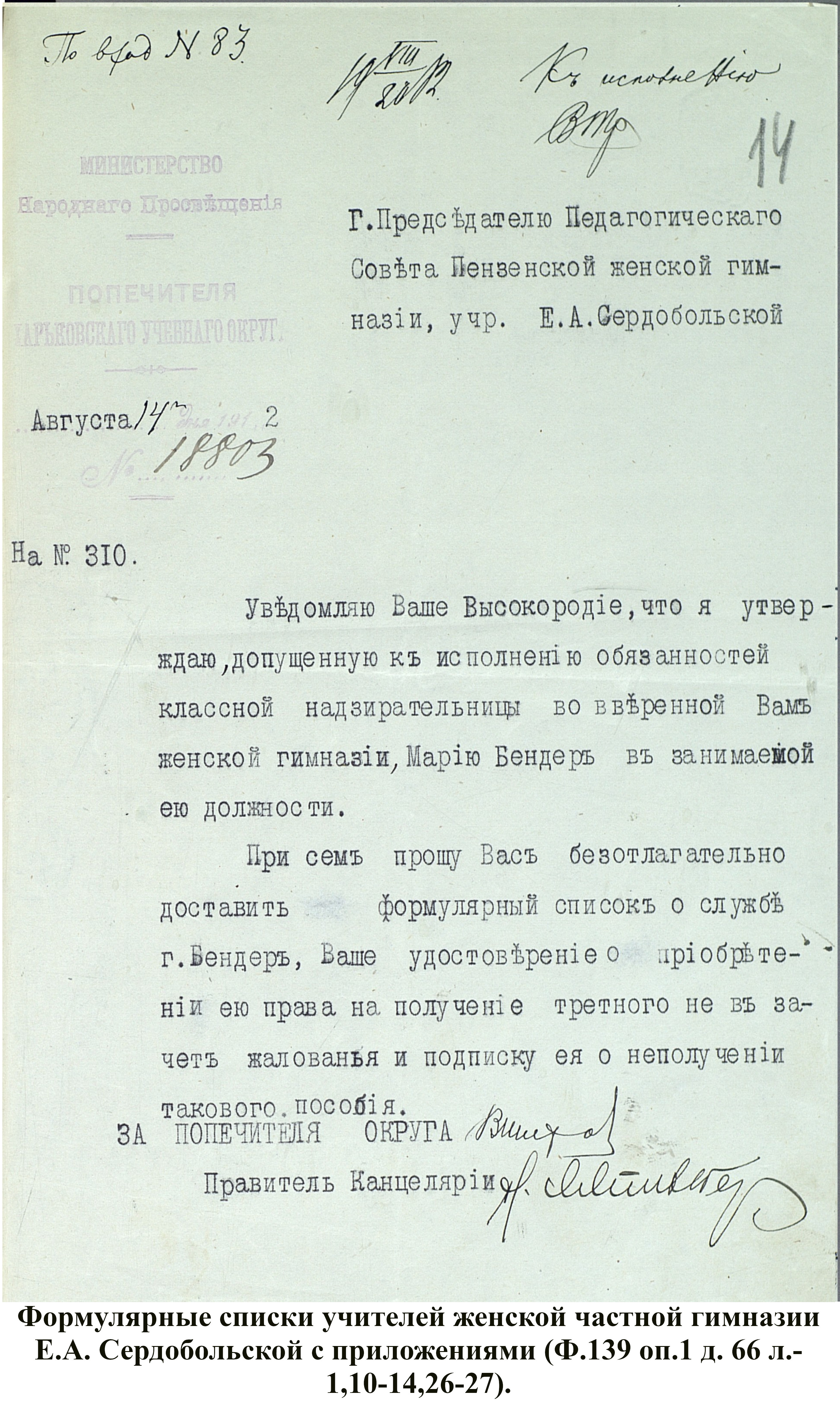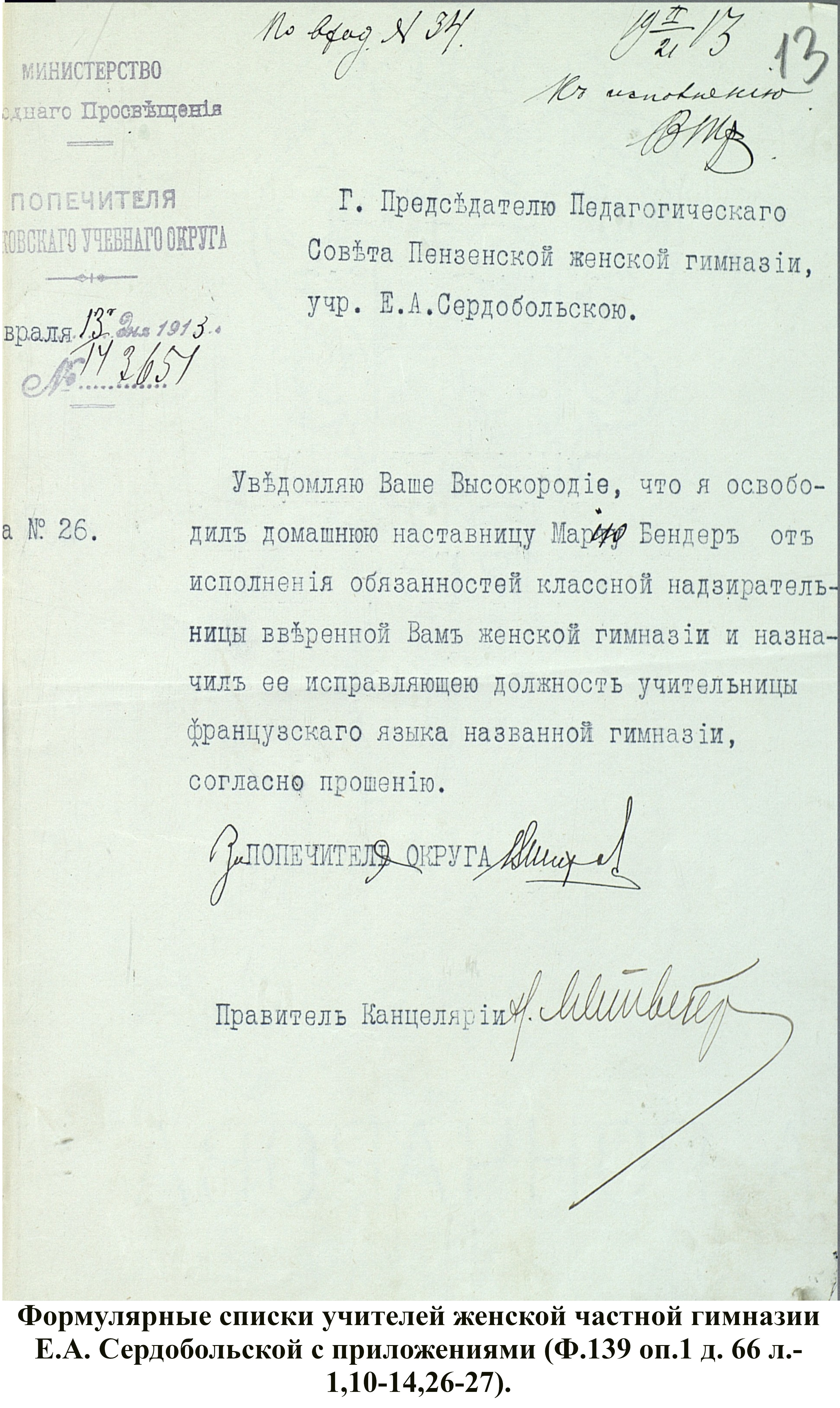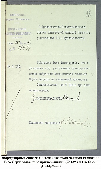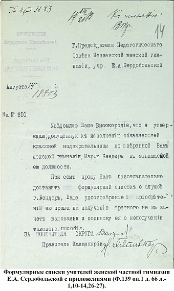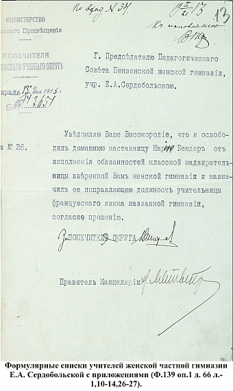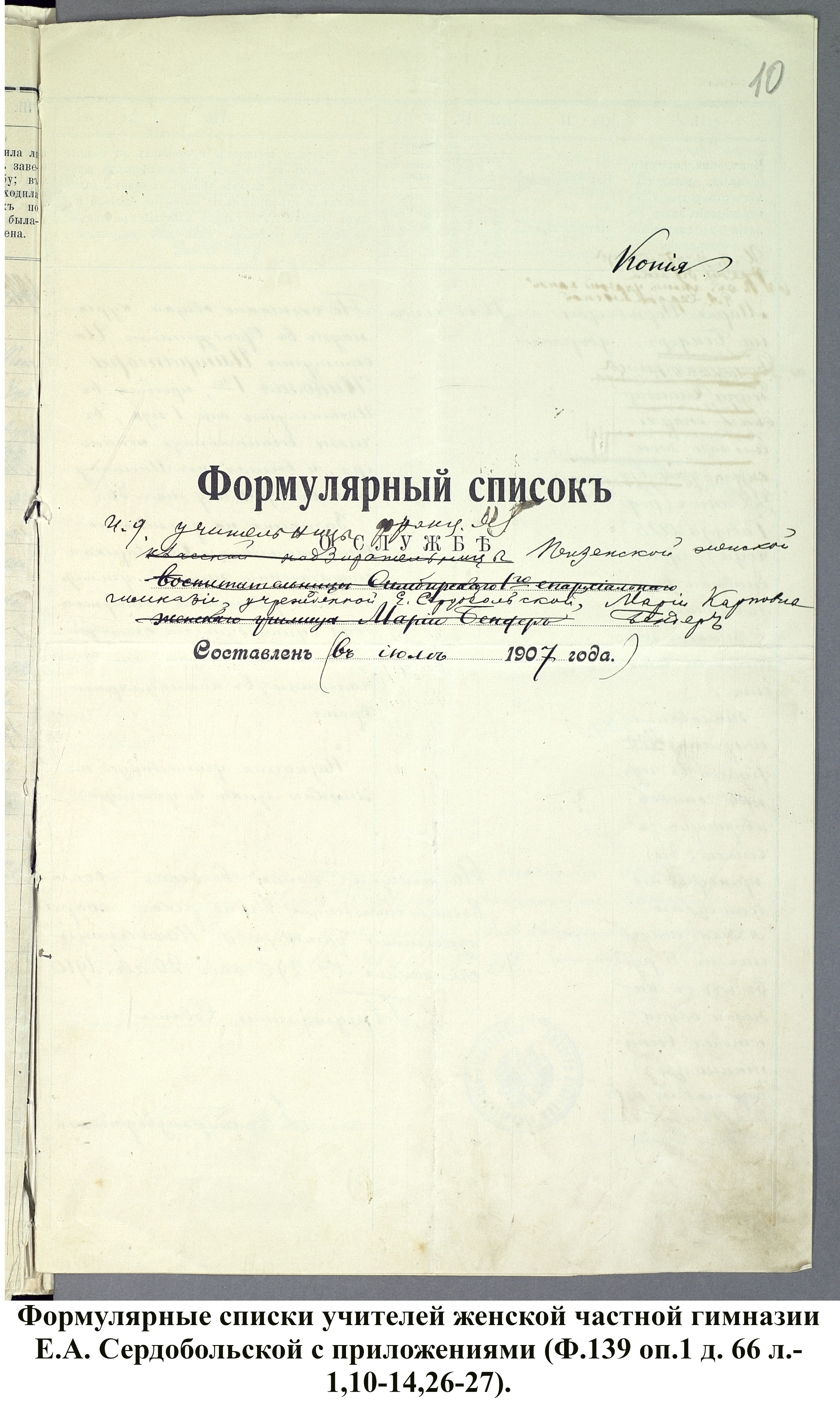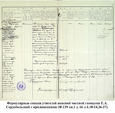 Формулярные списки учителей женской частной гимназии Е.А. Сердобольской с приложениями (Ф.139 оп.1 д. 66 л.1,10-14,26-27).