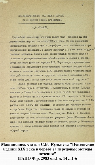 связан с Пензенской областной больницей им. Н.Н. Бурденко. Под его руководством в ней было открыто травматологическое отделение. Свою первую операцию на сердце с широким вскрытием грудной полости при ранении Сергей Васильевич провел 17 июня 1950 г.