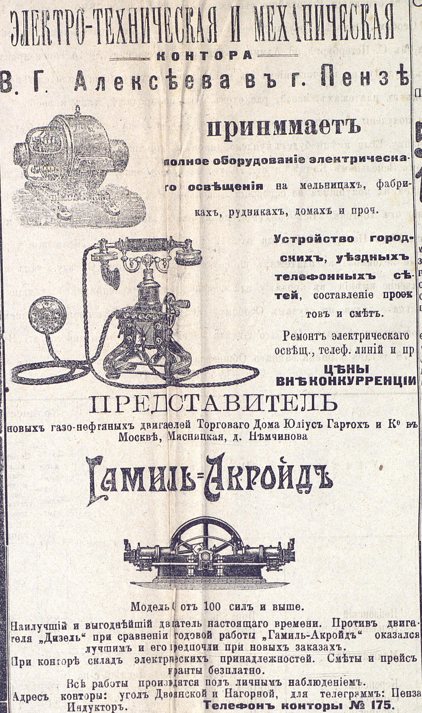 Объявление о продаже оборудования для уличного и домашнего электрического освещения. 1910 год.
