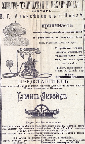 Продажей компактных генераторов для освещения домов сегодня никого не удивишь. Однако сейчас их покупают на случай аварий, или для работы на местности, где отсутствует подведенная электроэнергия. А на рубеже XIX-XX веков в Пензе подобные генераторы брали для освещения обычных городских квартир, магазинов и улиц перед ними. Причем делалось это исключительно по инициативе и за деньги самих собственников.