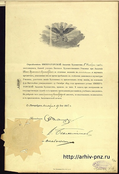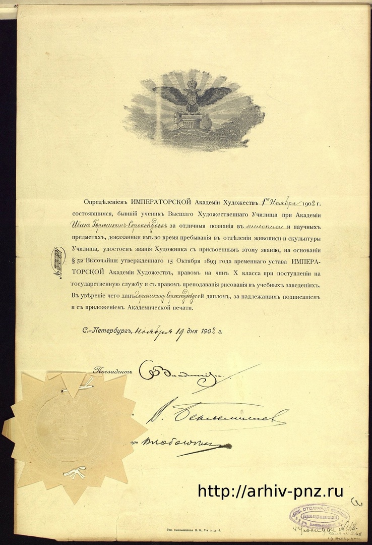 Проходит около трех лет и в канцелярию Императорской академии художеств 9 сентября 1895 г. поступает прошение от саратовского мещанина Горюшкина-Сорокопудова, который просит принять его в число вольнослушателей Высшего художественного училища по «отделу живописи», работавшего с 1894 г. под контролем Академии. После окончания учебы Ивану Силычу предлагали место в Петербурге, но его влекло в среднюю полосу России.