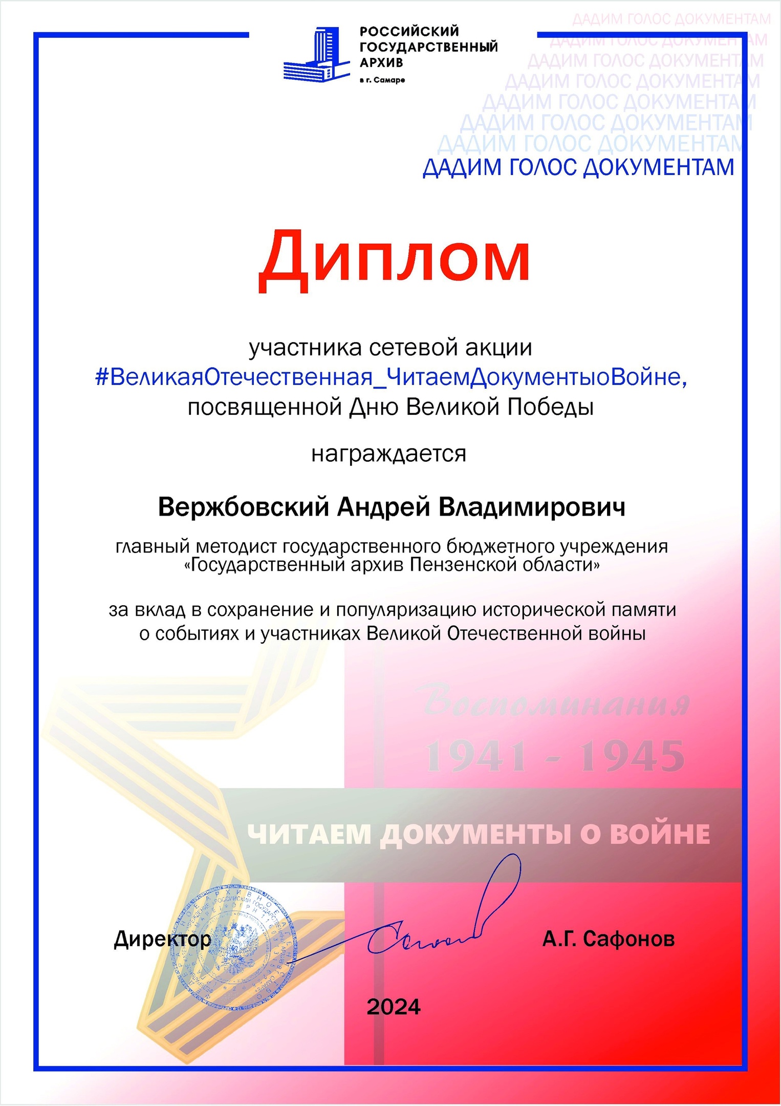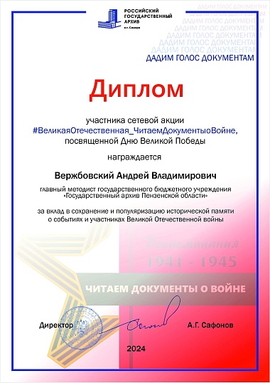 Госархив Пензенской области награждён дипломом за участие в сетевой акции #ВеликаяОтечественная_ЧитаемДокументыоВойне2024