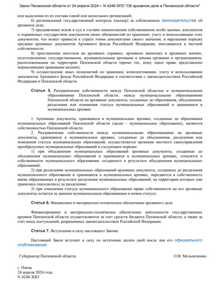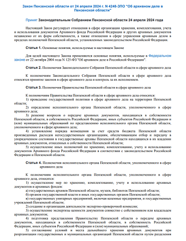 Закон Пензенской области от 19 августа 2015 г. N 2791-ЗПО "Об архивном деле в Пензенской области" был отменен. Законодательным Собранием Пензенской области 24 апреля 2024 года принят новый Закон Пензенской области от 24 апреля 2024 г. N 4248-ЗПО "Об архивном деле в Пензенской области".