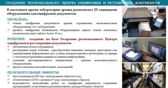Одна из инициатив заключается в создании регионального Центра оцифровки и реставрации документального наследия Вологодчины. Создание данного центра предполагает выделение дополнительных площадей, закупку дополнительного сканирующего и реставрационного оборудования, найм и обучение персонала.
