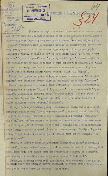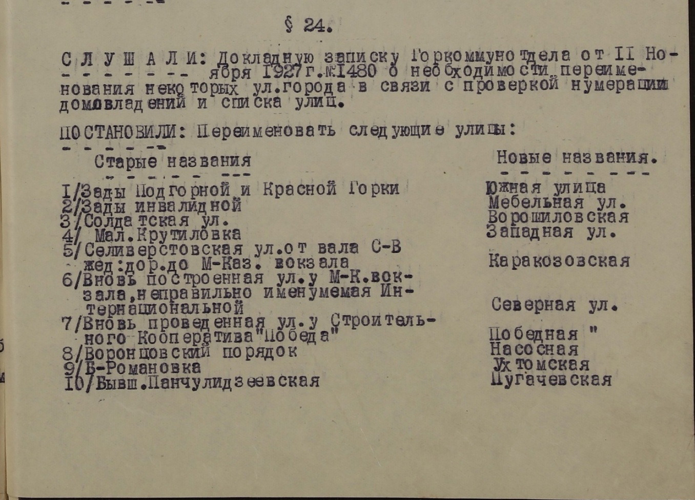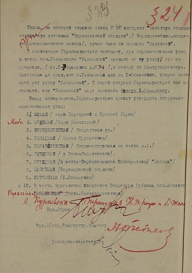После перечисления вышеуказанных фактов, Горкомотдел попросил утвердить следующие названия улиц: