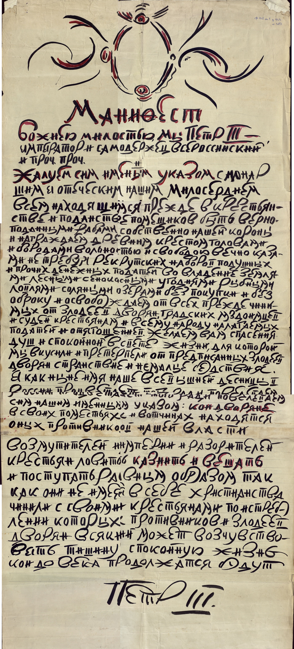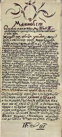 1. Копия указа Е. Пугачёва от 3 августа 1774 г. к жителям Пензы [бумага, перьевая ручка] из фонда Пензенской губернской учёной архивной комиссии. Без даты.