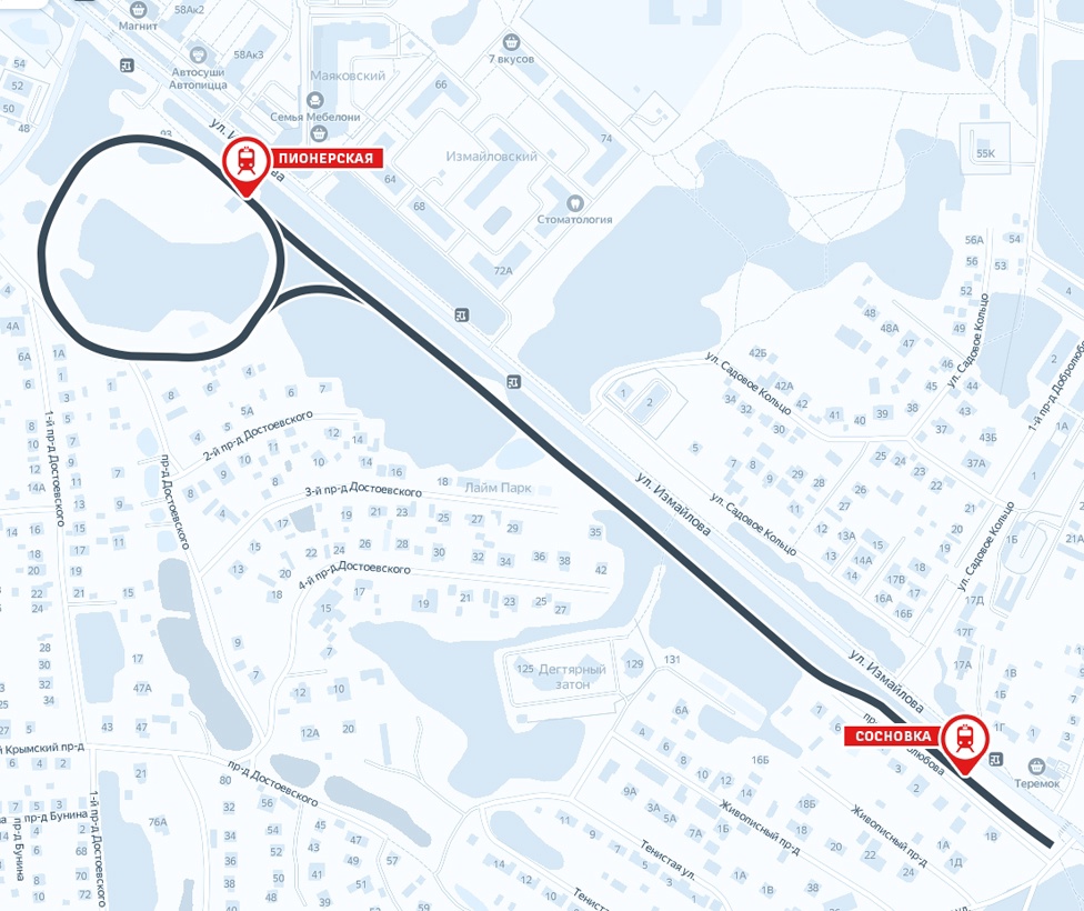 К августу 1985 года на дороге функционировали две станции: Пионерская и Сосновка. Предполагалось также соорудить одну промежуточную станцию Озёрная и платформу Лесная, но проект не был реализован.