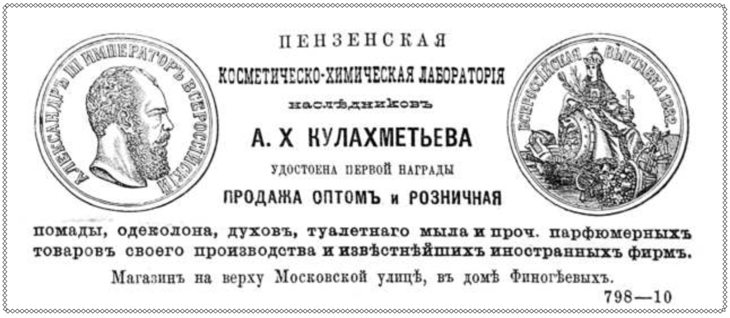 В магазине на Московской была представлена богатая палитра товаров. В рекламе говорилось следующее: «Косметическо-химическая лаборатория Кулахметьева представляет помаду, одеколоны, духи, мыло и прочие парфюмерные товары собственного производства. Продажа оптом и в розницу».