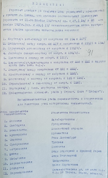 В тот же год названия получили и новые улицы Пензы: Клубная, Фабричная, Вяземского и т.д. Кстати, некоторых из тех улиц уже нет на картах города – Мортирная, Крестьянская, Замкнутая. Полностью с делом можно ознакомиться по Ф.453. Оп.1. Д.133