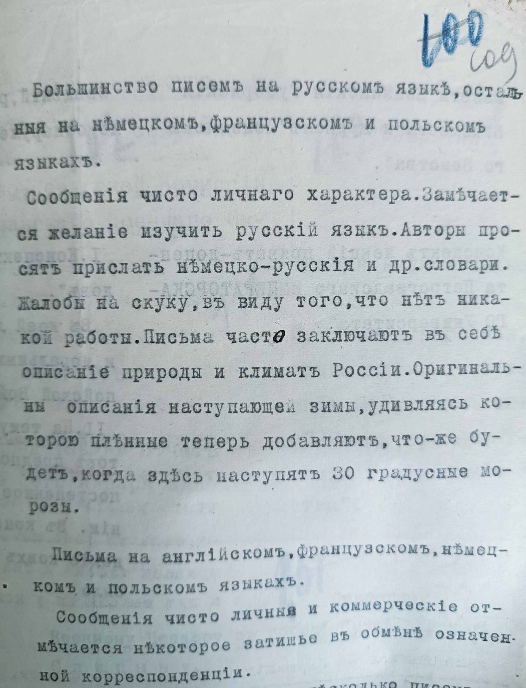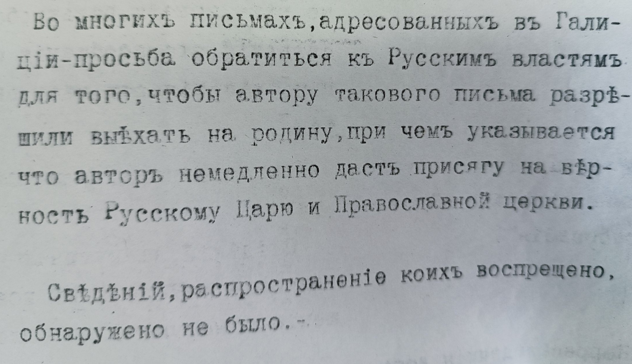 «Во многих письмах, адресованных в Галиции – просьба обратиться к Русским властям для того, чтобы автору такого письма разрешили выехать на родину, причём указывается, что автор немедленно даст присягу на верность Русскому царю и Православной церкви», - отмечалось в пензенском военно-цензурном пункте.