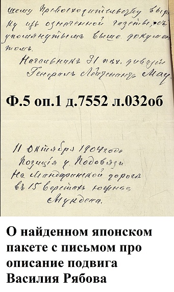 Фрагмент выставки - из рапорта японского офицера: «Солдат Василий Рябов, 33 года, из охотничьей команды 284-го Чембарского полка, одетый как китайский крестьянин, 17 сентября 1904 года был пойман нашими солдатами. Он по изъявленному им желанию был послан к нам для разведывания о местоположении и действиях нашей армии. После рассмотрения дела установленным порядком Рябов приговорён к смертной казни. Последняя была совершена ружейным выстрелом. Доводя это событие до сведения Русской армии, наша армия не может не высказать наших искренних пожеланий уважаемой армии, чтобы последняя воспитывала побольше таких прекрасных, достойных полного уважения воинов, как ознаменованный Рябов. Сочувствие к этому храброму, преисполненному чувства своего долга, примерному солдату достигло высшего предела».