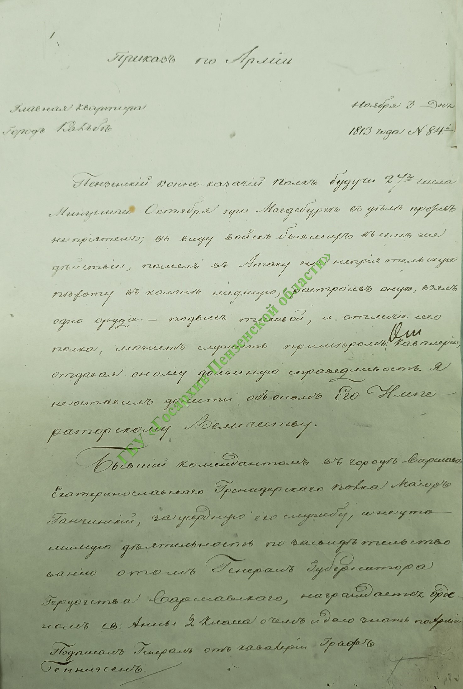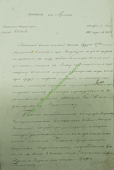 Среди прочего упоминались численность ополчения, пожертвования, собранные для наших воинов, список вооружения, переданного в армию и т.п. Но, пожалуй, самый любопытное в отчёте – описание подвига пензенского конно-казачьего полка в сражениях под Магдебургом в Заграничном походе 1813 года.