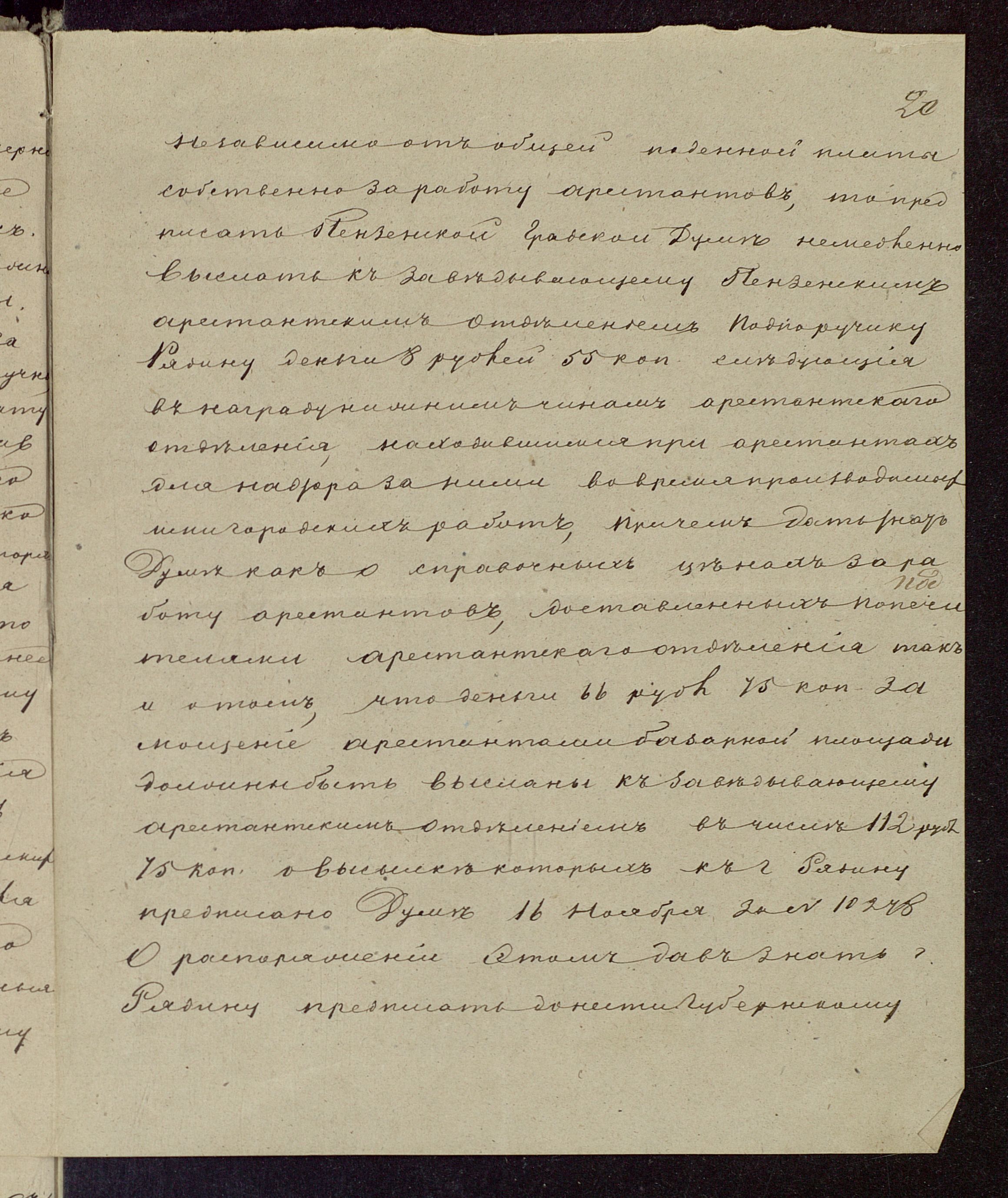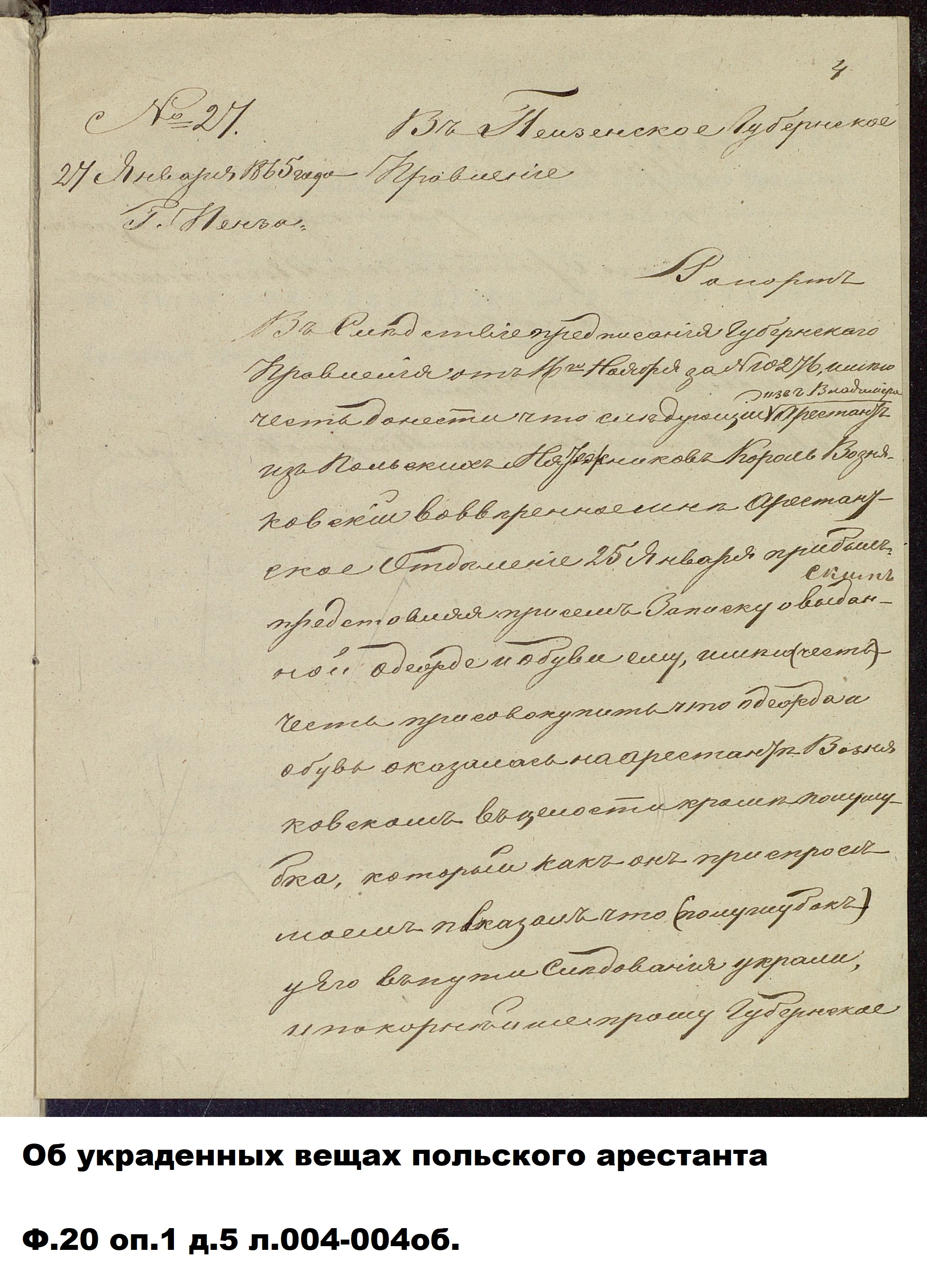 Этапировали поляков частями и прибывали они порой чуть ли не в обносках. Так например, заведующий арестантским отделением подпоручик Рядин докладывал в губернское правление, о том, что у одного заключённого украли полушубок и ему не в чем ходить зимой, у другого совершенно нет постельного белья.
