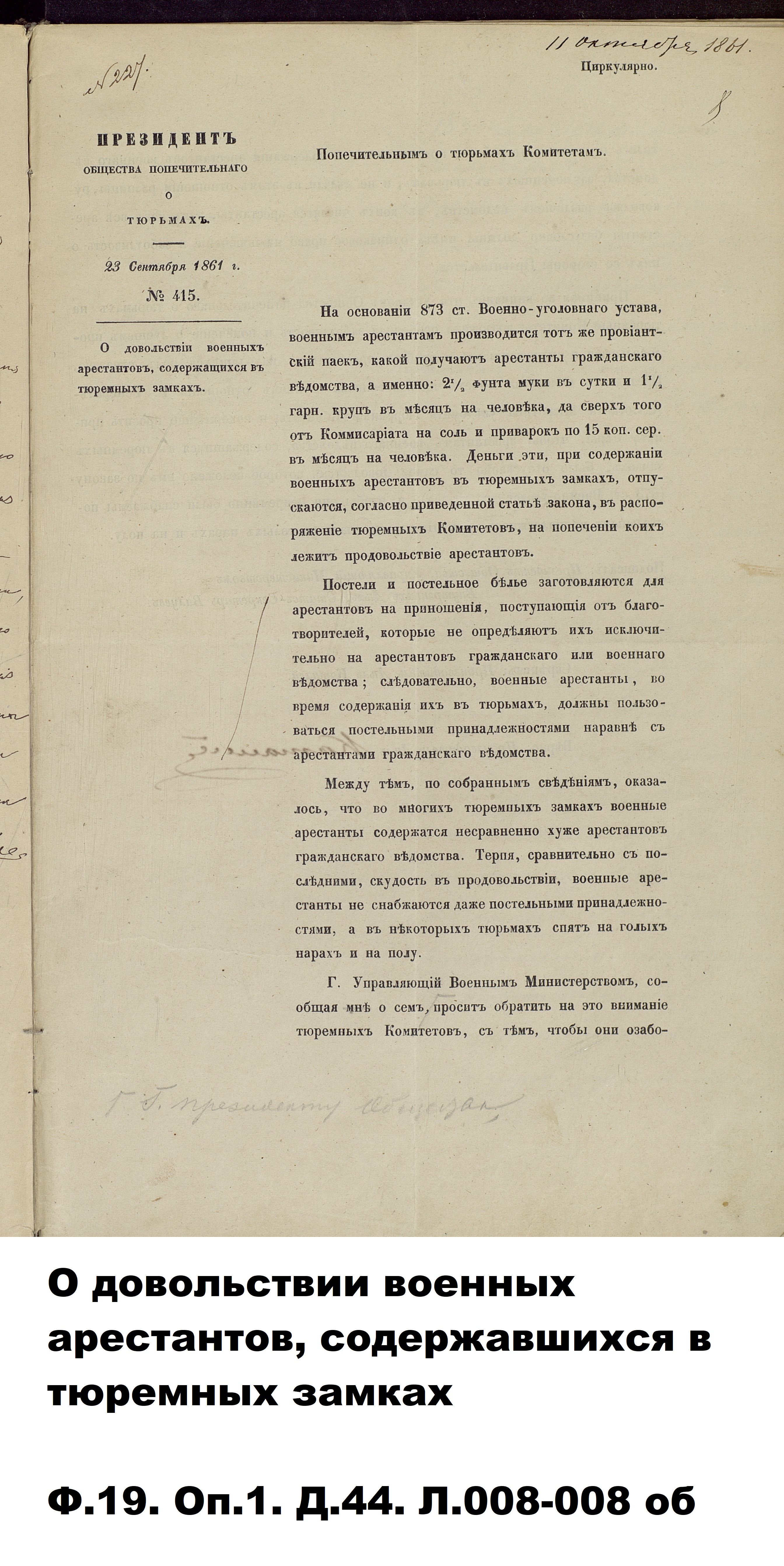 Вообще, арестантам приходилось тяжко. О чём, к примеру, докладывал президент общества попечительского о тюрьмах комитета: «Во многих тюремных замках военные арестанты содержатся несравненно хуже арестантов гражданского ведомства. Терпя скудость в продовольствии, военные арестанты не снабжаются даже постельными принадлежностями, а в некоторых тюрьмах спят на голых нарах и полу».