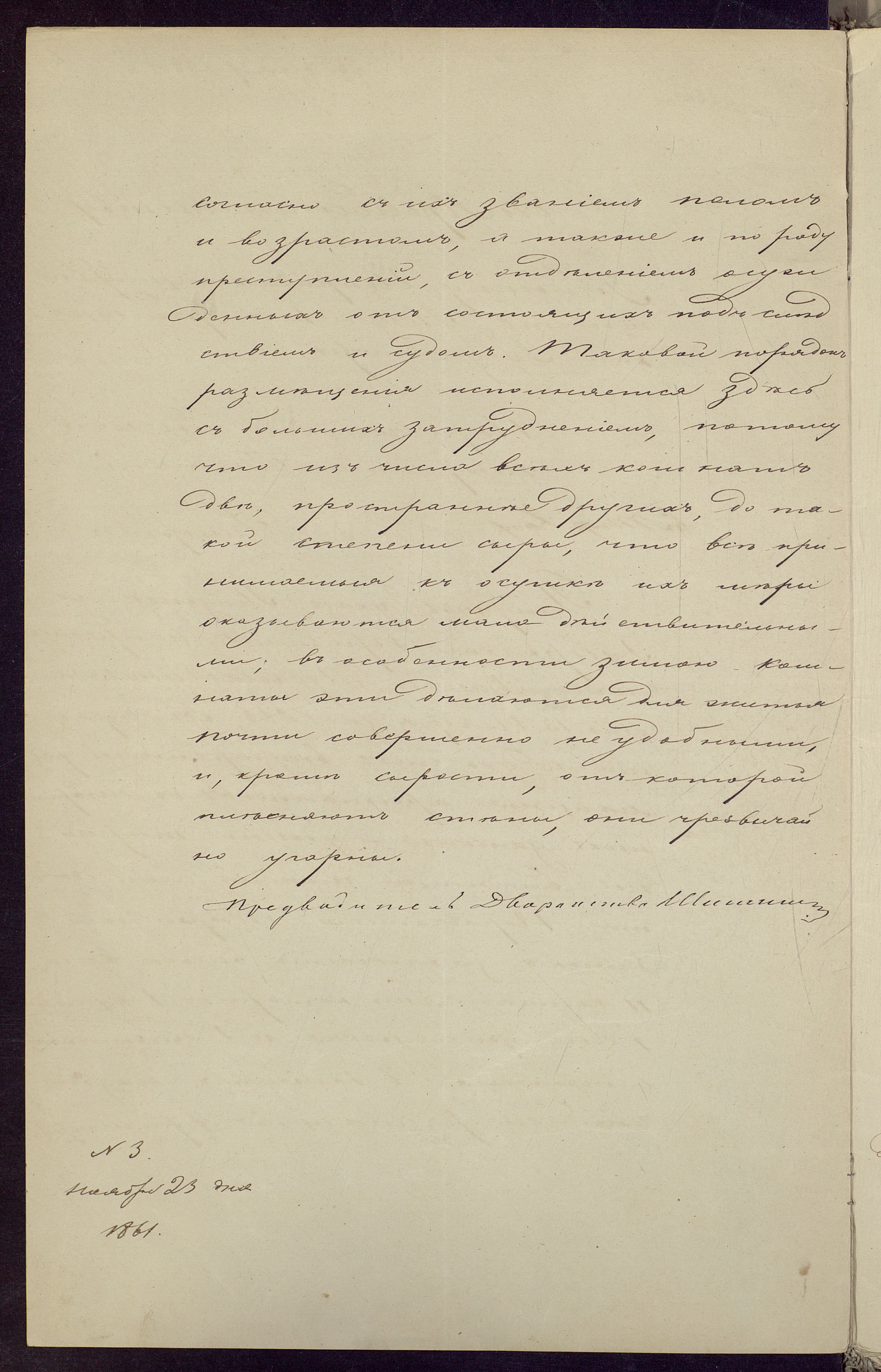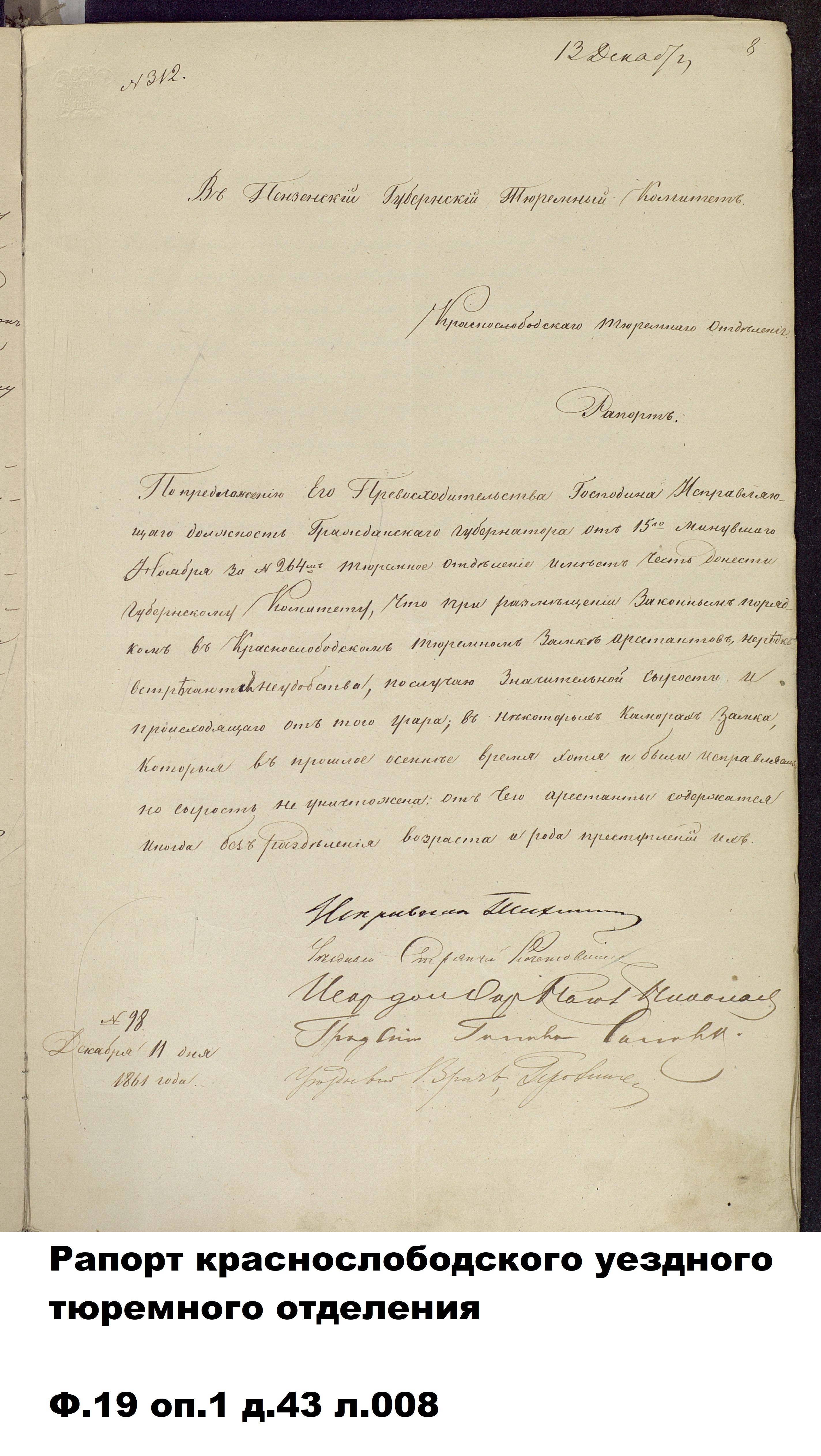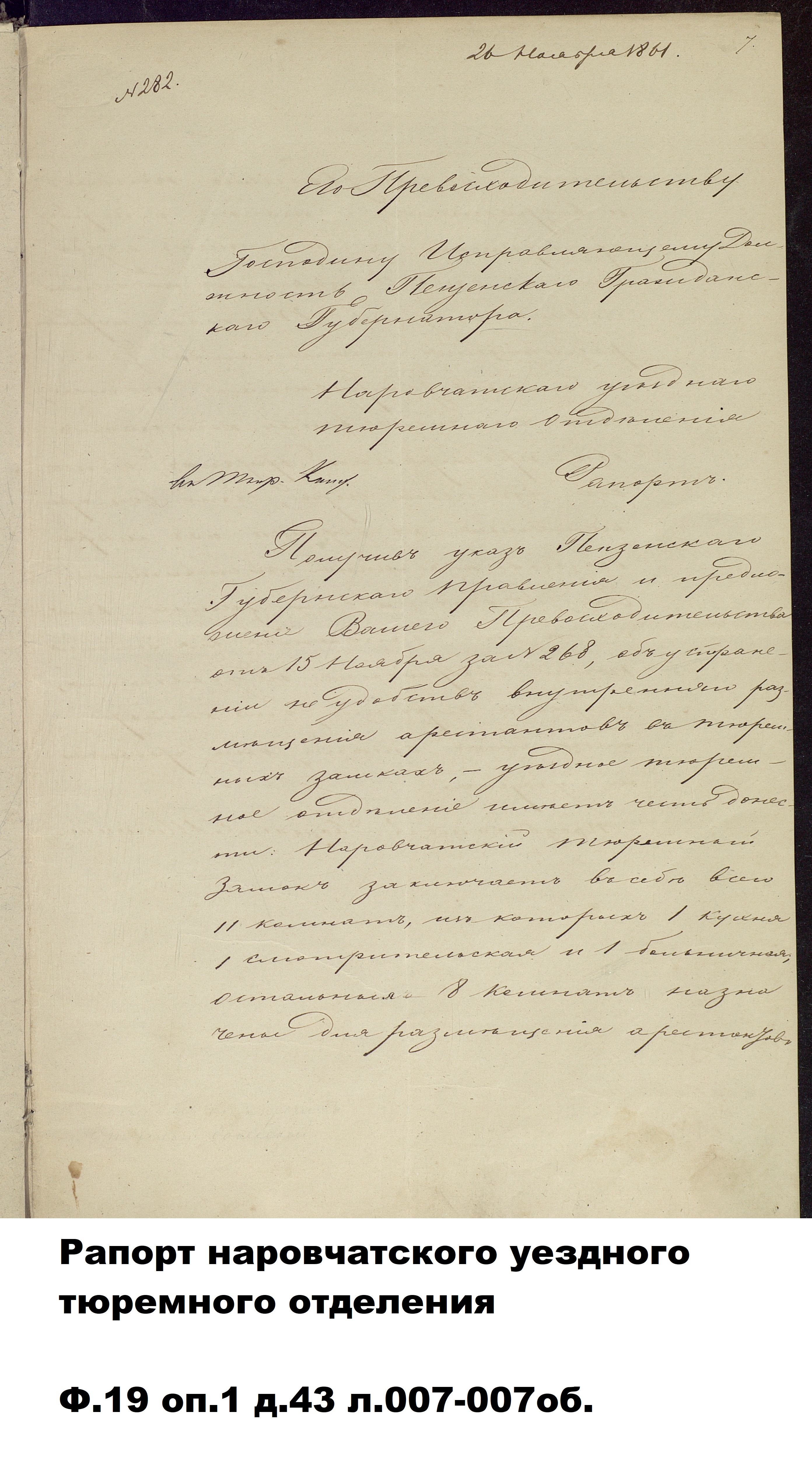 Далее начиналось размещение арестантов. Жили они в тюремных бараках и по закону предполагалось, что заключённые такого типа должны находиться отдельно от остальных. Однако, из-за переполненности камер, а также помещений совершенно непригодных для обитания, требование это зачастую не соблюдалось. Да и сами условия заключения идеальными назвать крайне трудно. Для примера, из рапорта начальника наровчатского тюремного отделения: «Две комнаты до такой степени сыры, что все принимаемые к осушению меры оказываются малодейственными; в особенности зимой комнаты эти делаются для жития почти совершенно неудобными и кроме сырости, от которой плесневеют стены, они чрезвычайно угарны». Или другой пример, отчёт от 28 ноября 1861 года: «Помещения в тюрьмах оказываются несоразмерными по числу арестантов; прачечные помещения причиняют сырость, бани устроены неудобно, ретирады же находятся внутри и не имеют вентиляции»4. Санитарные условия тоже оставляли желать лучшего – от этих самых ретирад – туалетов пахло так сильно, что запах нечистот доходил до дальних камер. К тому же в тюрьме водилась ещё и большая популяция крыс. Вредные зверьки даже прогрызли деревянный настил в амбаре и поедали там крупы.