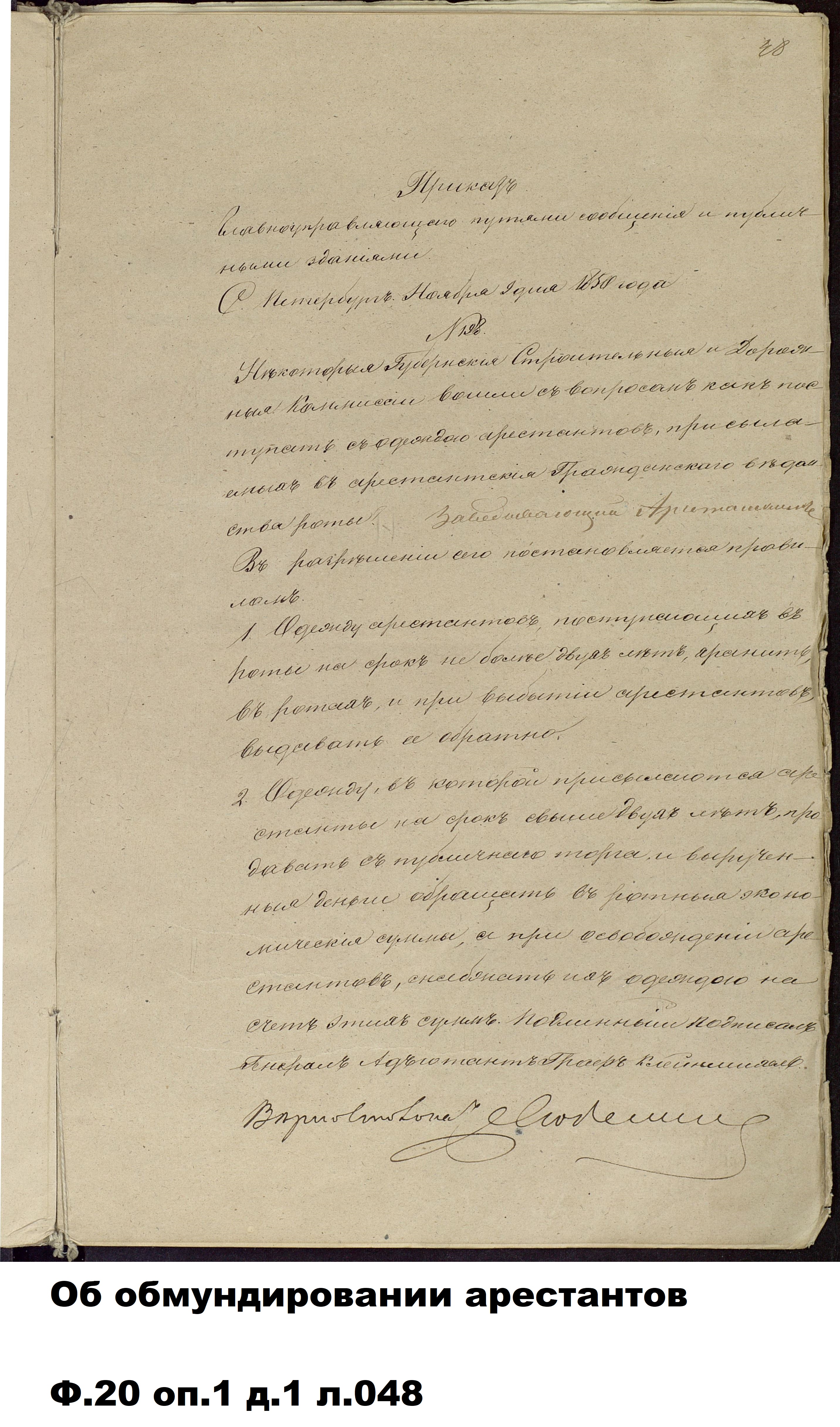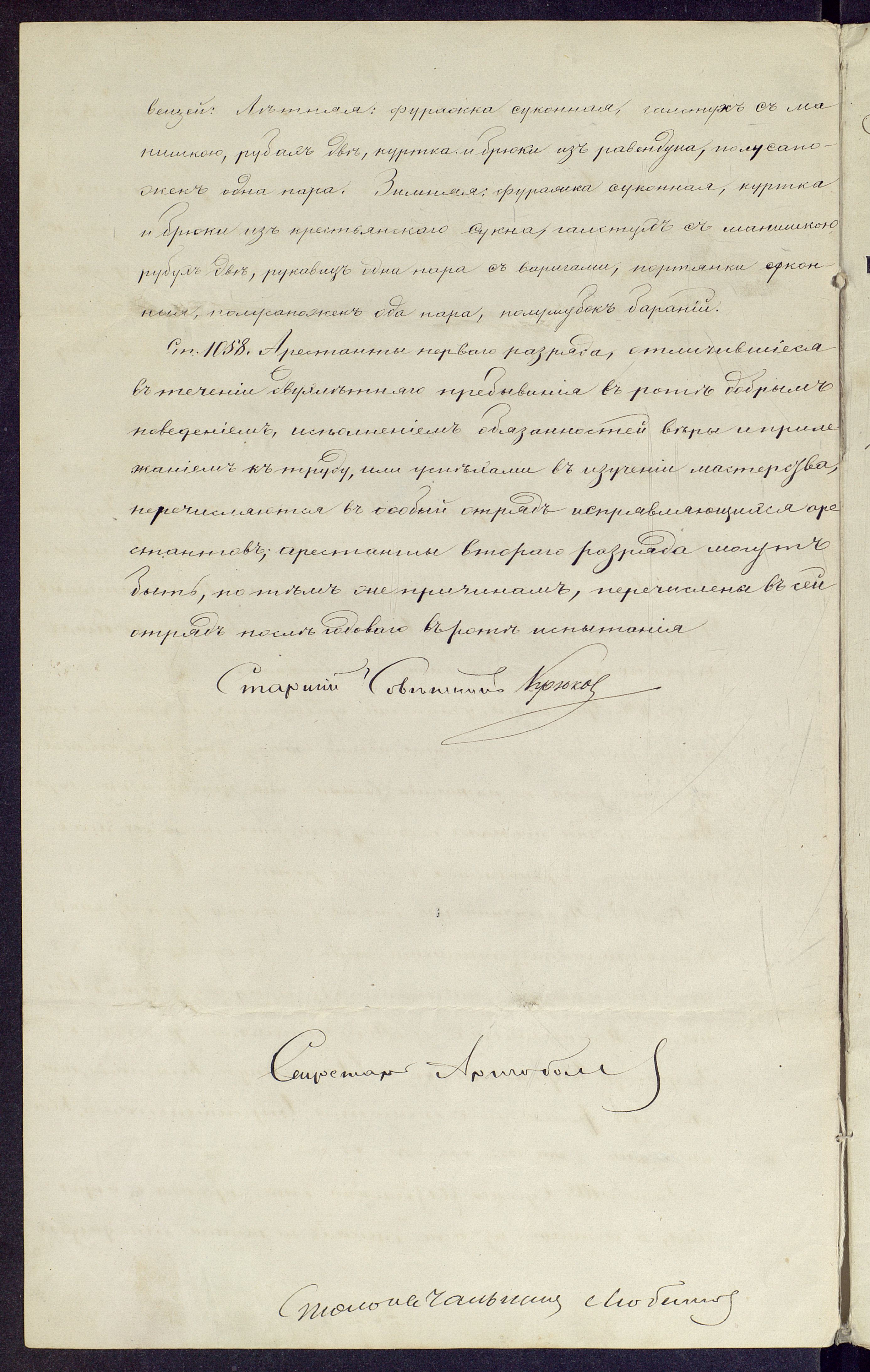 Впрочем, не всё так печально было при арестантских ротах. В частности, с начала 60-х годов XIX века начали улучшать вещевое снабжение, а именно: дешёвое крестьянское сукно стали заменять фабричным – более качественным и крепким. Летом заключённым были положены фуражка суконная, галстук с манишкой, две рубахи, куртка, брюки, одна пара полусапожек. Зимой к этому списку добавлялись две пары рукавиц, суконные портянки и бараний полушубок. Кстати, бывало, что именно в тюремной униформе осуждённые и выходили на свободу. «Одежду, в которой присылаются арестанты на срок свыше двух лет, продавать с публичного торга и вырученные деньги обращать в ротные экономические суммы», - говорилось в приказе заведующего арестантскими ротами.