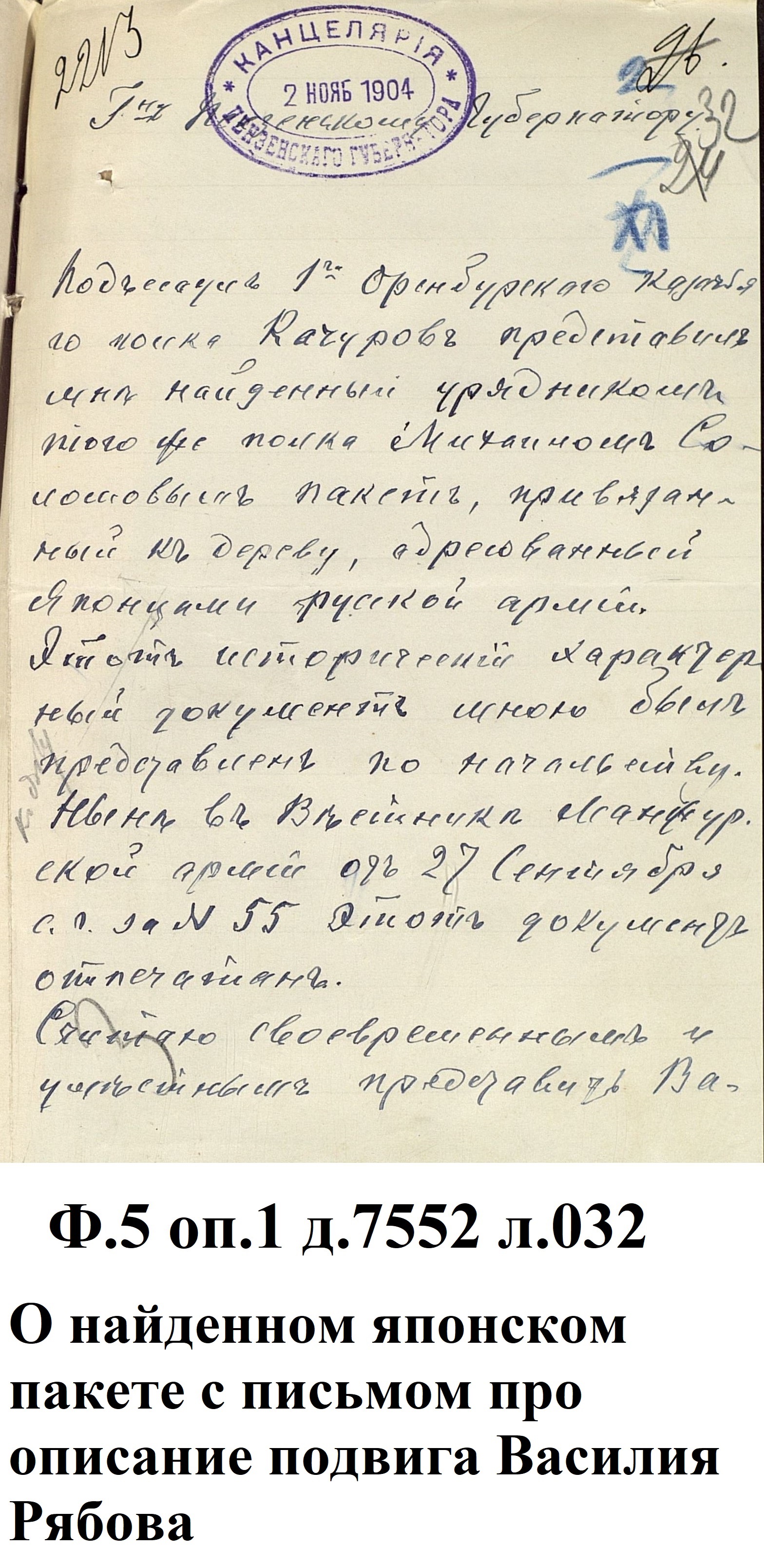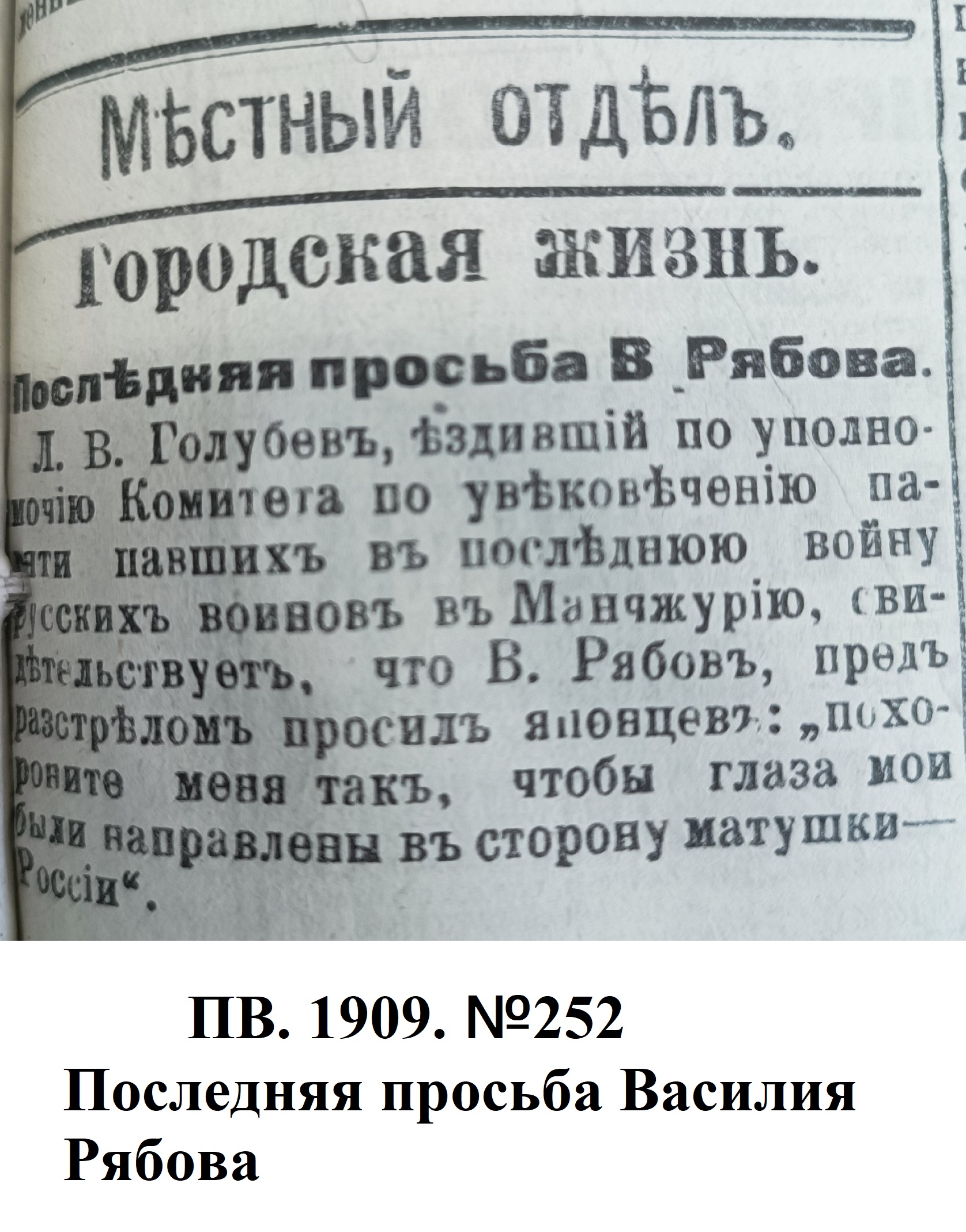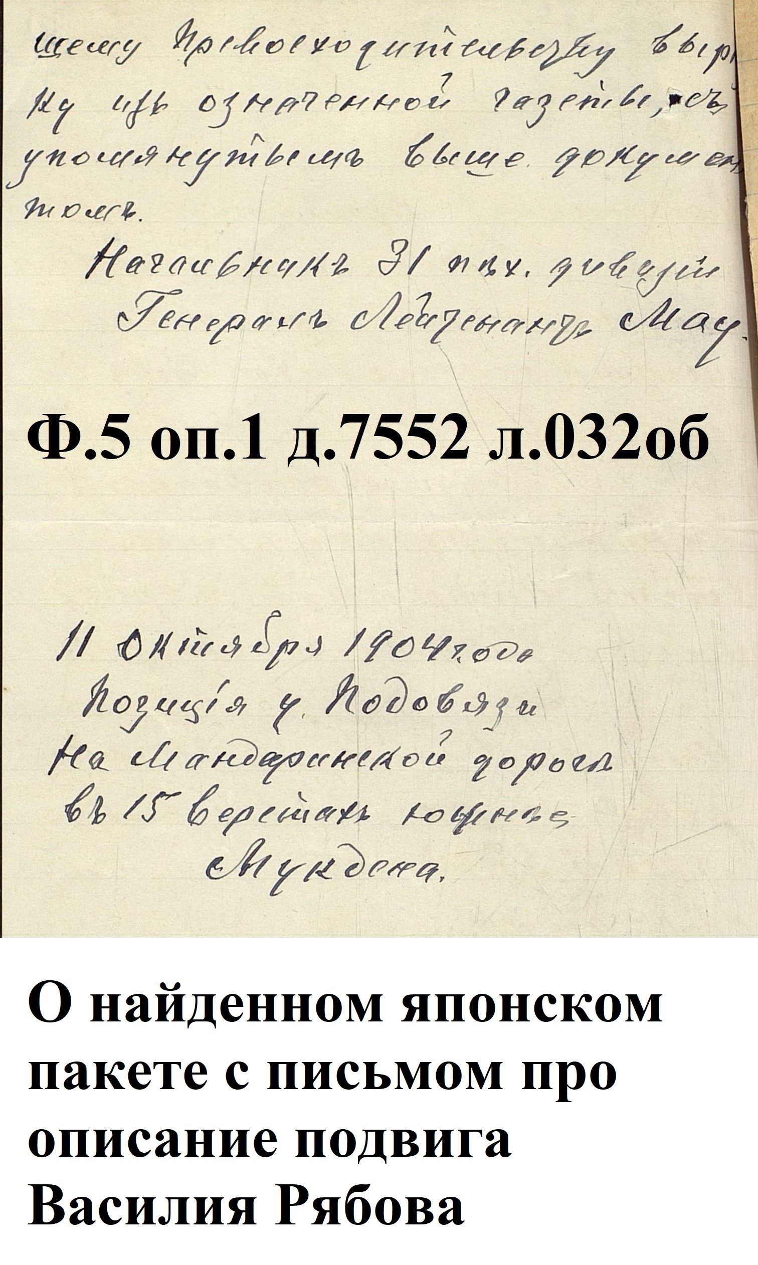 Мужество и хладнокровие русского солдата настолько впечатлило японцев, что они окрестили его русским самураем. А спустя сутки разъезд 1-го Оренбургского казачьего полка наткнулся на письмо за подписью капитана штаба японской армии, подброшенное на нейтральную территорию: «Солдат Василий Рябов, 33 года, из охотничьей команды 284-го Чембарского полка, одетый как китайский крестьянин, 17 сентября 1904 года был пойман нашими солдатами. Он по изъявленному им желанию был послан к нам для разведывания о местоположении и действиях нашей армии. После рассмотрения дела установленным порядком Рябов приговорён к смертной казни. Последняя была совершена ружейным выстрелом. Доводя это событие до сведения Русской армии, наша армия не может не высказать наших искренних пожеланий уважаемой армии, чтобы последняя воспитывала побольше таких прекрасных, достойных полного уважения воинов, как ознаменованный Рябов. Сочувствие к этому храброму, преисполненному чувства своего долга, примерному солдату достигло высшего предела».
