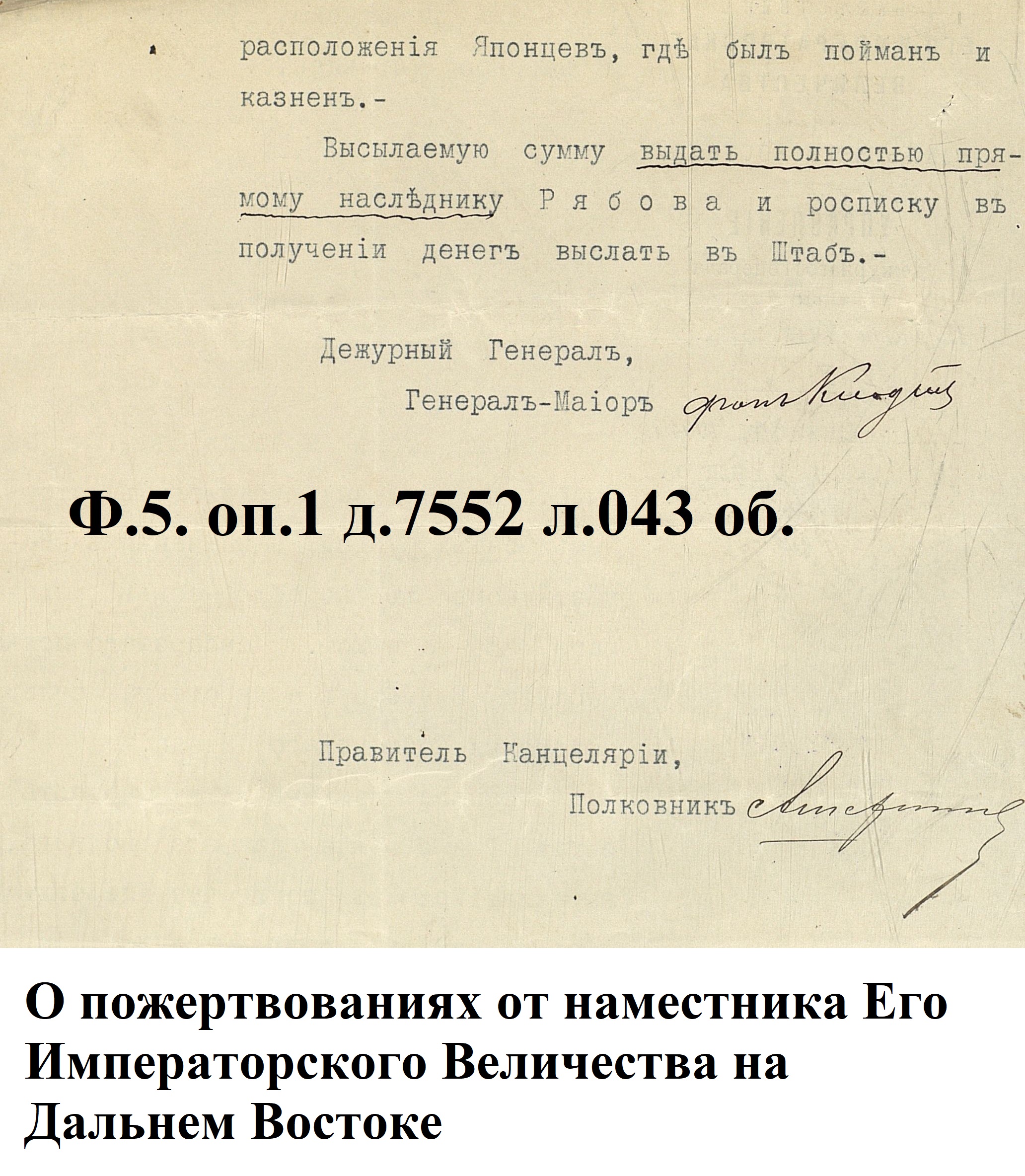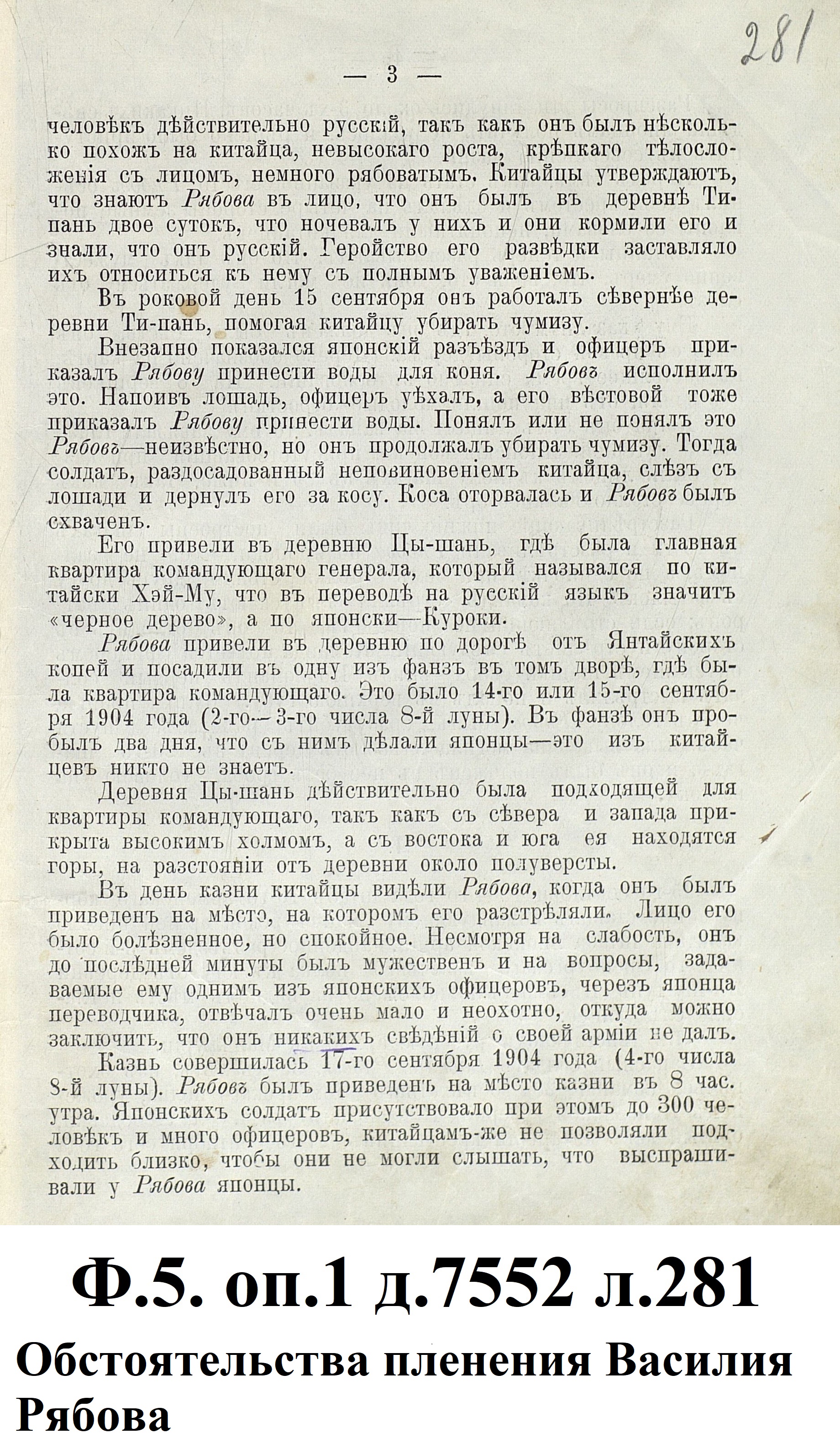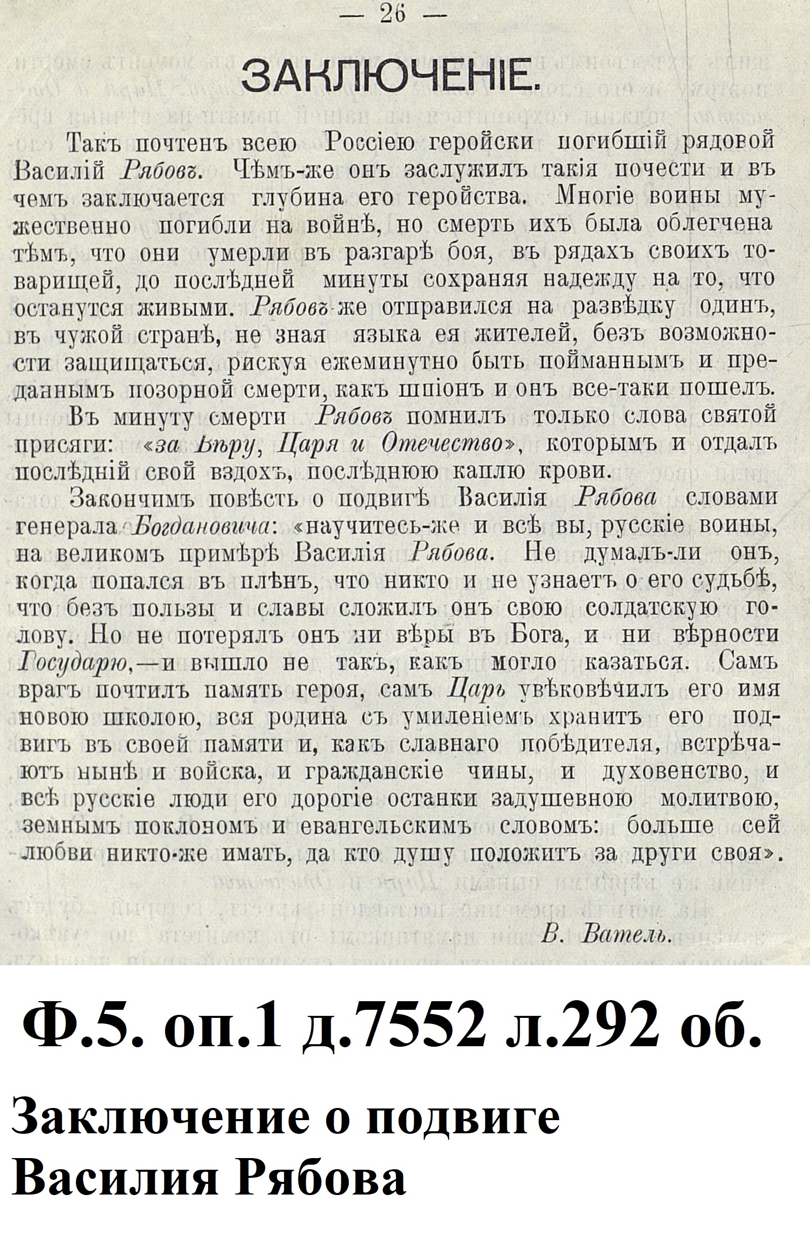Мужество и хладнокровие русского солдата настолько впечатлило японцев, что они окрестили его русским самураем. А спустя сутки разъезд 1-го Оренбургского казачьего полка наткнулся на письмо за подписью капитана штаба японской армии, подброшенное на нейтральную территорию: «Солдат Василий Рябов, 33 года, из охотничьей команды 284-го Чембарского полка, одетый как китайский крестьянин, 17 сентября 1904 года был пойман нашими солдатами. Он по изъявленному им желанию был послан к нам для разведывания о местоположении и действиях нашей армии. После рассмотрения дела установленным порядком Рябов приговорён к смертной казни. Последняя была совершена ружейным выстрелом. Доводя это событие до сведения Русской армии, наша армия не может не высказать наших искренних пожеланий уважаемой армии, чтобы последняя воспитывала побольше таких прекрасных, достойных полного уважения воинов, как ознаменованный Рябов. Сочувствие к этому храброму, преисполненному чувства своего долга, примерному солдату достигло высшего предела».