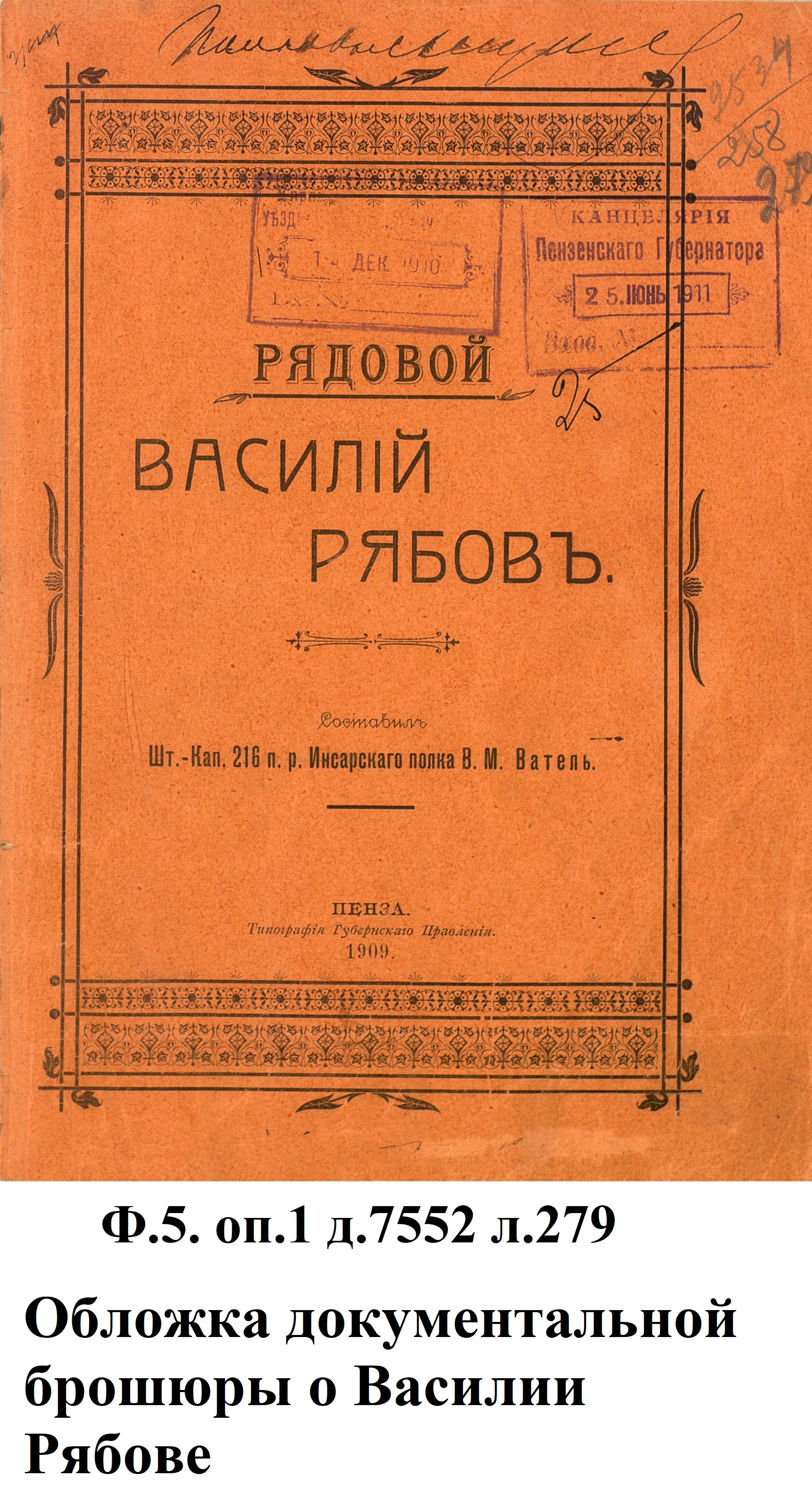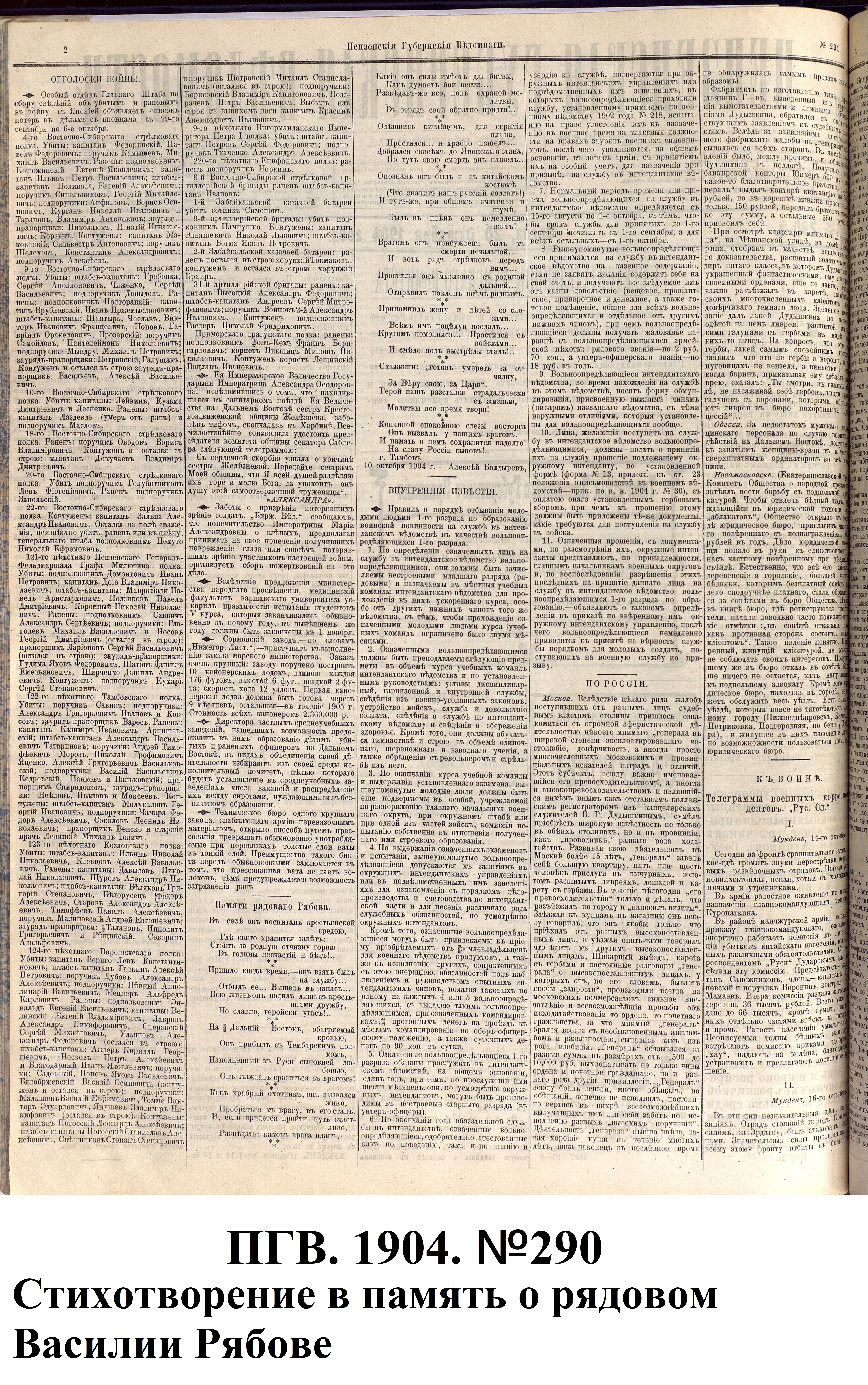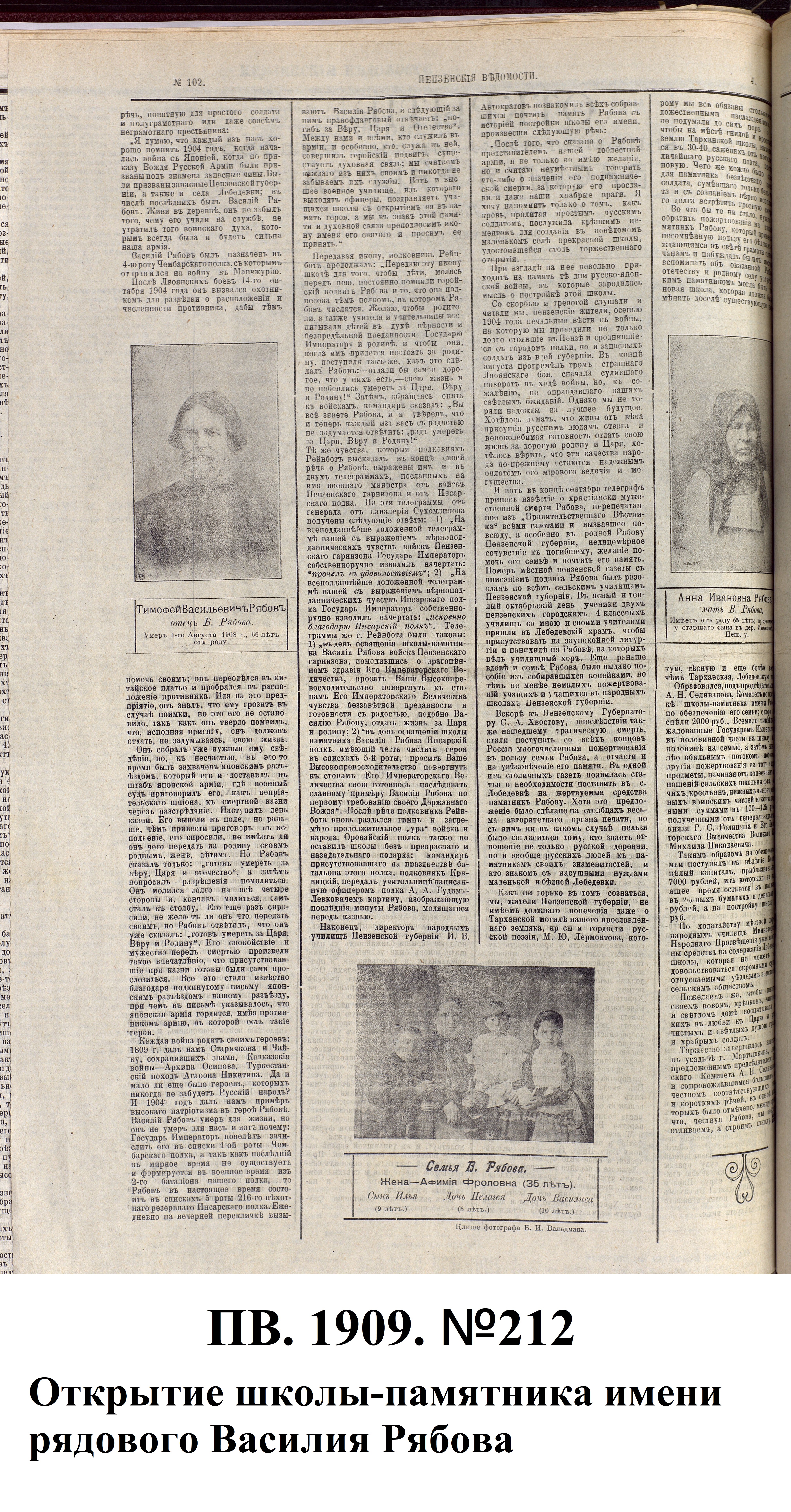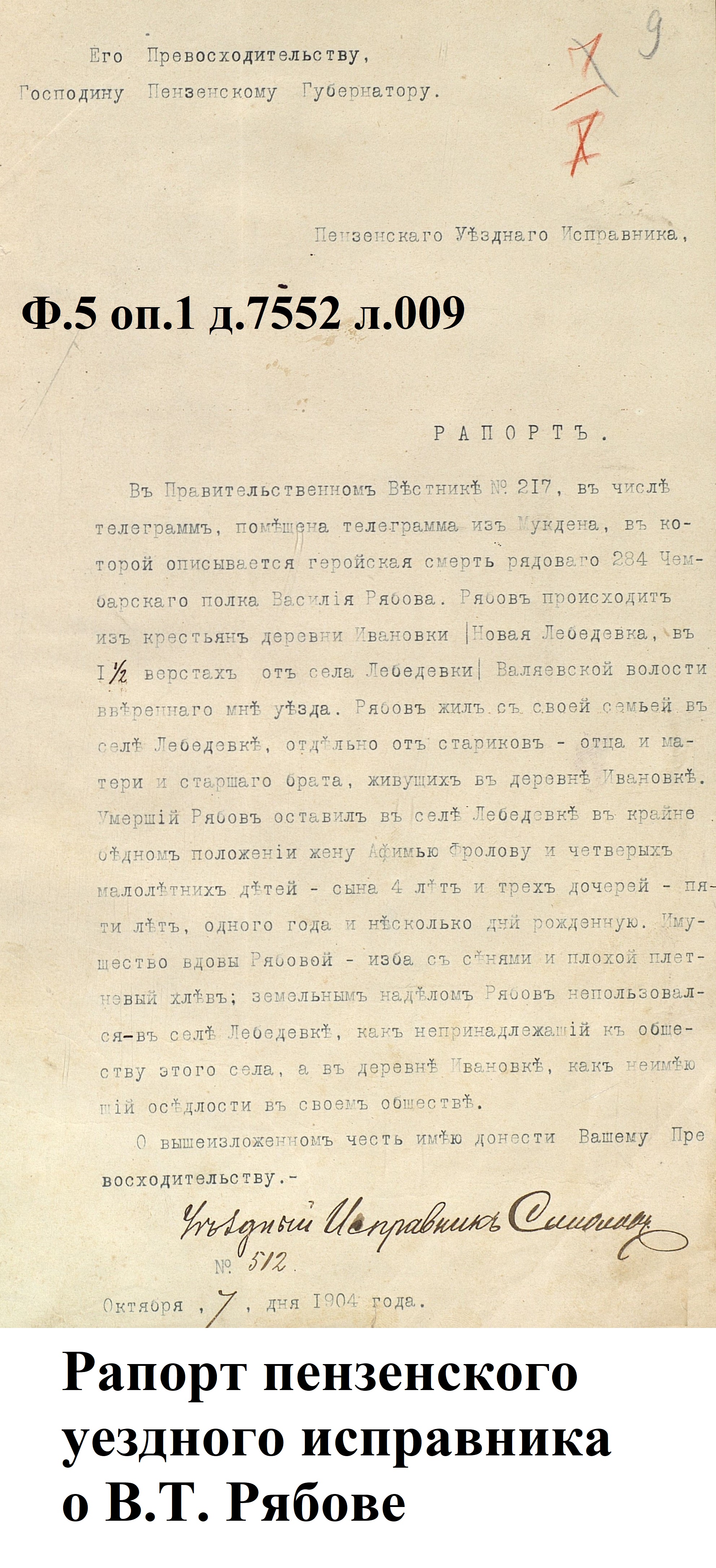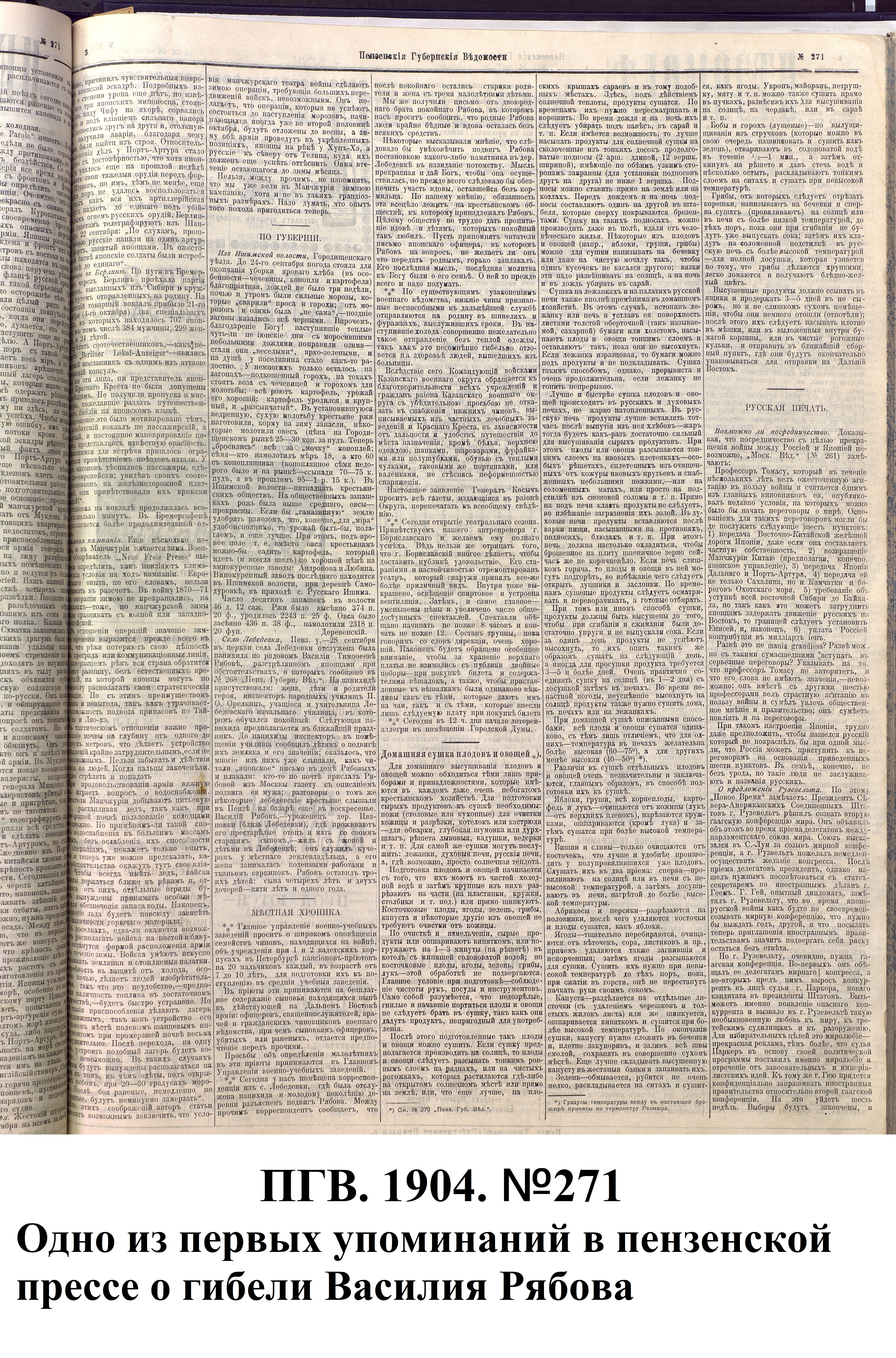 Храм Христа Спасителя в Первопрестольной считался главным воинским собором России. Долгое время в нём хранились мраморные плиты с высеченными на них именами генералов и офицеров, павших за царя и Отечество в различных войнах. Но была и одна памятная доска, посвящённая нижним чинам, всего с семнадцатью фамилиями. Среди них пензенец Василий Тимофеевич Рябов – герой Русско-японской войны, которая началась в 1904 году.