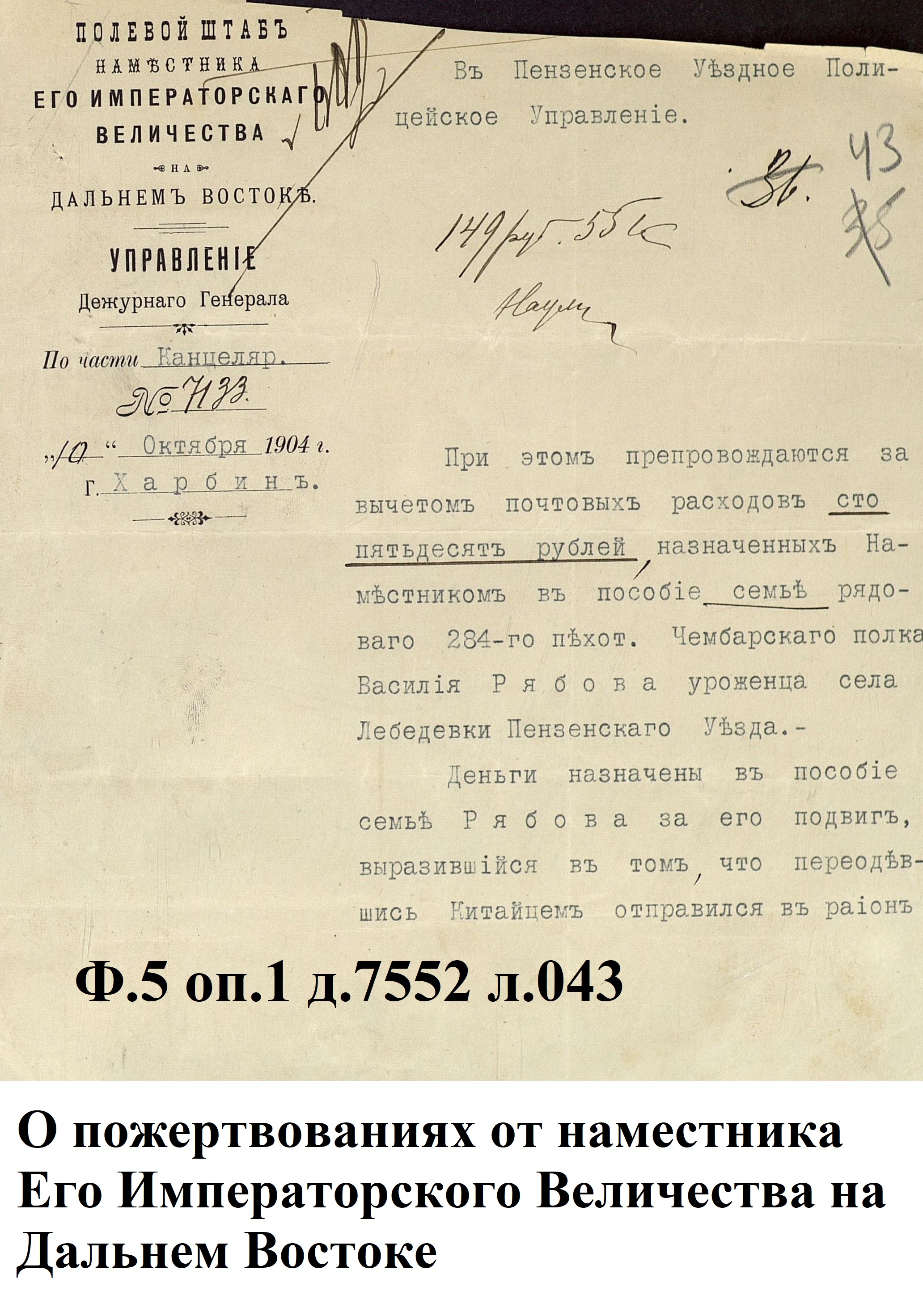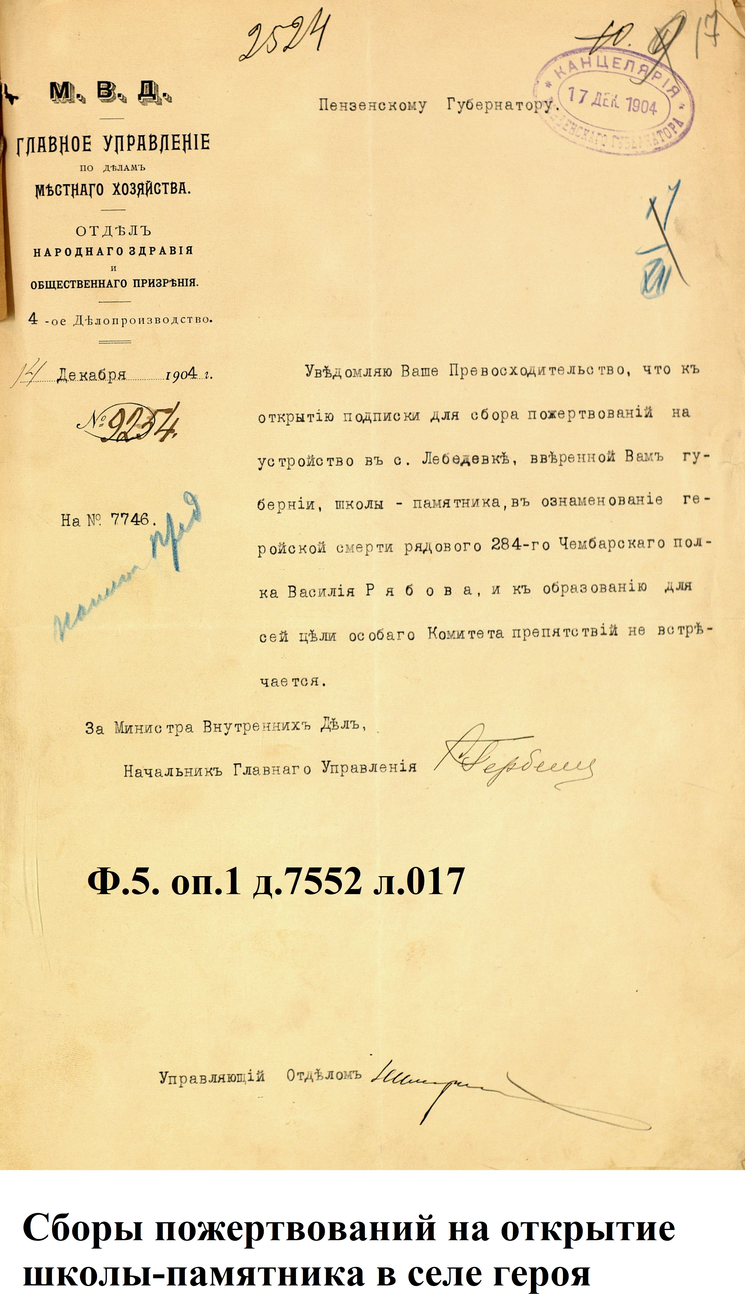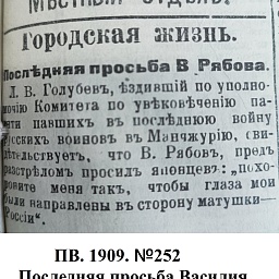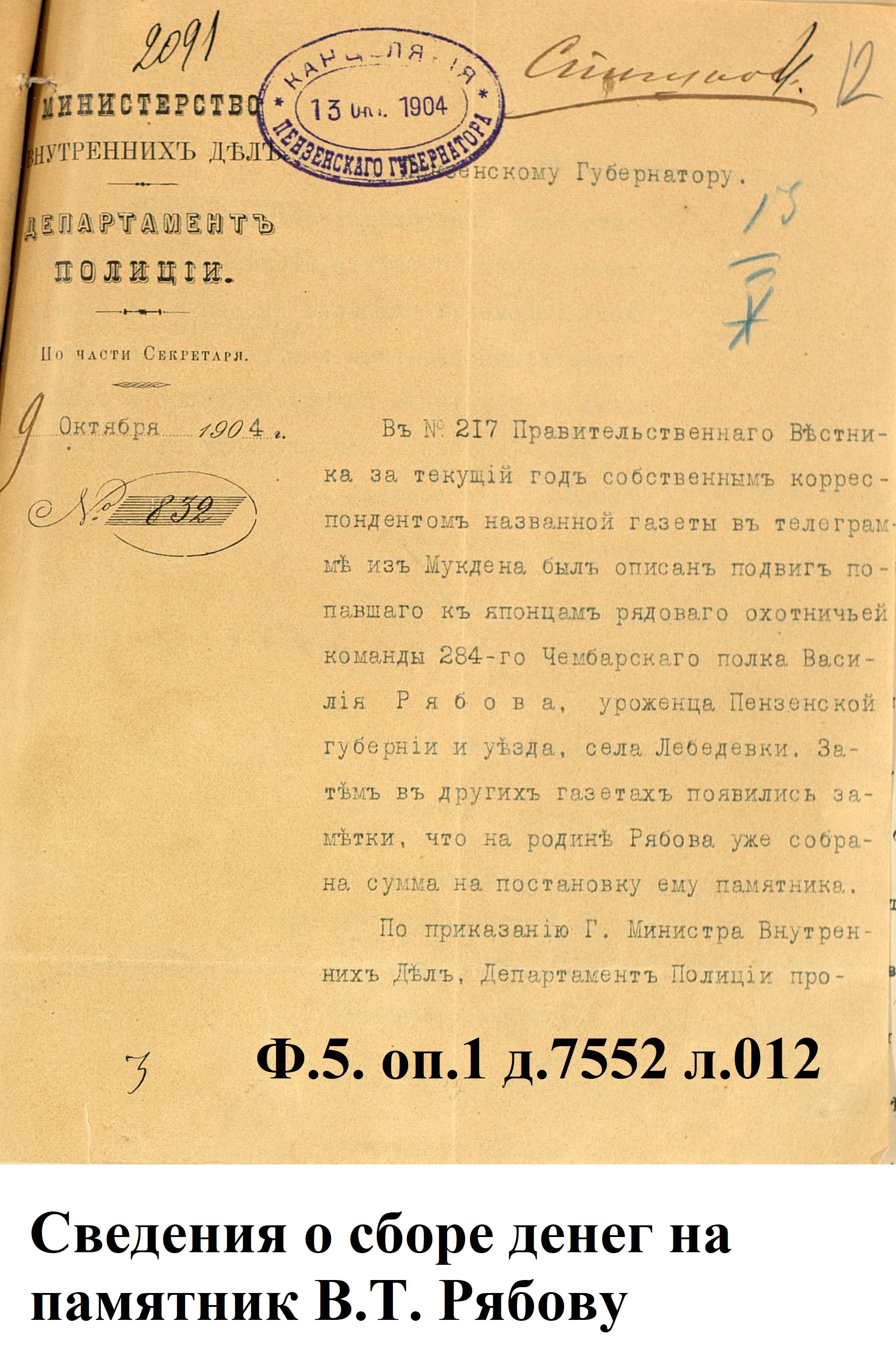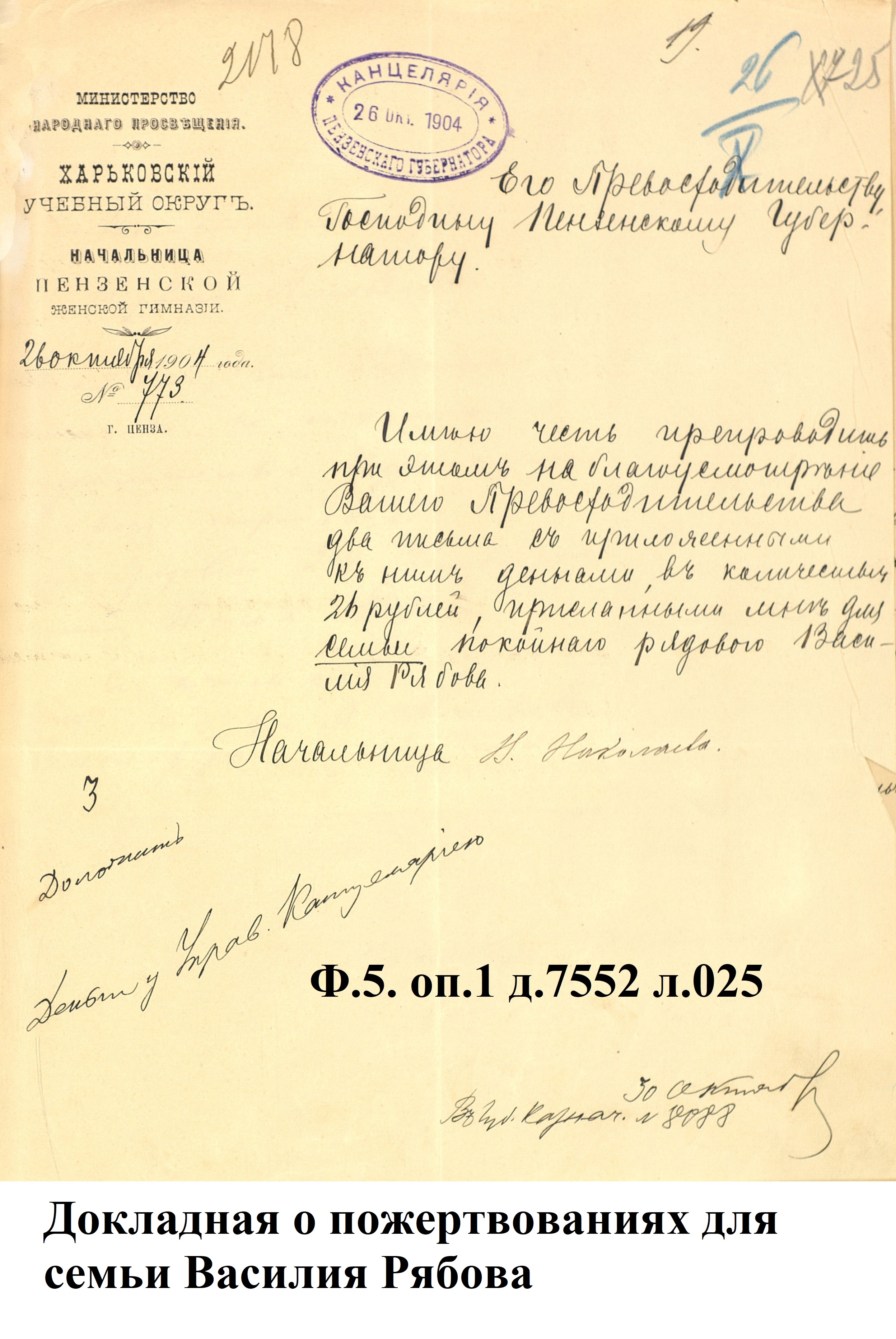 Храм Христа Спасителя в Первопрестольной считался главным воинским собором России. Долгое время в нём хранились мраморные плиты с высеченными на них именами генералов и офицеров, павших за царя и Отечество в различных войнах. Но была и одна памятная доска, посвящённая нижним чинам, всего с семнадцатью фамилиями. Среди них пензенец Василий Тимофеевич Рябов – герой Русско-японской войны, которая началась в 1904 году.