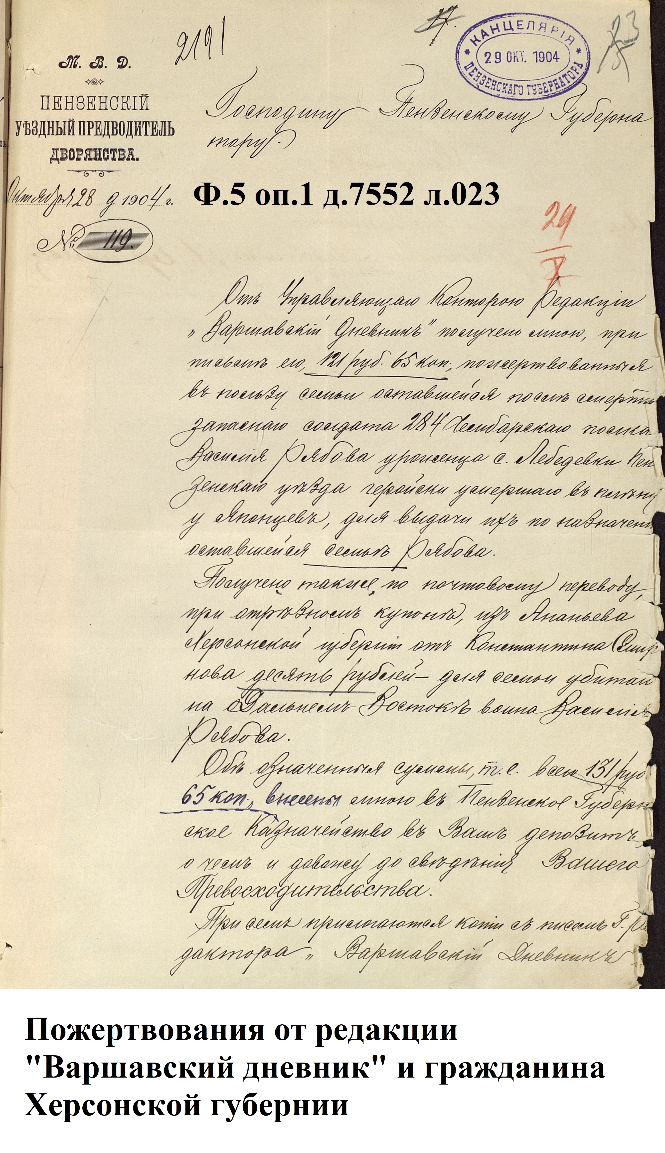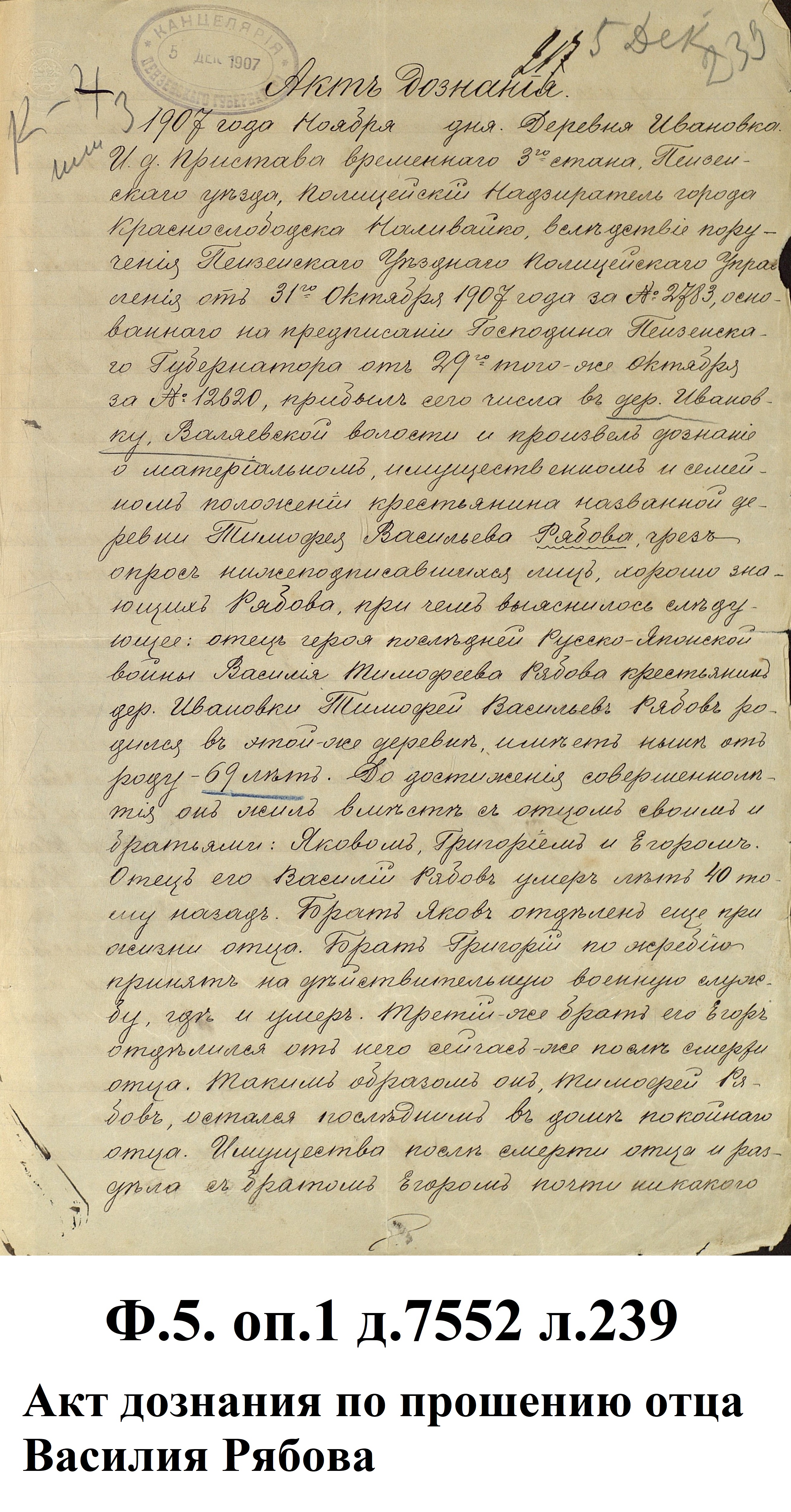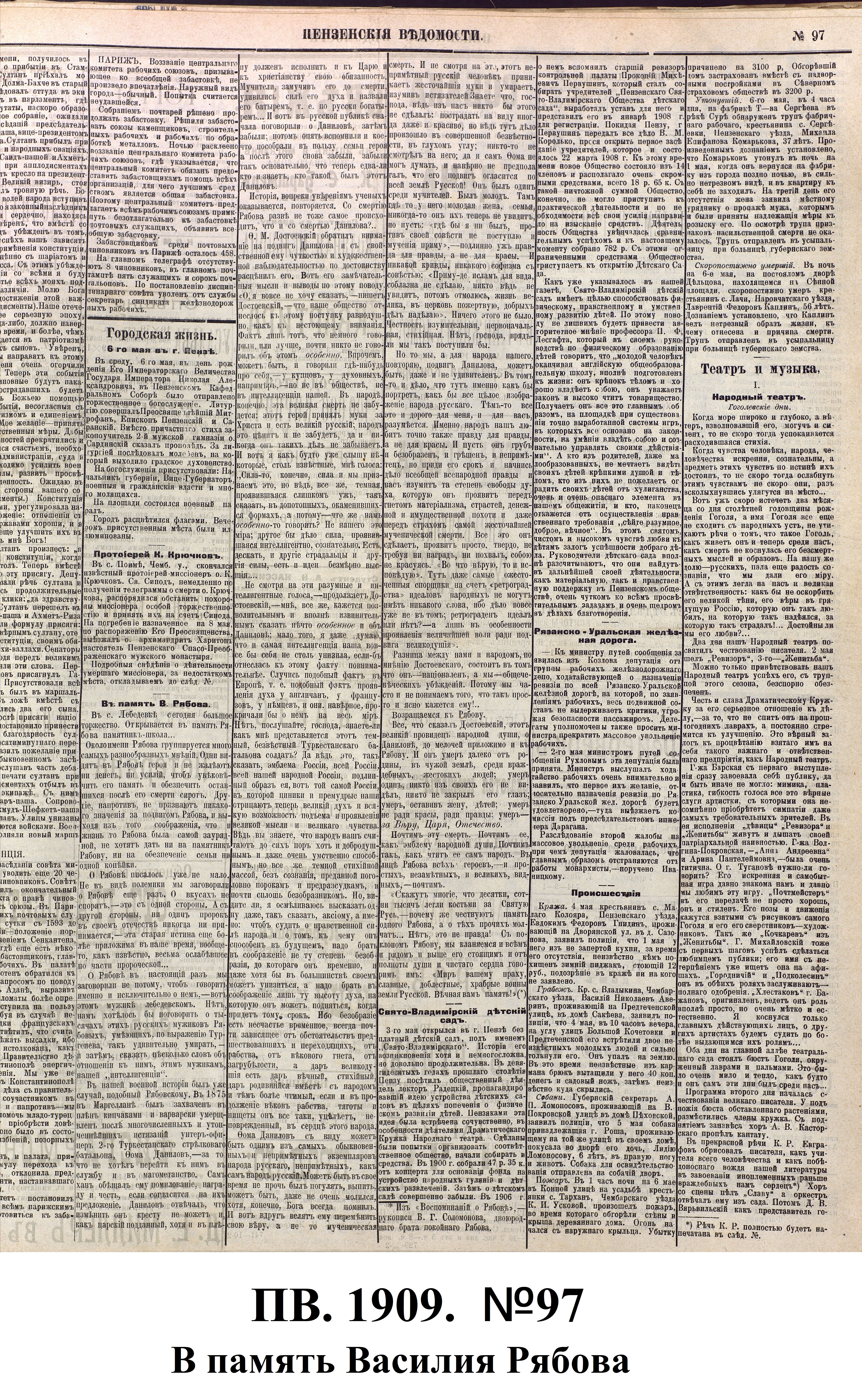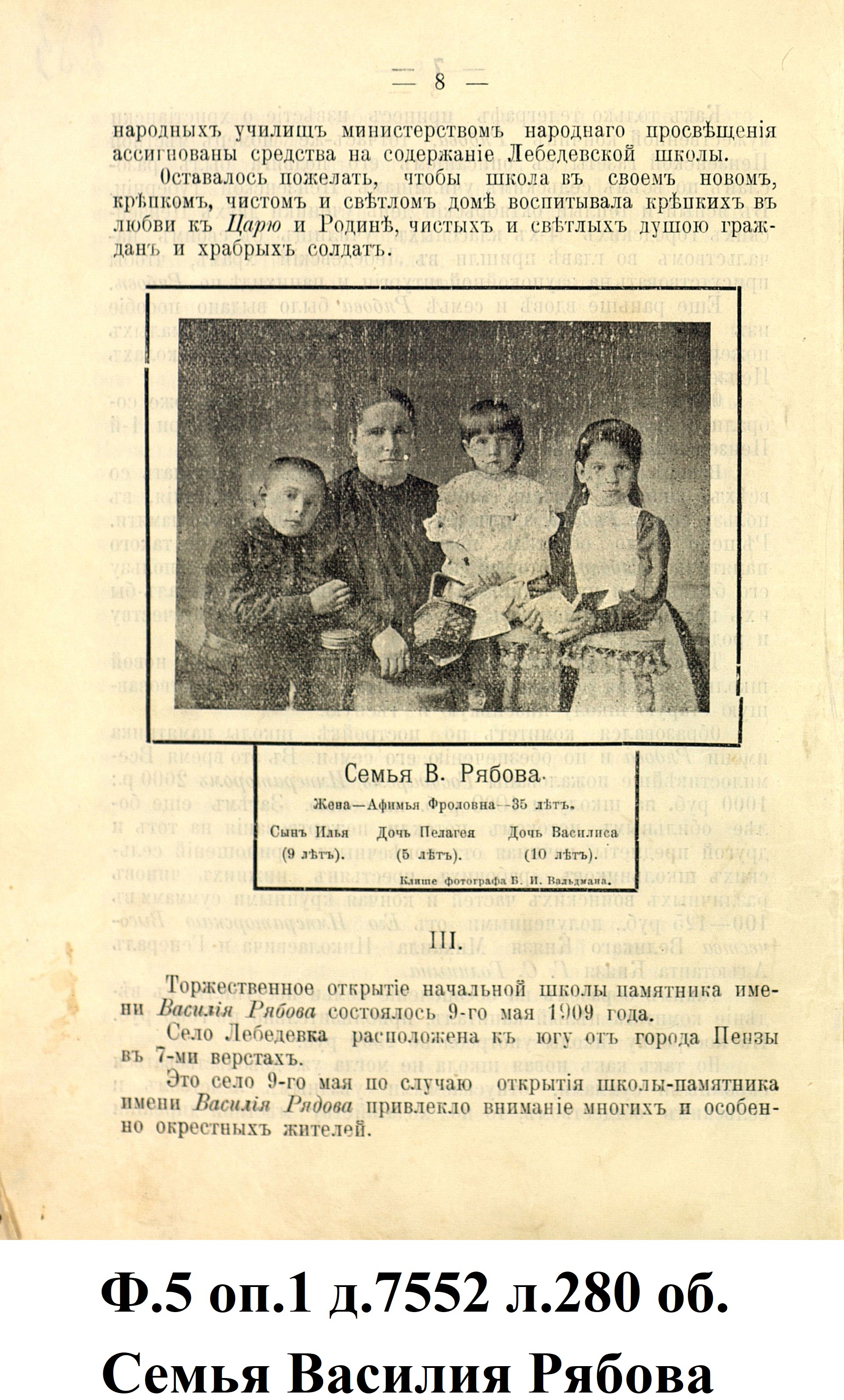 Храм Христа Спасителя в Первопрестольной считался главным воинским собором России. Долгое время в нём хранились мраморные плиты с высеченными на них именами генералов и офицеров, павших за царя и Отечество в различных войнах. Но была и одна памятная доска, посвящённая нижним чинам, всего с семнадцатью фамилиями. Среди них пензенец Василий Тимофеевич Рябов – герой Русско-японской войны, которая началась в 1904 году.