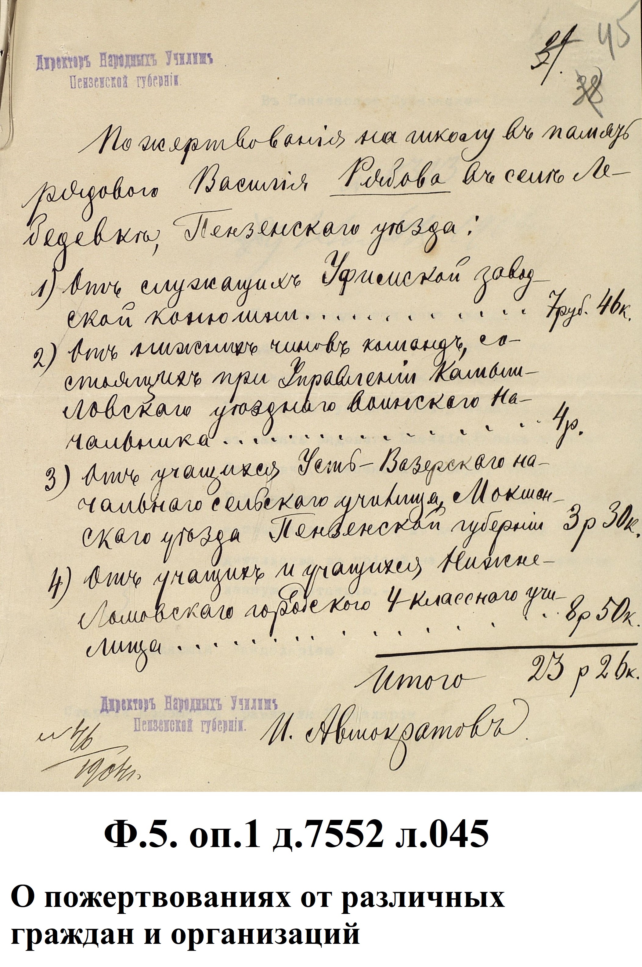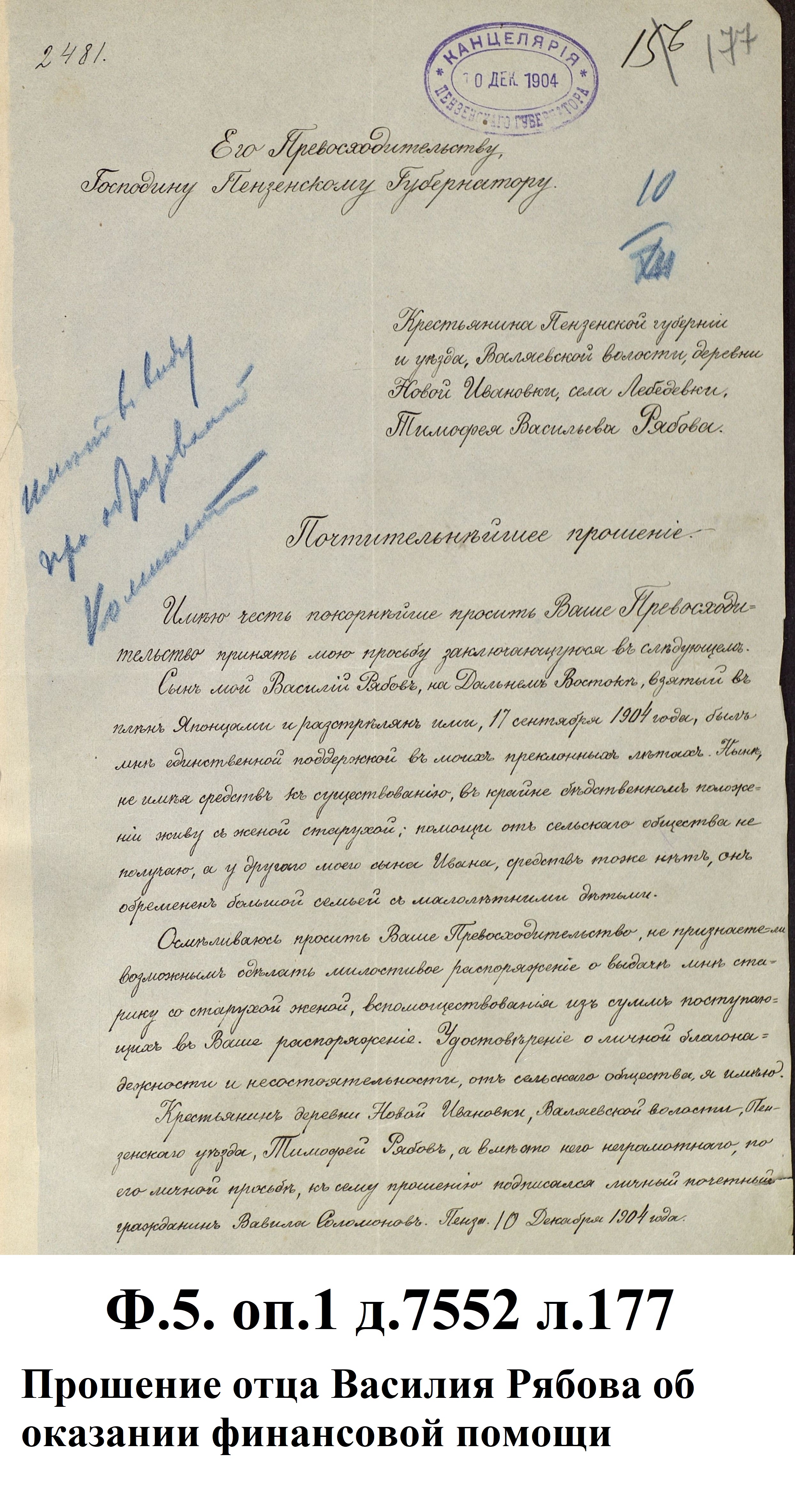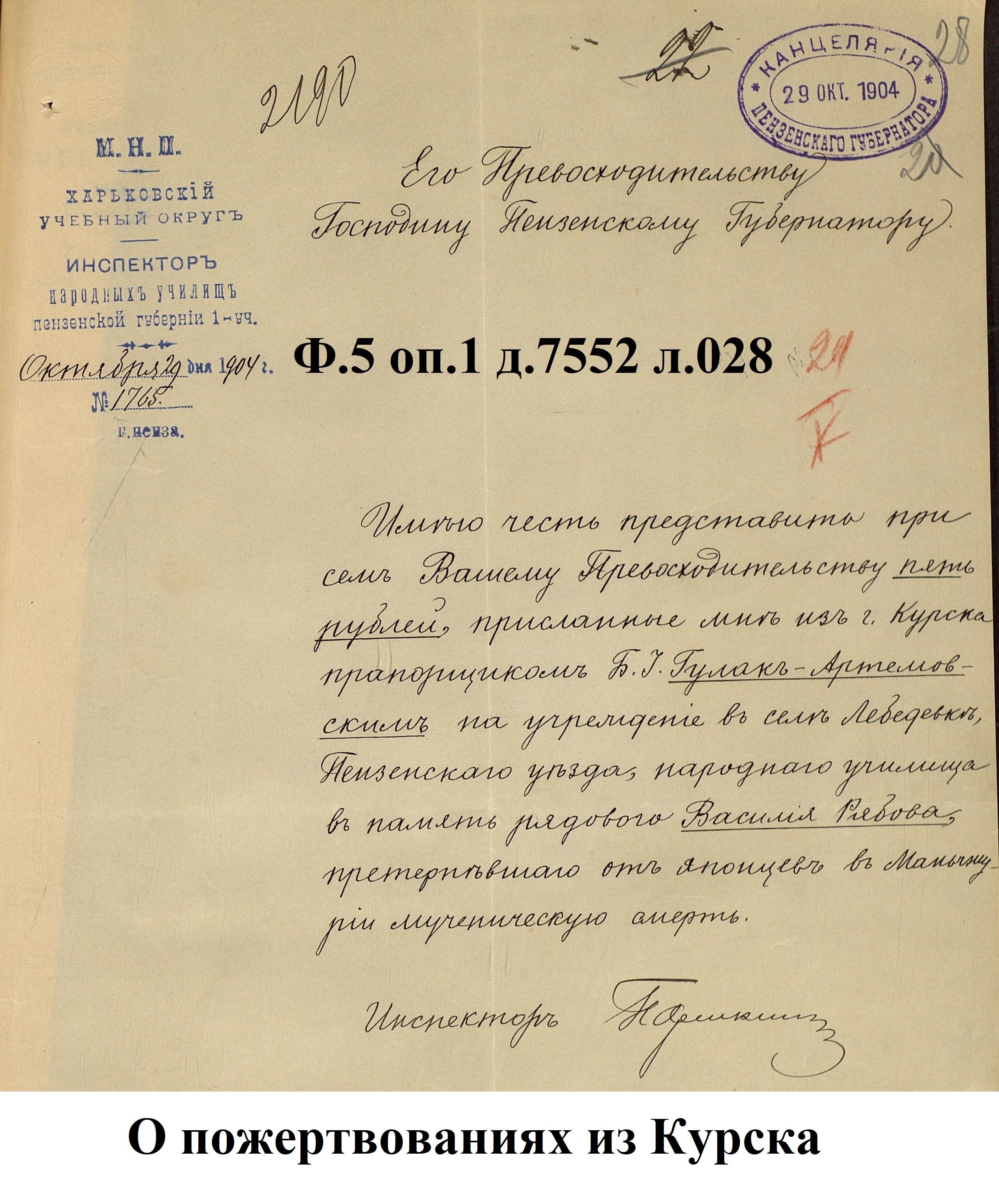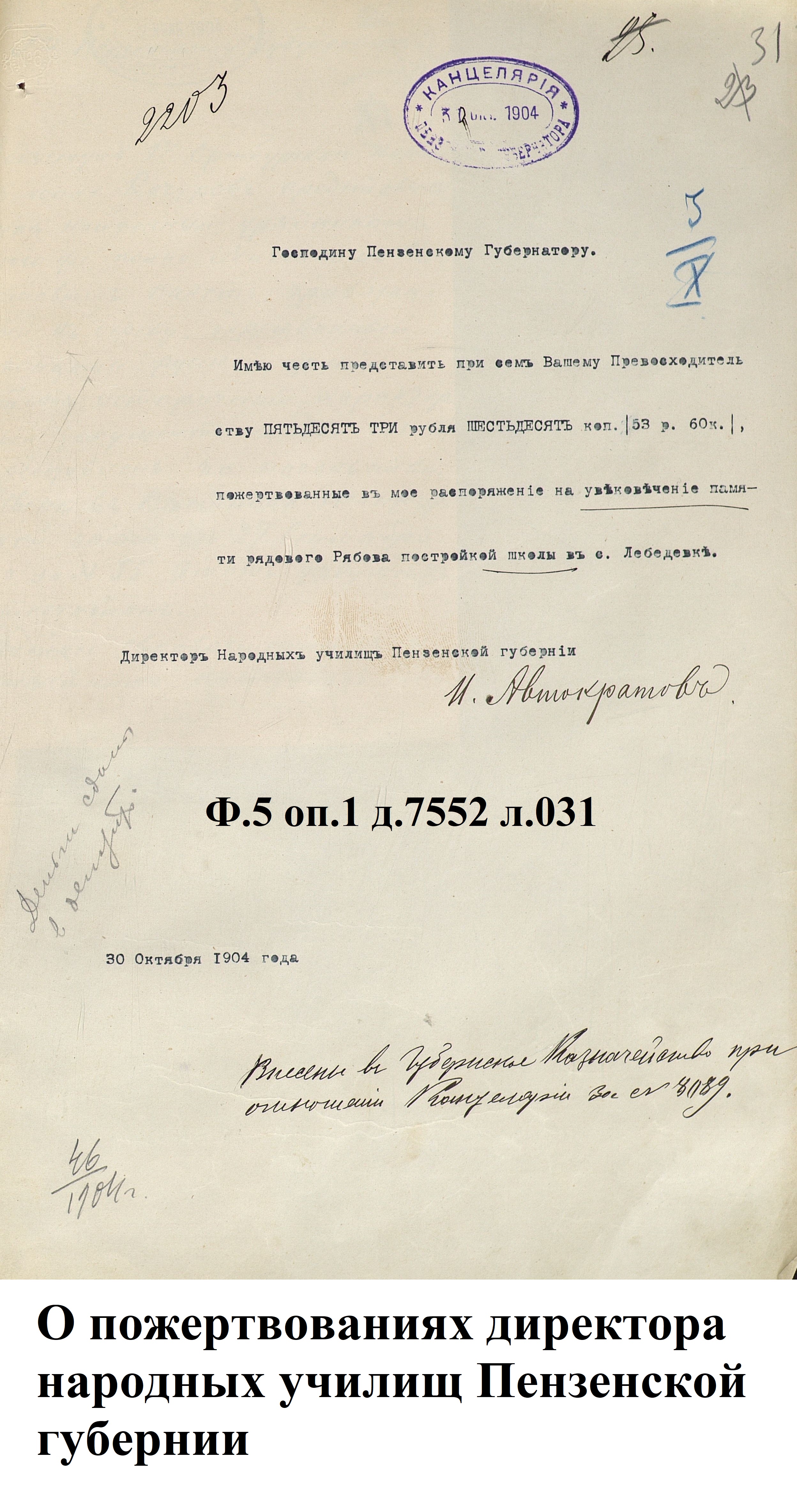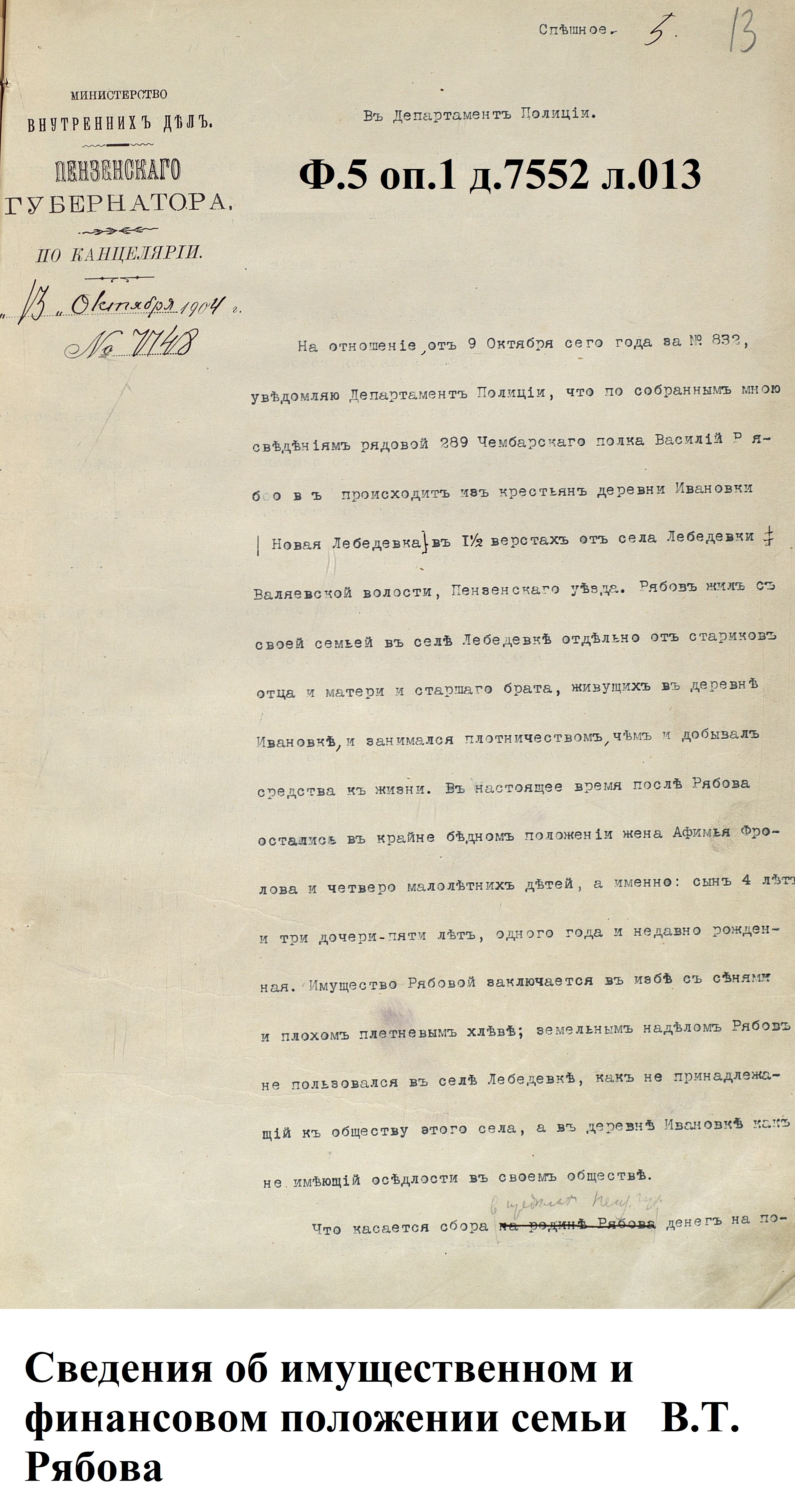 Храм Христа Спасителя в Первопрестольной считался главным воинским собором России. Долгое время в нём хранились мраморные плиты с высеченными на них именами генералов и офицеров, павших за царя и Отечество в различных войнах. Но была и одна памятная доска, посвящённая нижним чинам, всего с семнадцатью фамилиями. Среди них пензенец Василий Тимофеевич Рябов – герой Русско-японской войны, которая началась в 1904 году.