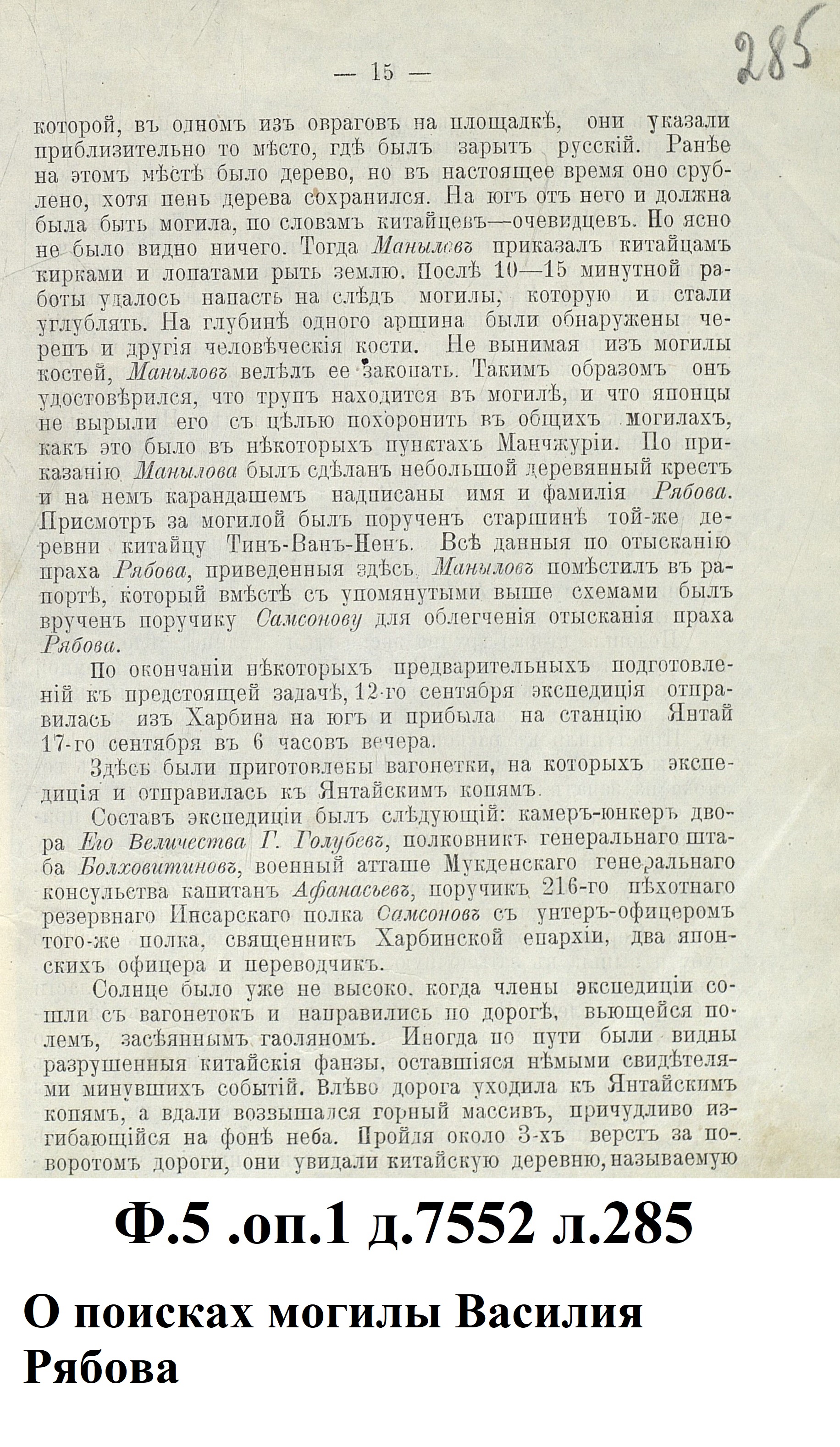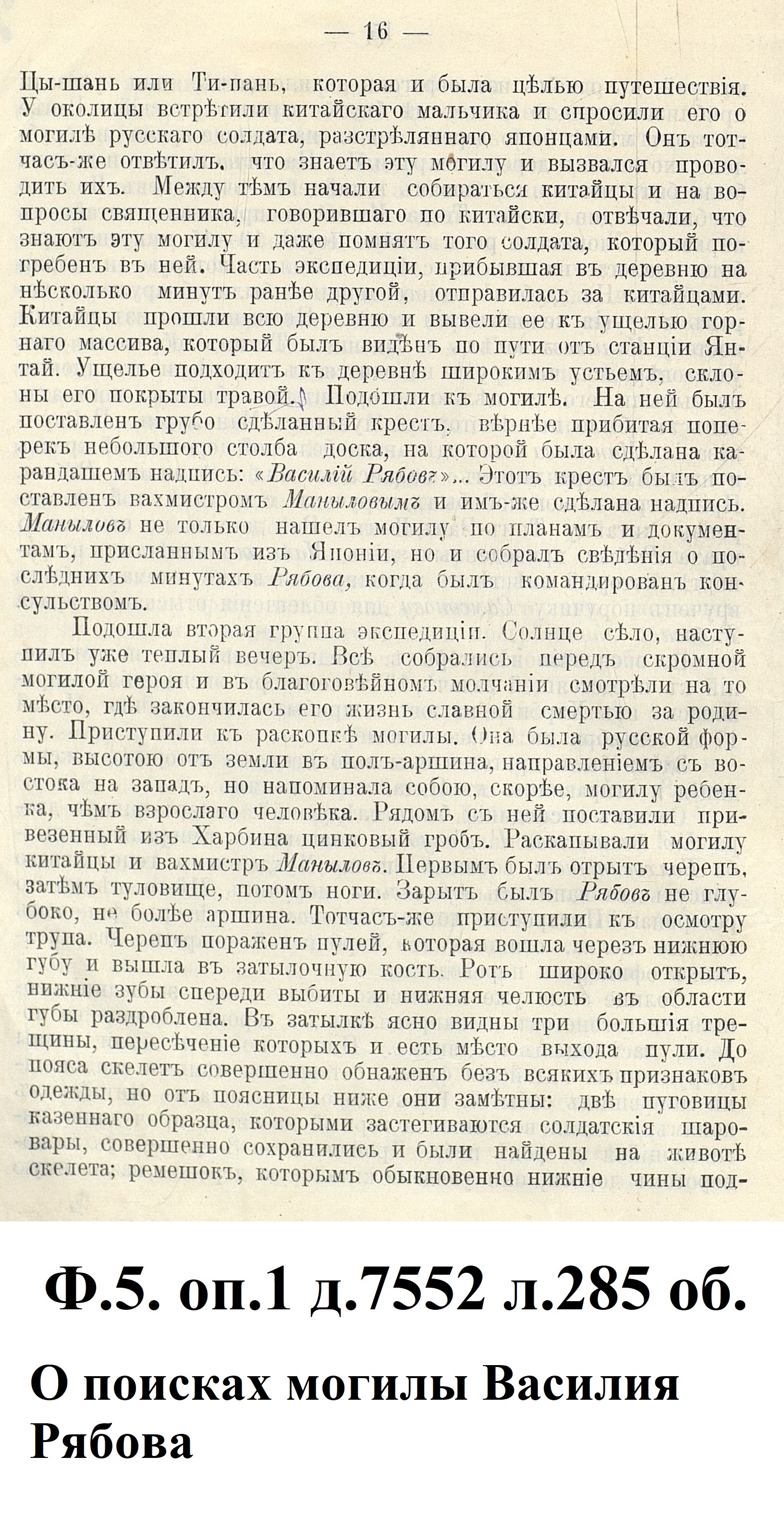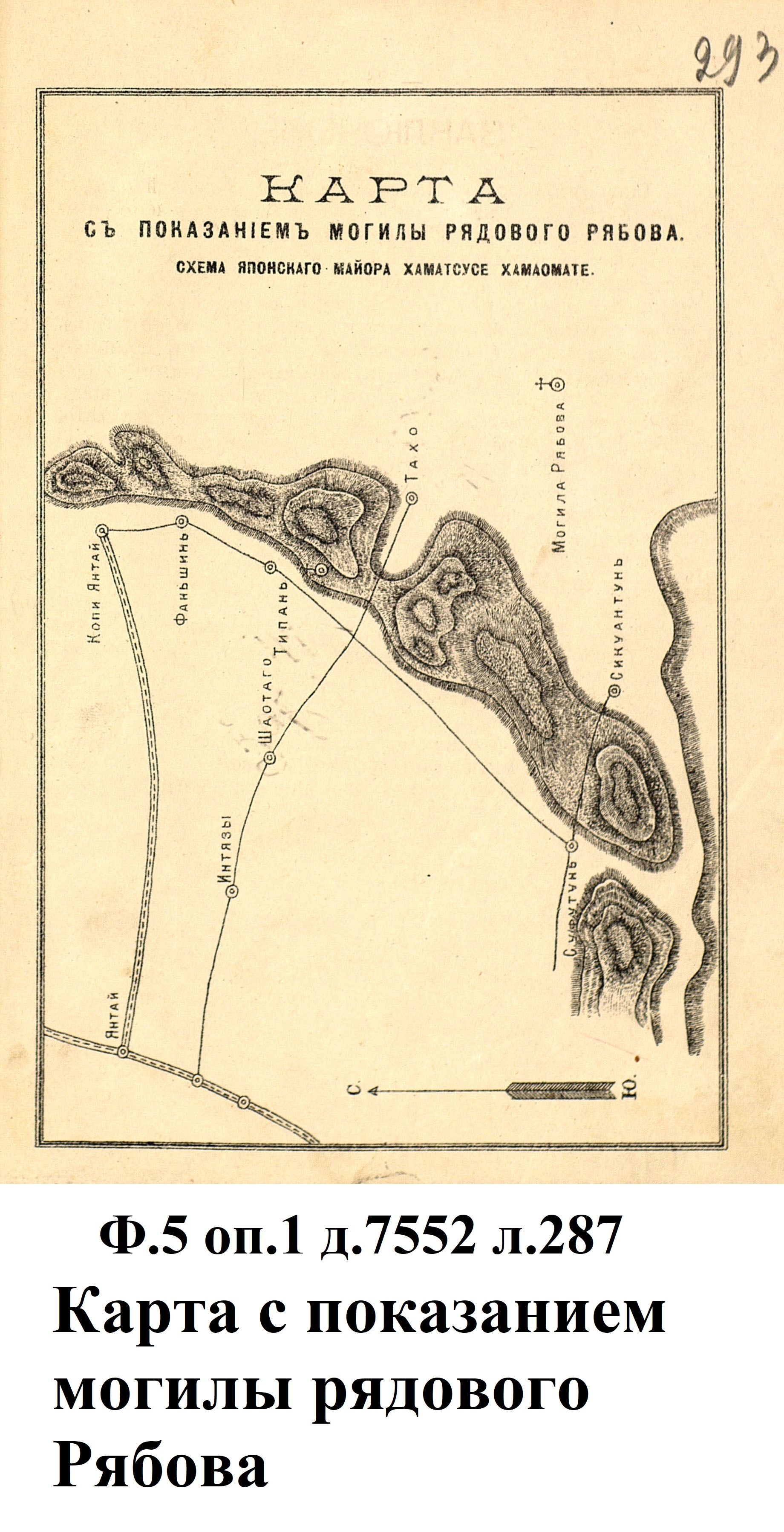 Однако, в тоже время об эксгумации и перезахоронении останков пензенского героя практически ничего неизвестно. Но, в нашем Госархиве Пензенской области имеются уникальные документы, проливающие свет на поиски могилы Василия Рябова в далёком Китае. Первая поисковая экспедиция была отправлена в Маньчжурию в июле 1909 года. В её составе находились ветераны Инсарского полка, сформированного на территории Пензенской губернии. Военнослужащим удалось найти офицера японской армии Хаматсусе Хамаомате, который и командовал расстрелом нашего земляка. На удивление русских офицеров, он согласился показать точное место казни и захоронения Рябова. Японский майор начертил карты и назвал некоторые характерные особенности местности упокоения героя – косогор и большое раскидистое дерево.