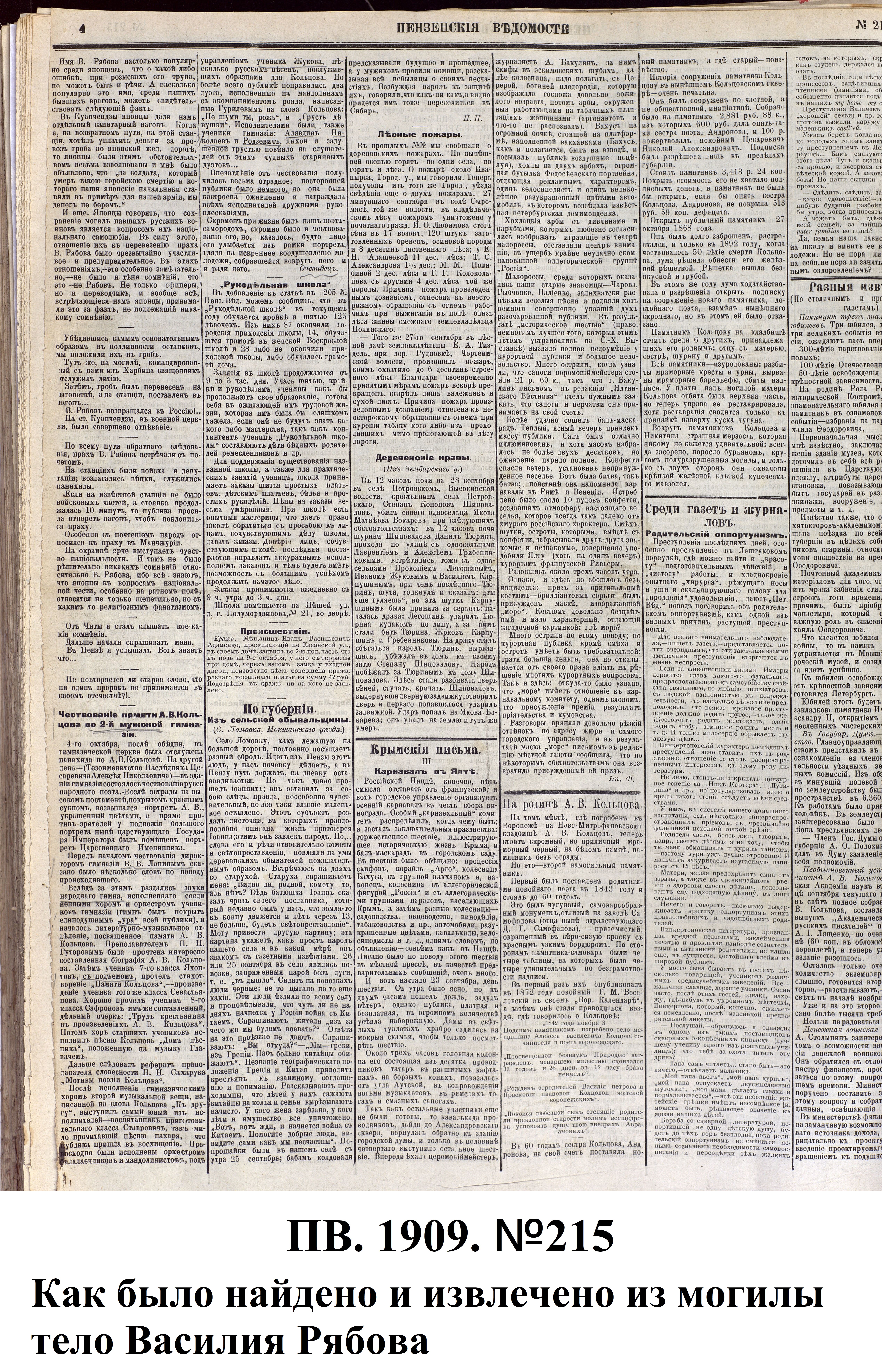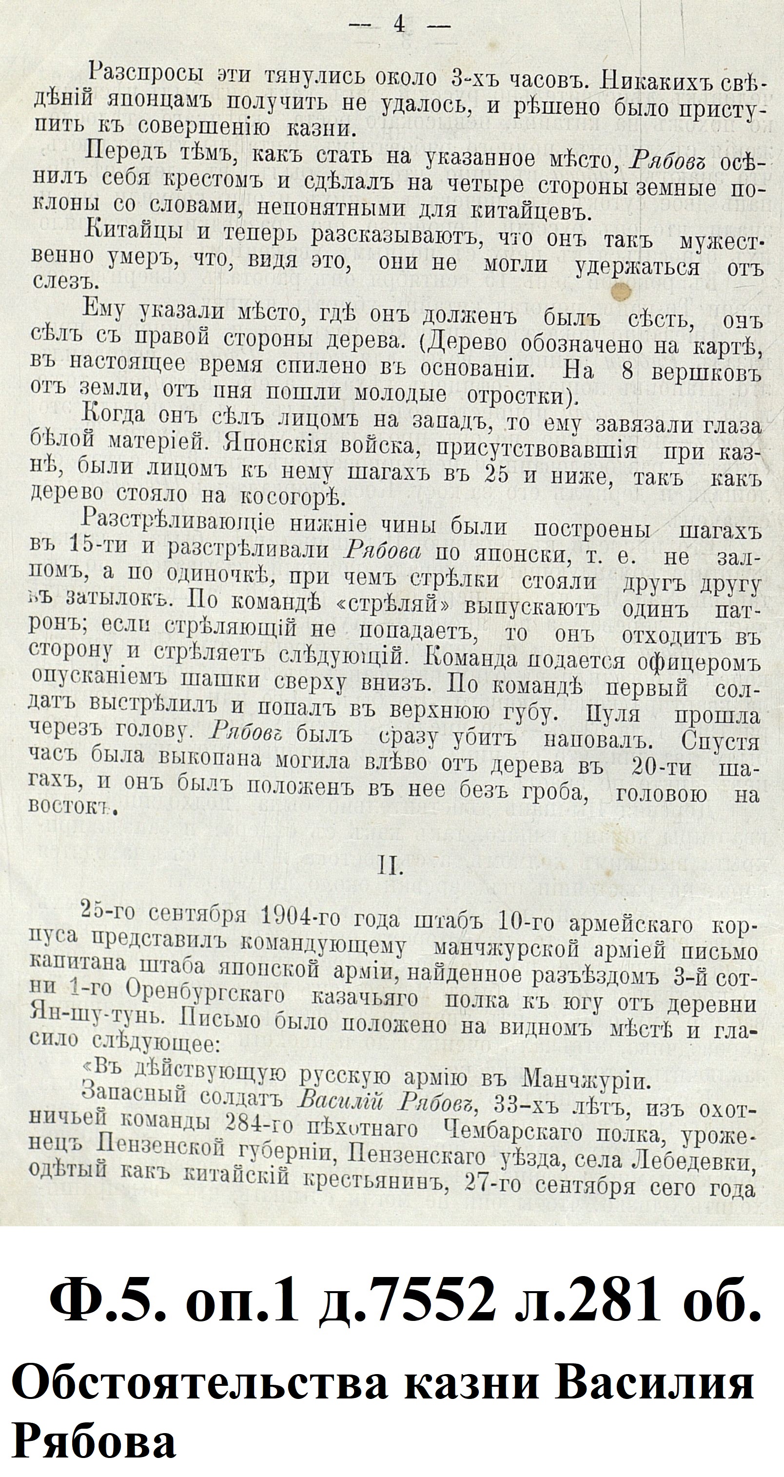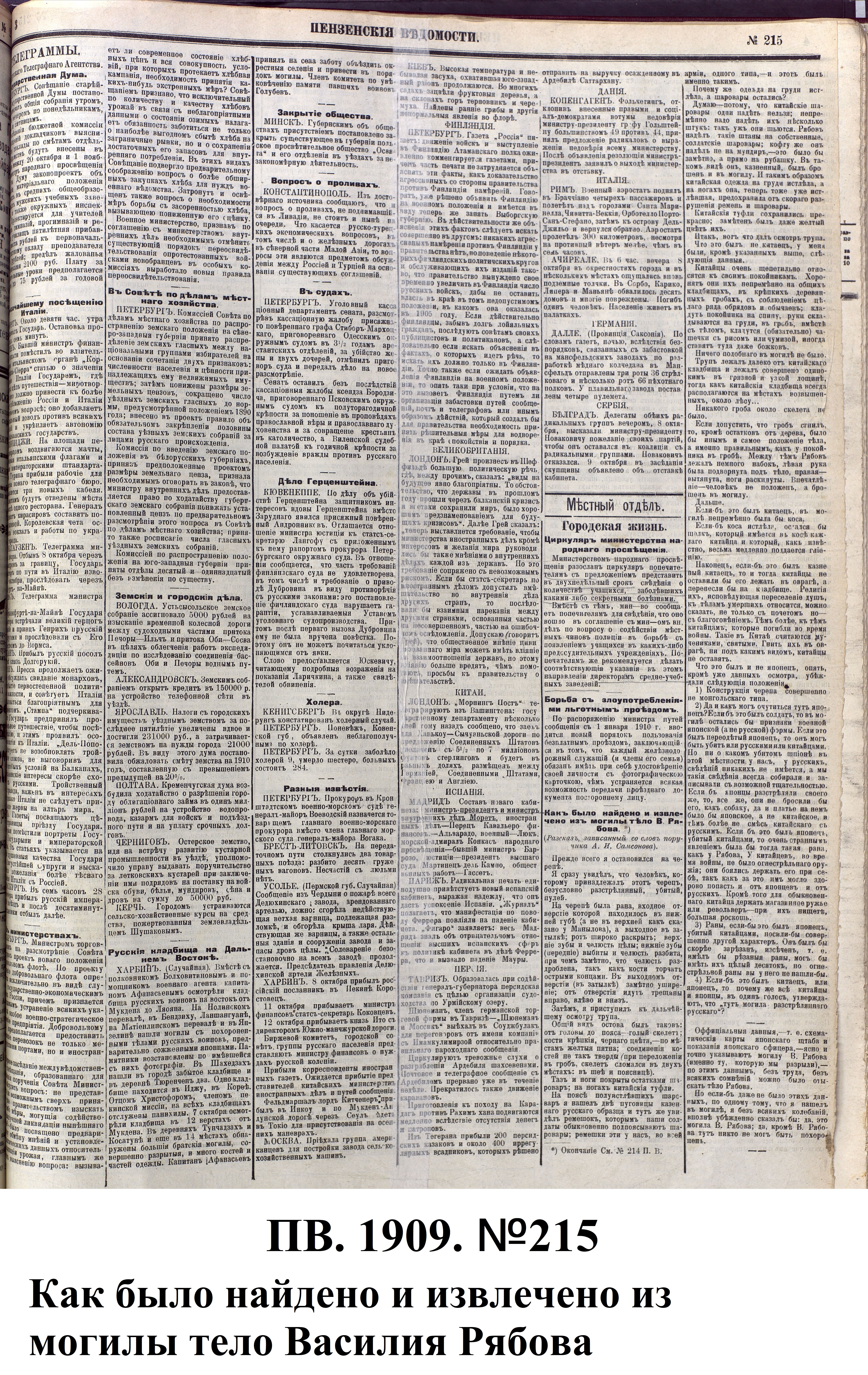 Однако, в тоже время об эксгумации и перезахоронении останков пензенского героя практически ничего неизвестно. Но, в нашем Госархиве Пензенской области имеются уникальные документы, проливающие свет на поиски могилы Василия Рябова в далёком Китае. Первая поисковая экспедиция была отправлена в Маньчжурию в июле 1909 года. В её составе находились ветераны Инсарского полка, сформированного на территории Пензенской губернии. Военнослужащим удалось найти офицера японской армии Хаматсусе Хамаомате, который и командовал расстрелом нашего земляка. На удивление русских офицеров, он согласился показать точное место казни и захоронения Рябова. Японский майор начертил карты и назвал некоторые характерные особенности местности упокоения героя – косогор и большое раскидистое дерево.