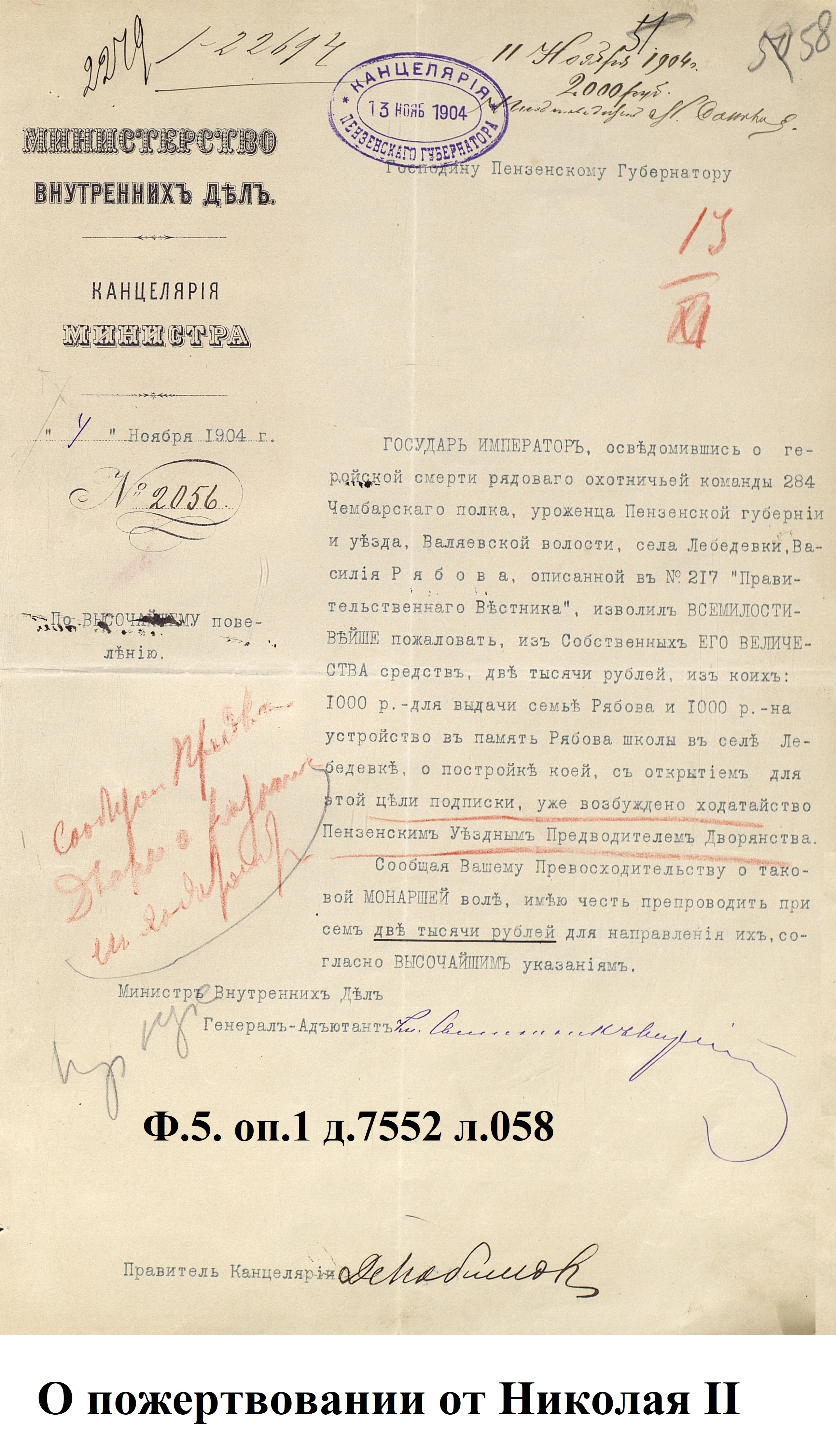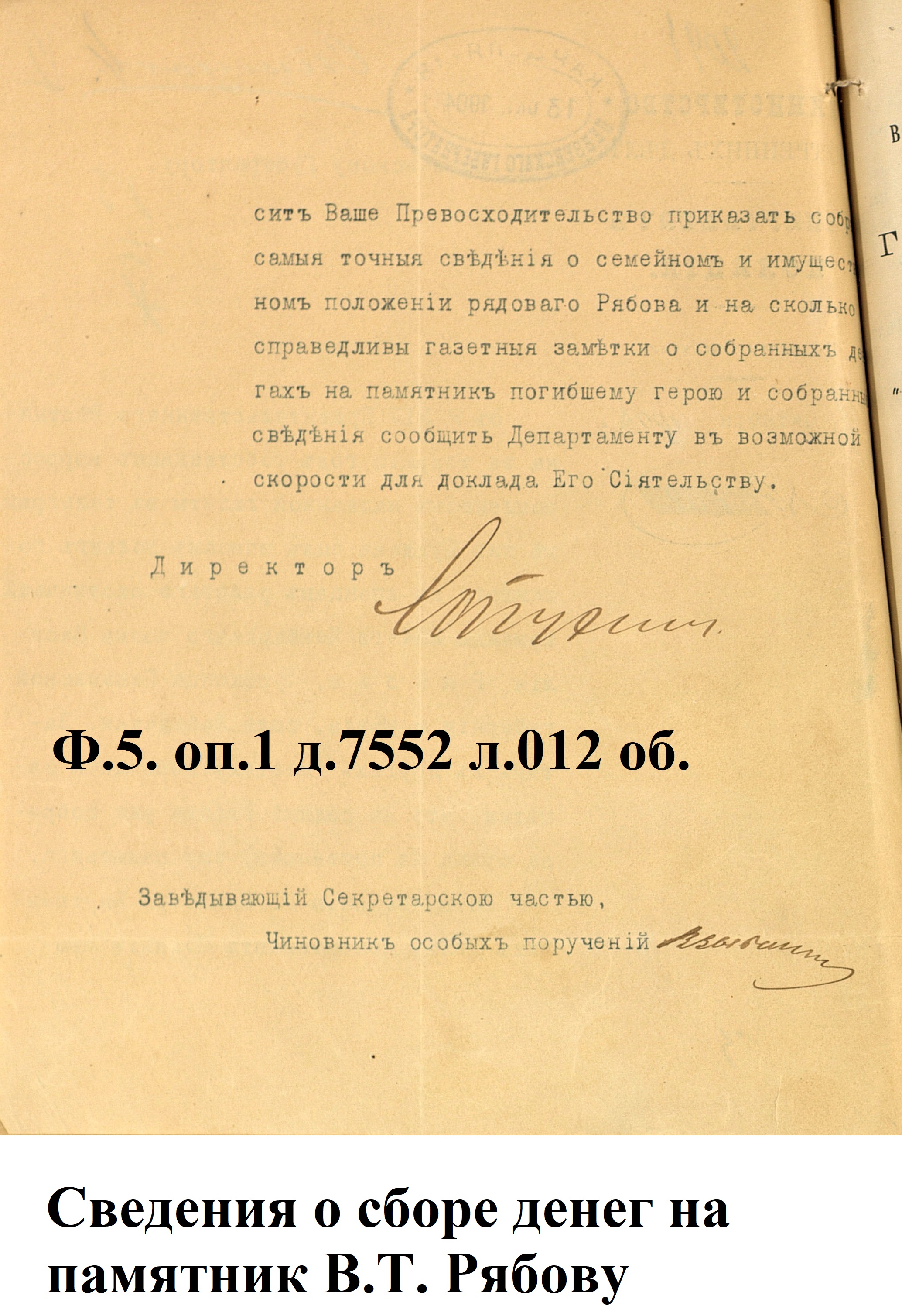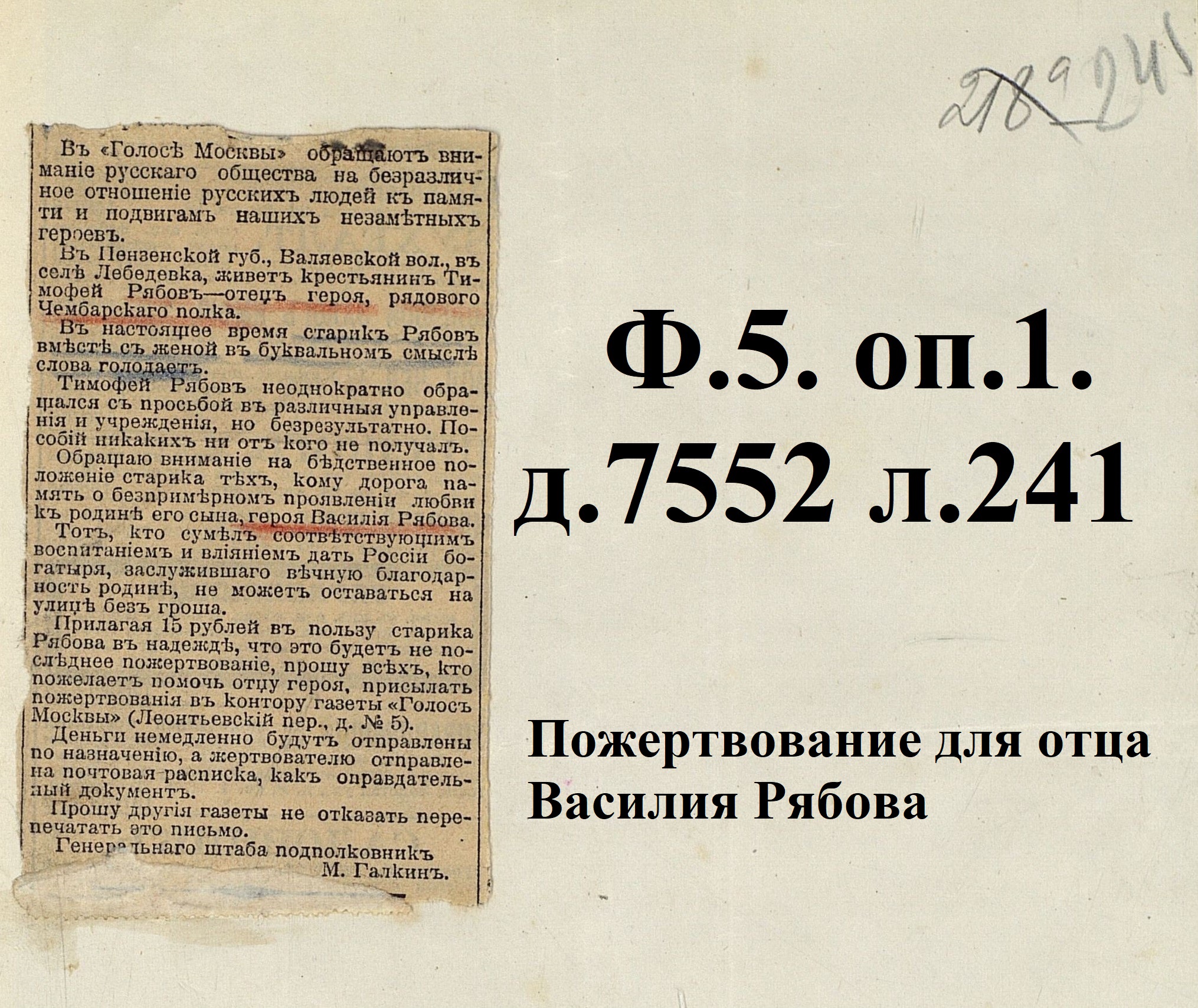 О подвиге солдата доложили императору Николаю II, и тот немедля учредил комитет по увековечиванию памяти героя. Пожертвования поступали со всей России. Государь лично выделил семье Рябова 1000 рублей, а его детей устроили в казённые учебные заведения. Кроме того, по подписке Рябовым собрали ещё около 7000 рублей. А на строительство школы в его селе – 2569 рублей. Разведчика навечно зачислили в списки 284-го Чембарского полка.
