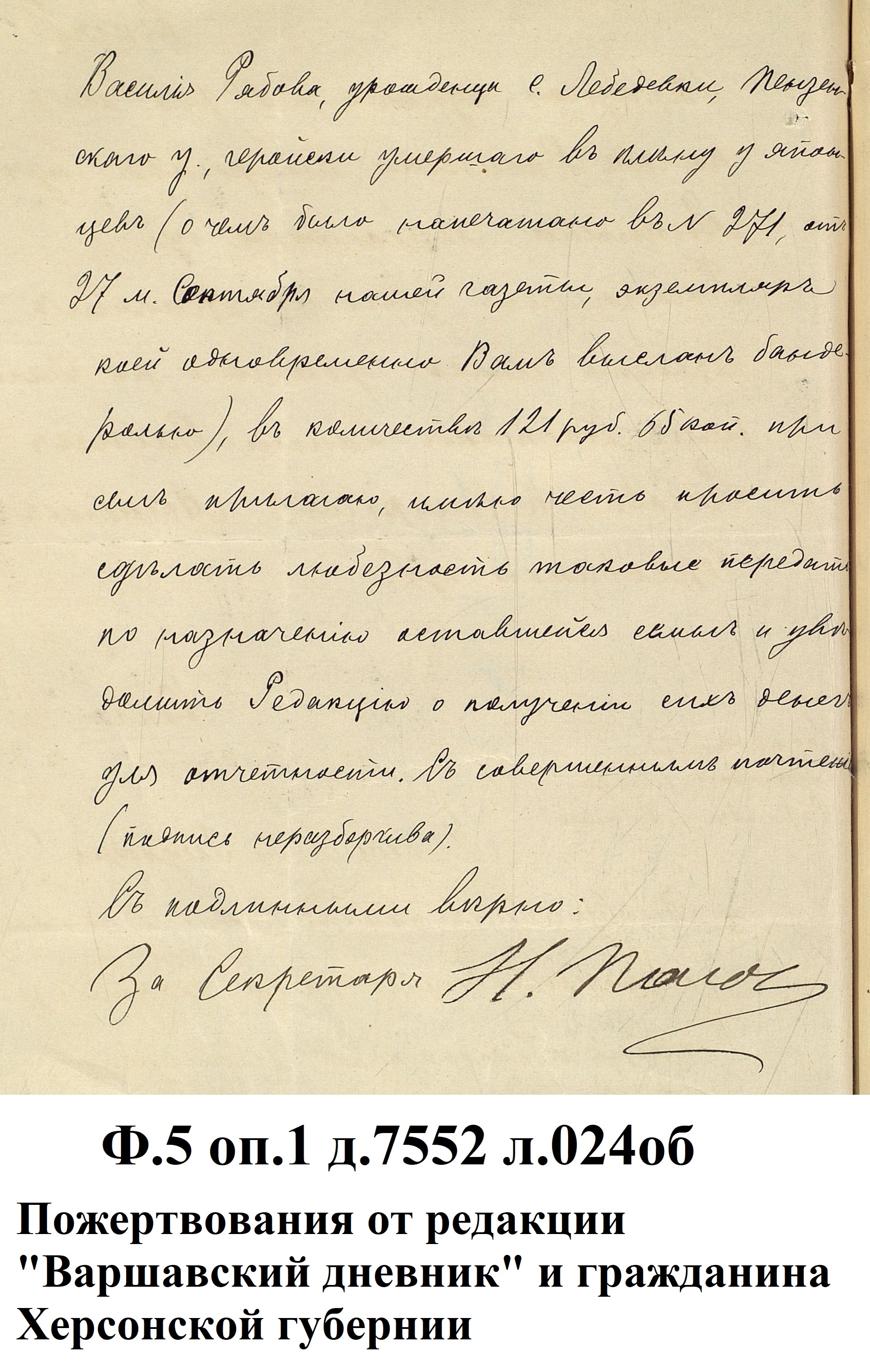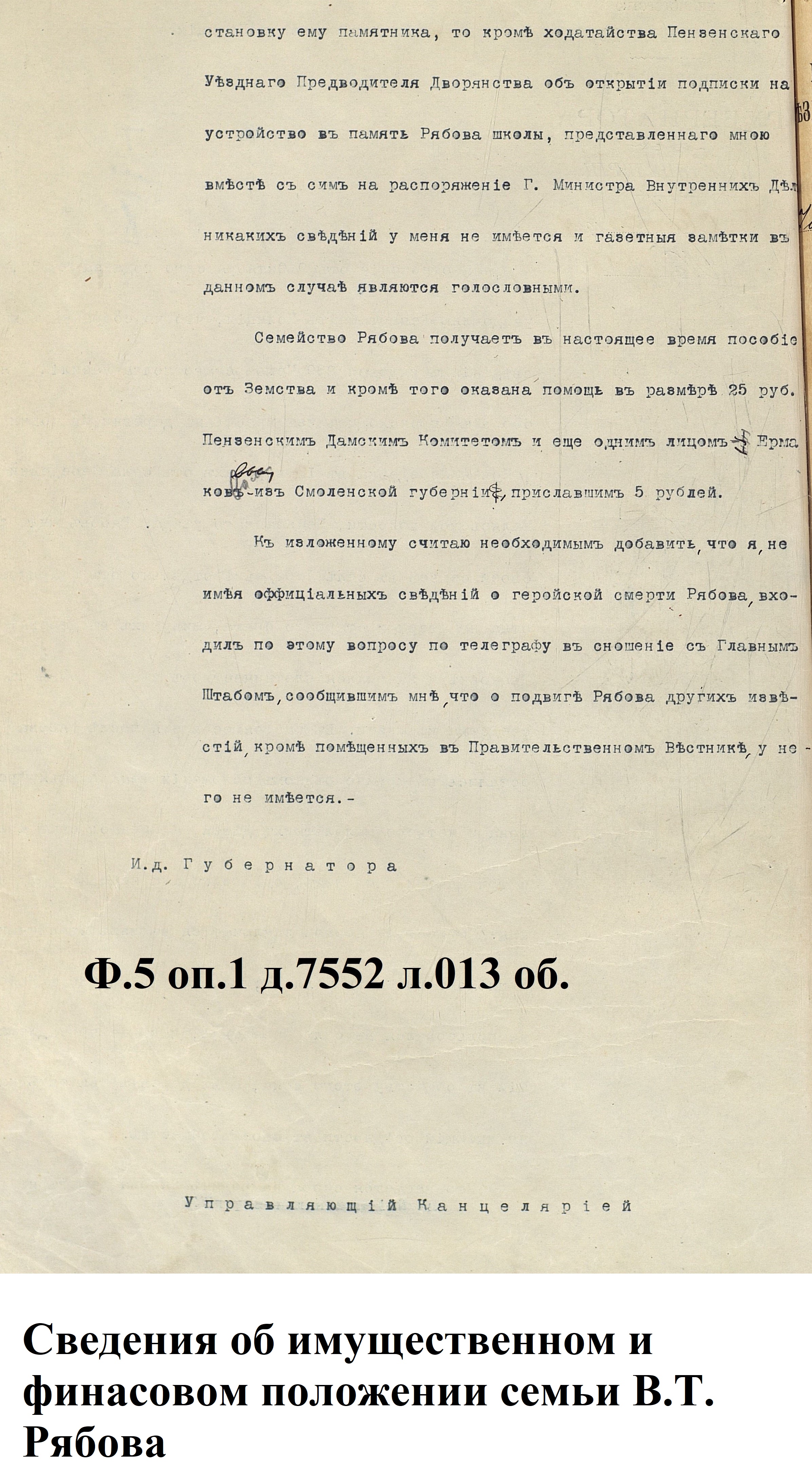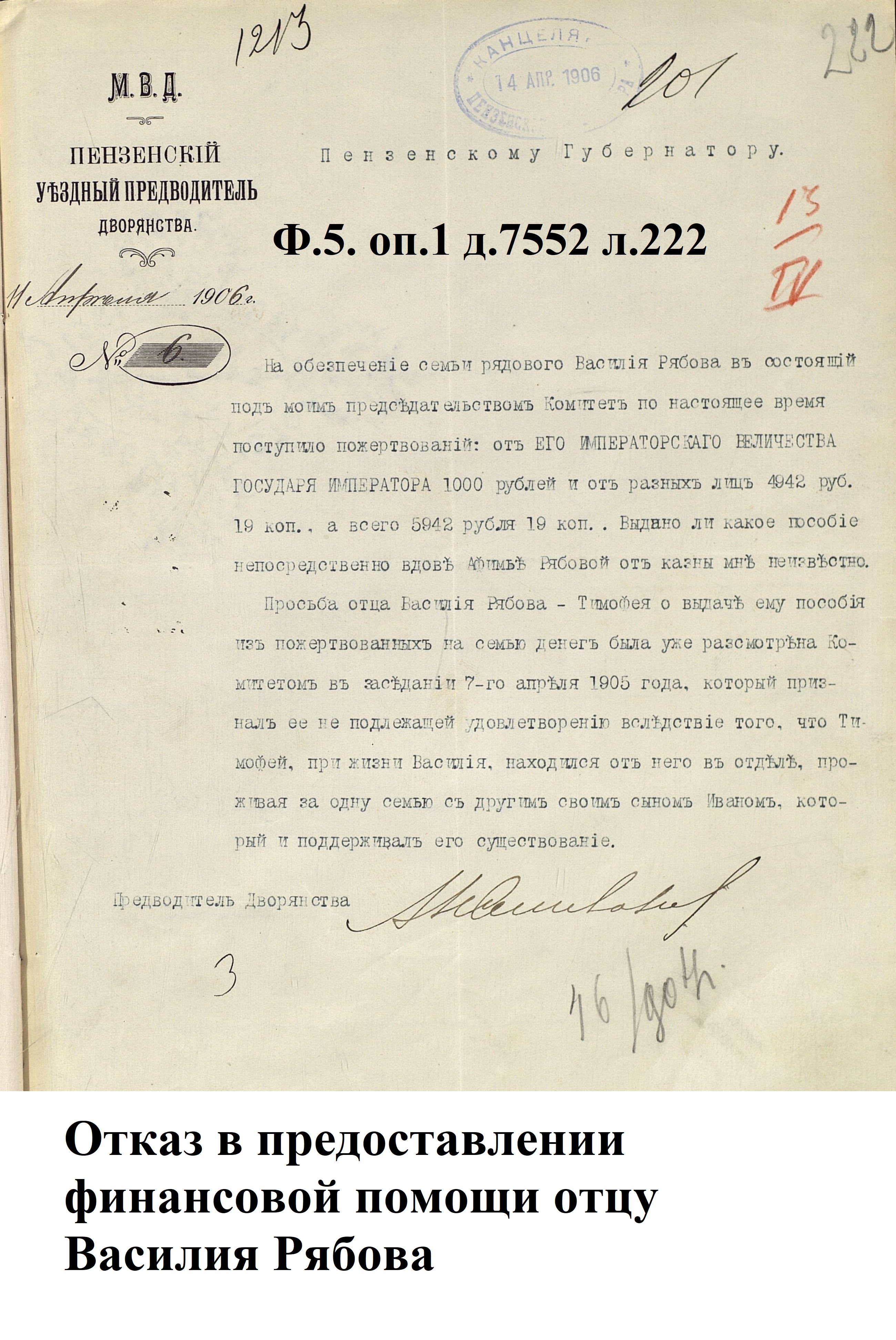 О подвиге солдата доложили императору Николаю II, и тот немедля учредил комитет по увековечиванию памяти героя. Пожертвования поступали со всей России. Государь лично выделил семье Рябова 1000 рублей, а его детей устроили в казённые учебные заведения. Кроме того, по подписке Рябовым собрали ещё около 7000 рублей. А на строительство школы в его селе – 2569 рублей. Разведчика навечно зачислили в списки 284-го Чембарского полка.