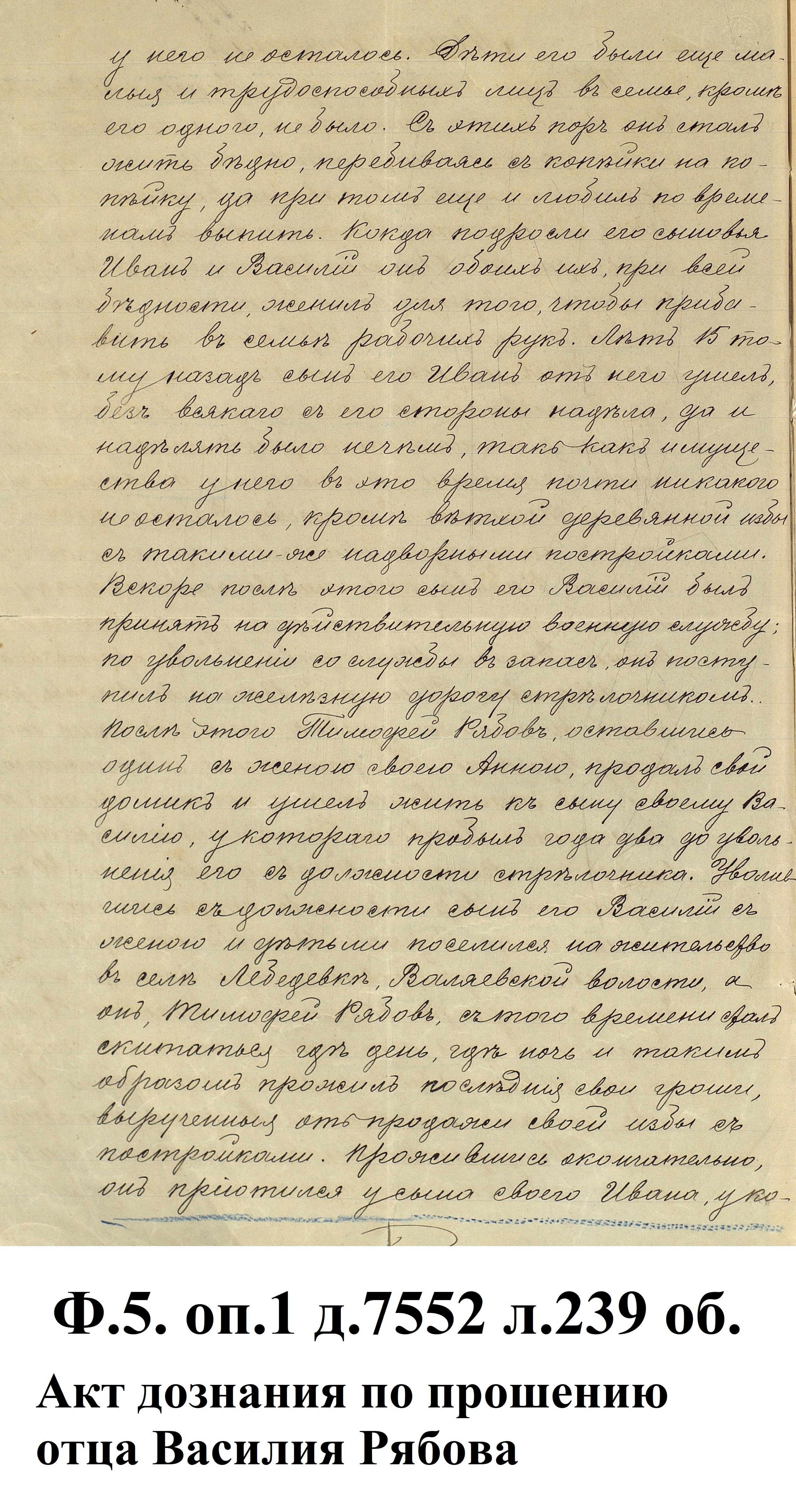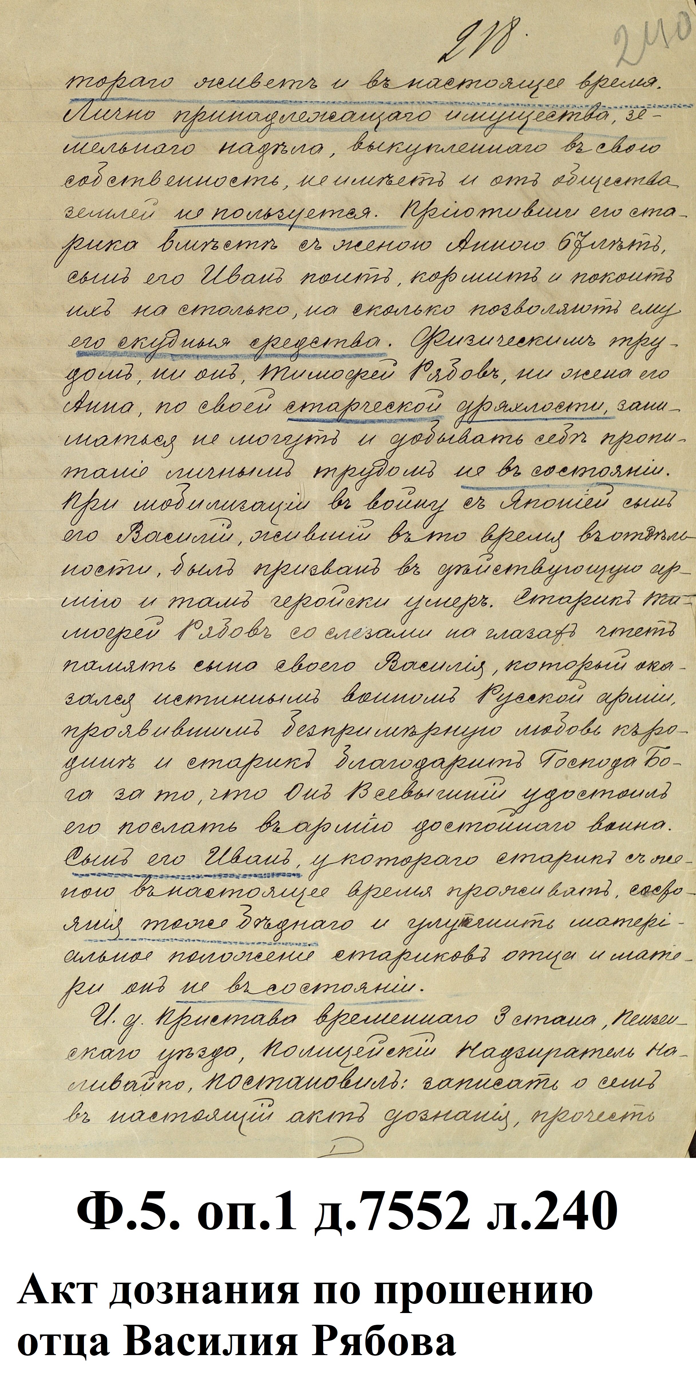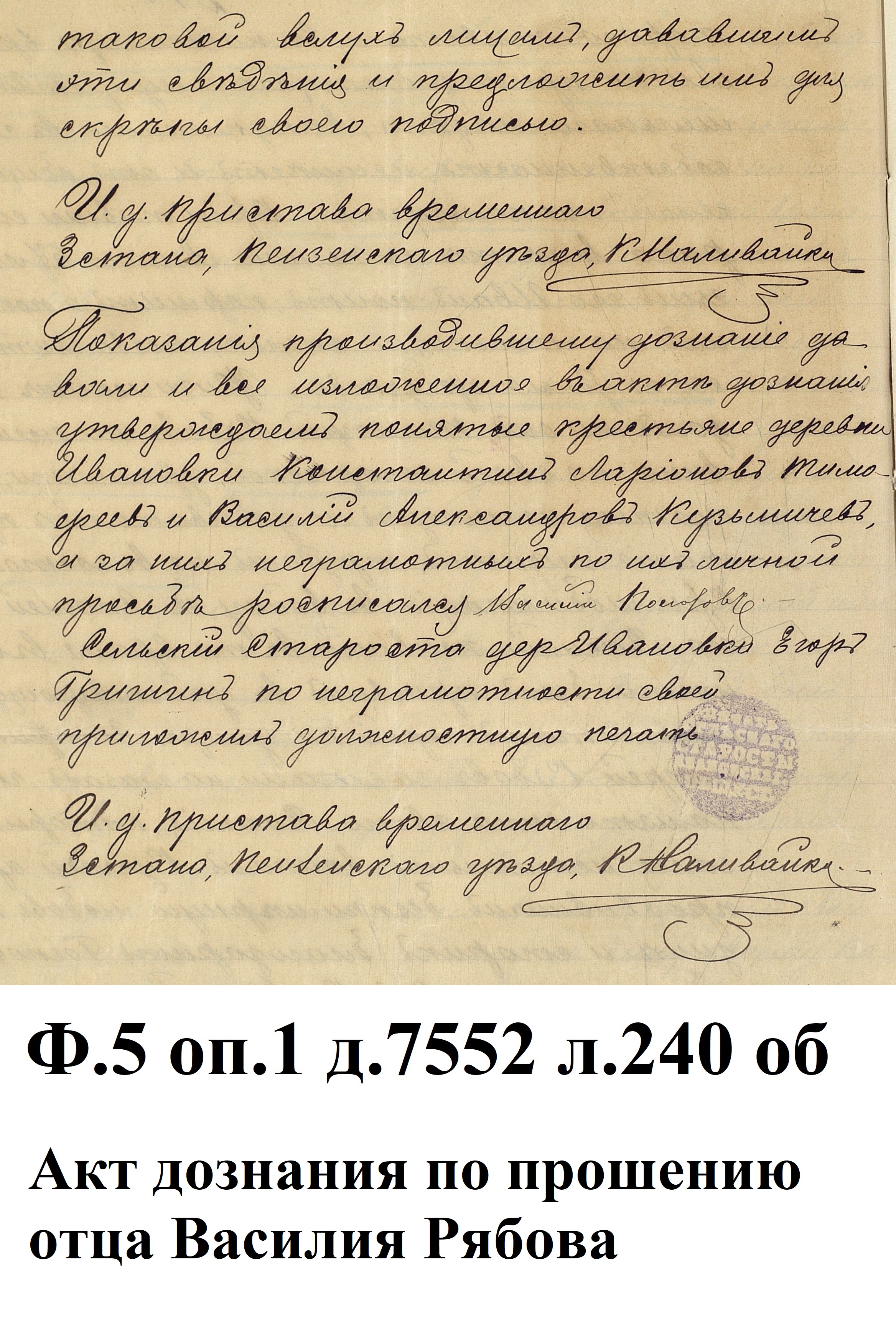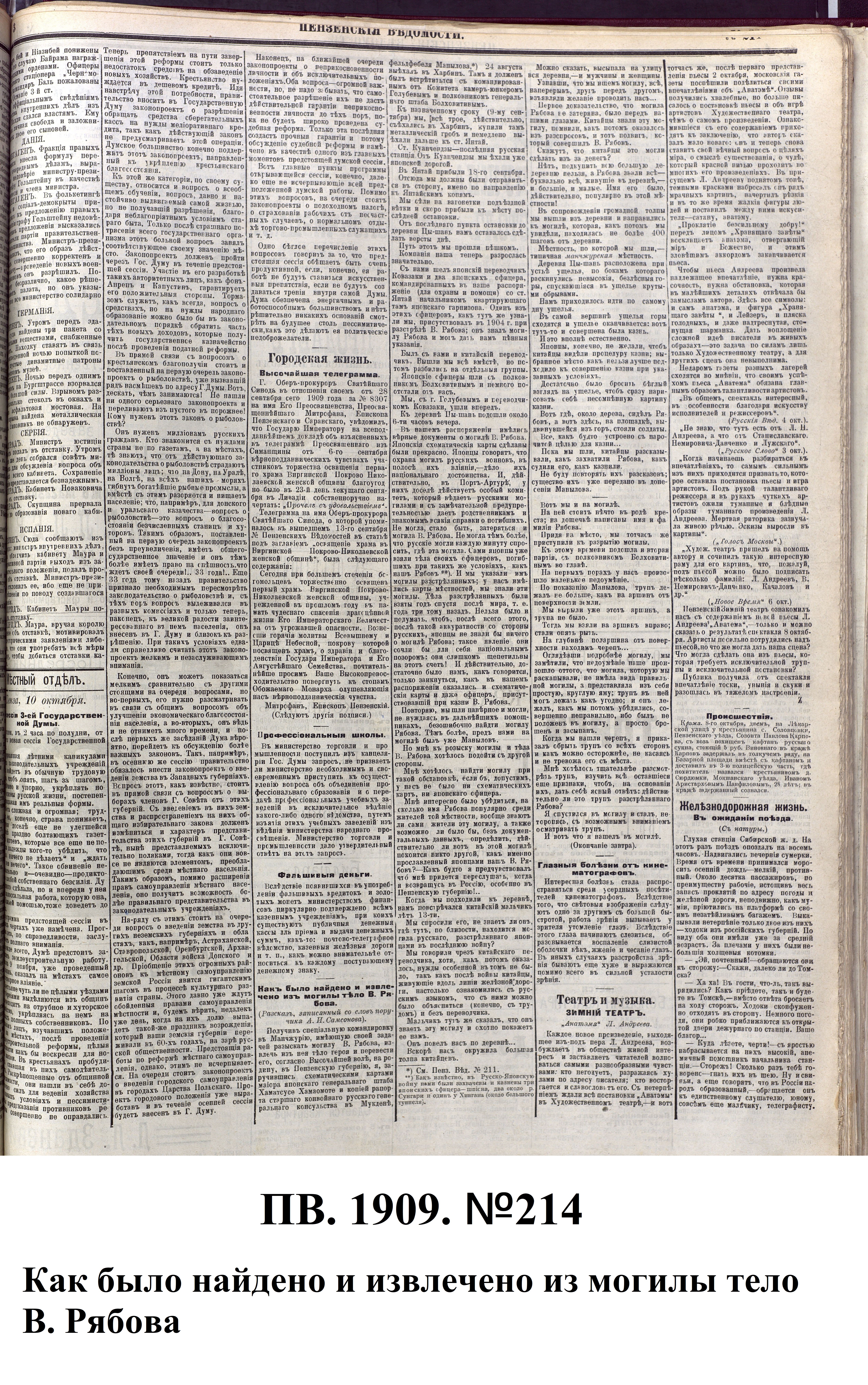 Штабс-капитан Инсарского полка Виктор Матвеевич Ватель вспоминал: «На этом месте находилось срубленное дерево. Китайцы кирками и лопатами начали рыть землю. После 10-15 минутной работы напали на следы могилы. На глубине одного аршина (около 70 см) были обнаружены череп и человеческие кости». Сомнения в том, что это мог быть не Рябов, а другой солдат, развеялись после рассказов китайских крестьян, они знали его в лицо: «Мы видели человека, собиравшего траву в длинном халате, в китайской соломенной шляпе. Это был русский. Он ночевал у нас 2 дня, мы кормили его и знали, что он русский. 15 сентября он помогал убирать чумизу (чёрный рис). Внезапно показался японский разъезд, и офицер приказал принести воды для коня. Он исполнил это. Вестовой тоже приказал принести ему воды. Понял он это или нет, но продолжал убирать чумизу. Тогда солдат, разозлившись за неповиновение, подошёл и дёрнул его за косу. Коса оторвалась и вестовой увидел, что перед ним русский». Позднее, дабы точно удостовериться в этом, Инсарский полк получил ряд детализирующих документов из Японии.