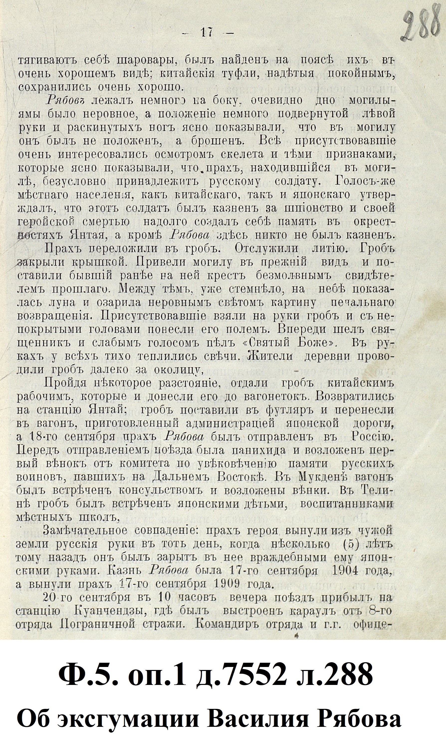 17 сентября приступили к эксгумации. «Первым был отрыт череп, затем туловище, потом ноги, - писал в отчёте штабс-капитан Ватель. – Череп поражён пулей, которая вошла через нижнюю губу и вышла в затылочную кость. Рот широко открыт, нижние зубы спереди выбиты и нижняя челюсть в области губы раздроблена. В затылке видны три большие трещины, пересечение которых и есть место выхода пули». (Прим. автора: этой, на первый взгляд, странной смертельной ране есть своё объяснение. Кажется, будто солдат немного скосил и вместо лобной кости попал в губу. Дело в другом. Рябов сидел на косогоре чуть выше расстрельной команды, поэтому японскому солдату приходилось стрелять чуть ли не снизу вверх).