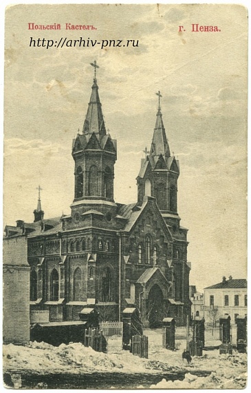 Здание римско-католического костела. Начало XX века. После подавления польского национально-освободительного восстания 1863-1864 годов в Пензу было сослано достаточное большое количество поляков. В 1897 году пензенское римско-католическое общество, стало ходатайствовать о разрешении им приобрести усадьбу на улице Лекарской, принадлежащую цеховой Устинье Сабуровой, для устройства на ней молитвенного дома. 22 января 1898 года Высочайшим повелением такое разрешение им было дано. Но в 1901 году устроенный в одном из зданий усадьбы молитвенный дом сгорел и вместо него на прежнем месте было решено построить костел. На основании того, что был выполнен проект не молитвенного дома, а костела, строительное отделение послало его на рассмотрение в Министерство внутренних дел, которое, «не встречая препятствий к разрешению», утвердило его 13 марта 1903 года без всяких замечаний. Однако строительная комиссия, католическим обществом, нашла, что внутреннее решение костела очень неудобное и для молящихся, и для проведения самого богослужения. Проект не был принят, а вместо него губернским архитектором А. С. Федотовым был составлен новый проект, внешне схожий с первым, но рассчитанный на большую вместимость, который и был утвержден строительным отделением Пензенского губернского правления 17 сентября 1903 года. По окончании строительства в сентябре 1906 костел был освящен во имя Непорочного Зачатия Пресвятой Девы Марии. К моменту его открытия католическая община насчитывала 1024 чел. Костел закрыт в 1931 г. постановлением Горсовета и после сноса звонниц, уничтожении росписи и стесывании настенных крестов, был передан под размещение Дома учителя. Для увеличения полезной площади в едином внутренним объеме бывшего храма были устроены перекрытия, поделившие его на этажи. Затем, для полного функционального перепрофилирования были прорублены дополнительные окна и устроены межэтажные лестницы.