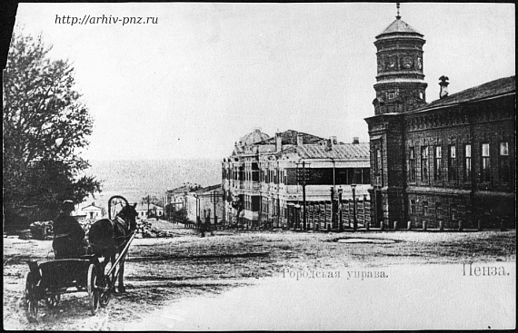 Здание пензенской городской управы (до наших дней не сохранилось) Управа была создана 30 декабря 1870 г. по «Городовому положению» от 16 июня 1870 г. Городская управа занималась выполнением административных и налоговых функций, вела текущие дела по городскому хозяйству, составляла сметы и отчеты, утверждала планы частных домовладений в пределах города, выдавала разрешения на перестройки и ремонт зданий и др. Для ведения отдельных отраслей городского хозяйства при управе учреждались особые временные или постоянные исполнительные комиссии из числа членов управы и горожан, обладавших избирательным правом. В ведомство городской управы входило также управление городским хозяйством: «внешнее устроение города», благосостояние городского населения, меры к обеспечению народного продовольствия, устройство рынков и базаров, попечение «об охранении народного здоровья», предотвращение пожаров, развитие местной торговли и промышленности, устройство пристаней, банков и кредитных учреждений, благотворительных заведений и больниц, попечение о народном образовании, устройство театров, библиотек, музеев и др. учреждений. Упразднена в марте 1918 г. Изначально здание было деревянным, а башенка над восточным подъездом Городской управы создавалась как резервная водонапорная башня городского водопровода и была исполнена из кирпича. Позднее все здание было обложено кирпичом. Гидротехническое оборудование в башне не было установлено до начала I-й мировой войны, а во время войны к завершению проекта ни кто и не стремился. К 1960 годам здание обветшало и было разобрано. Позднее на этом месте разместят Дом знаний.