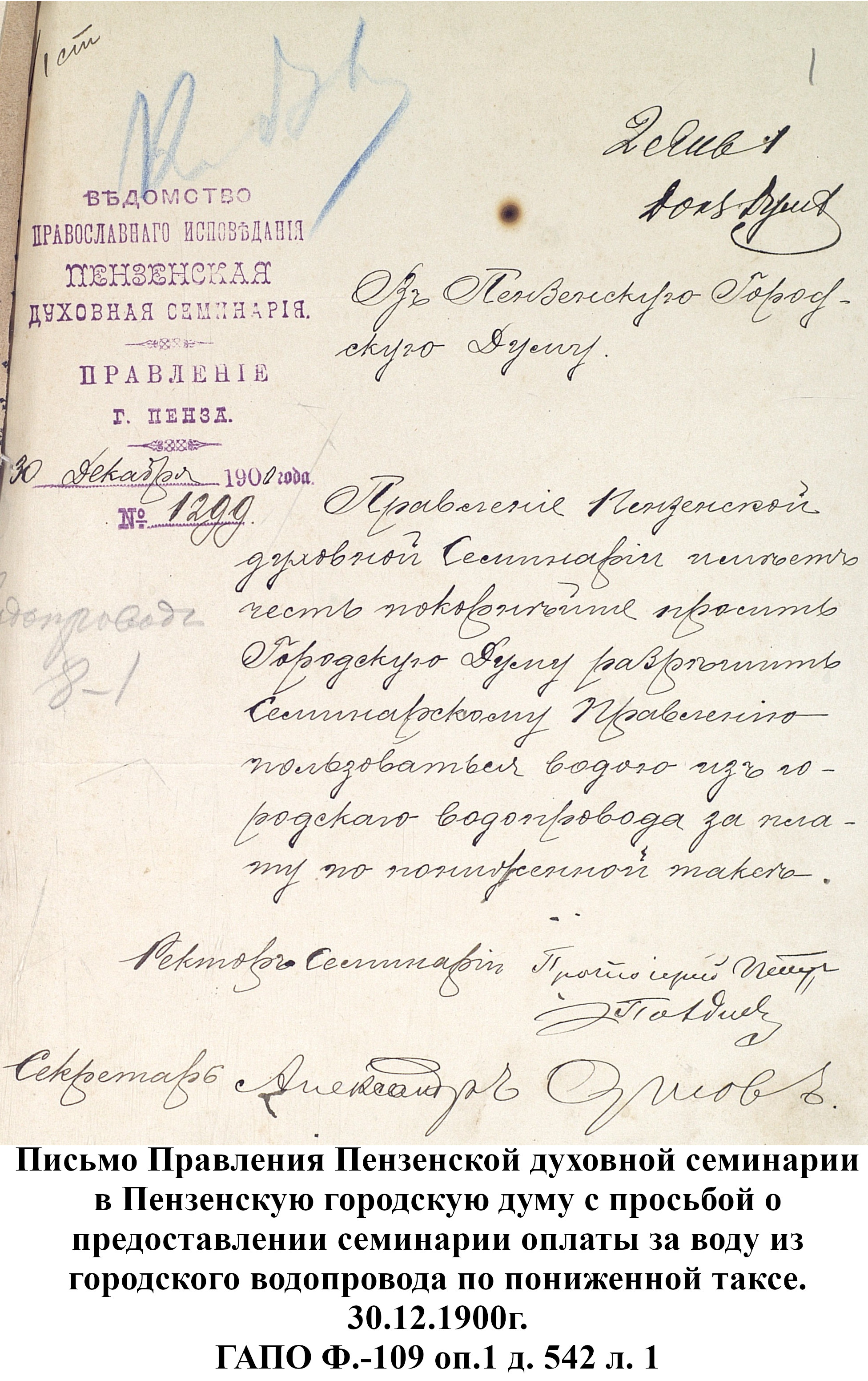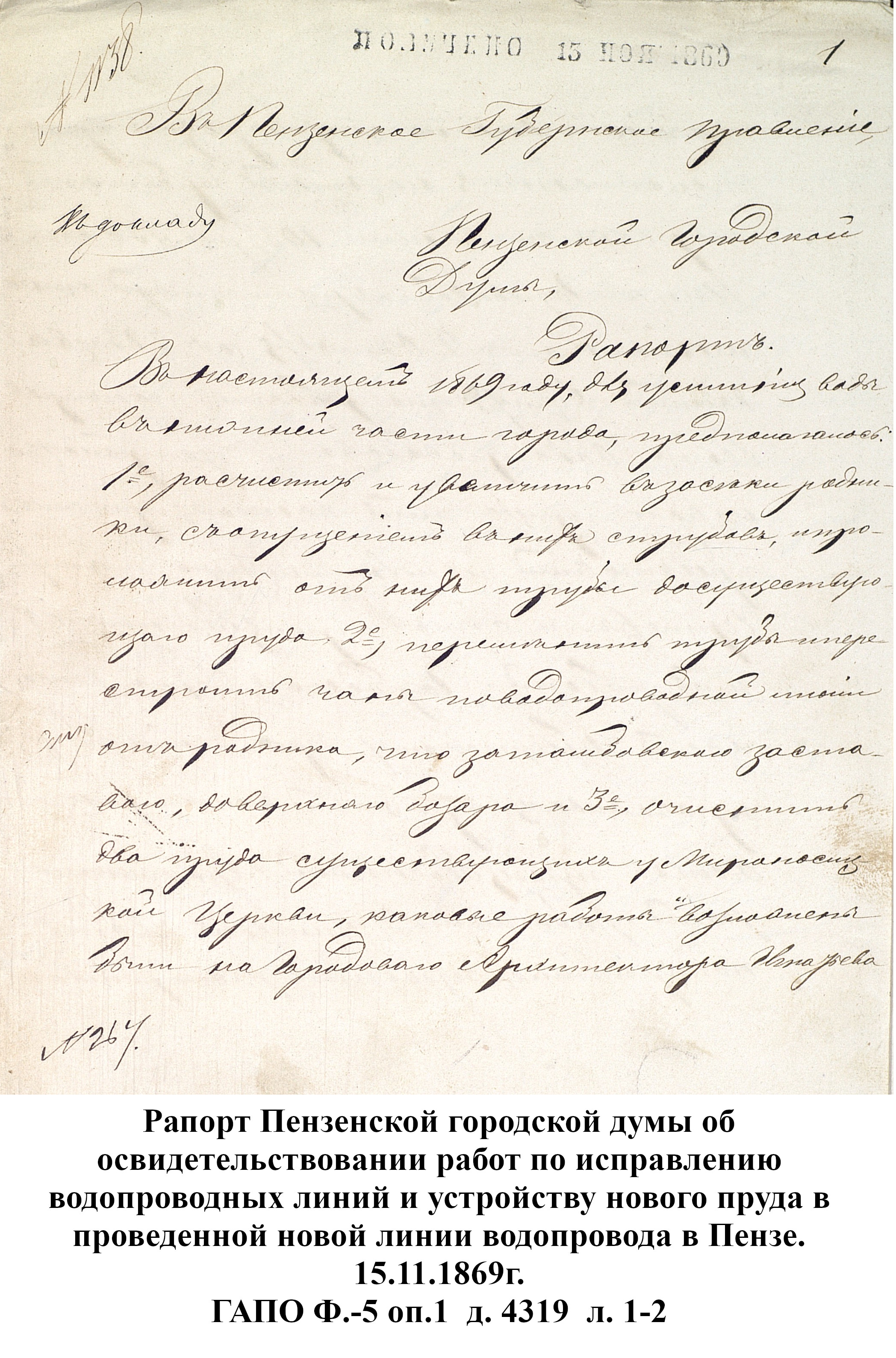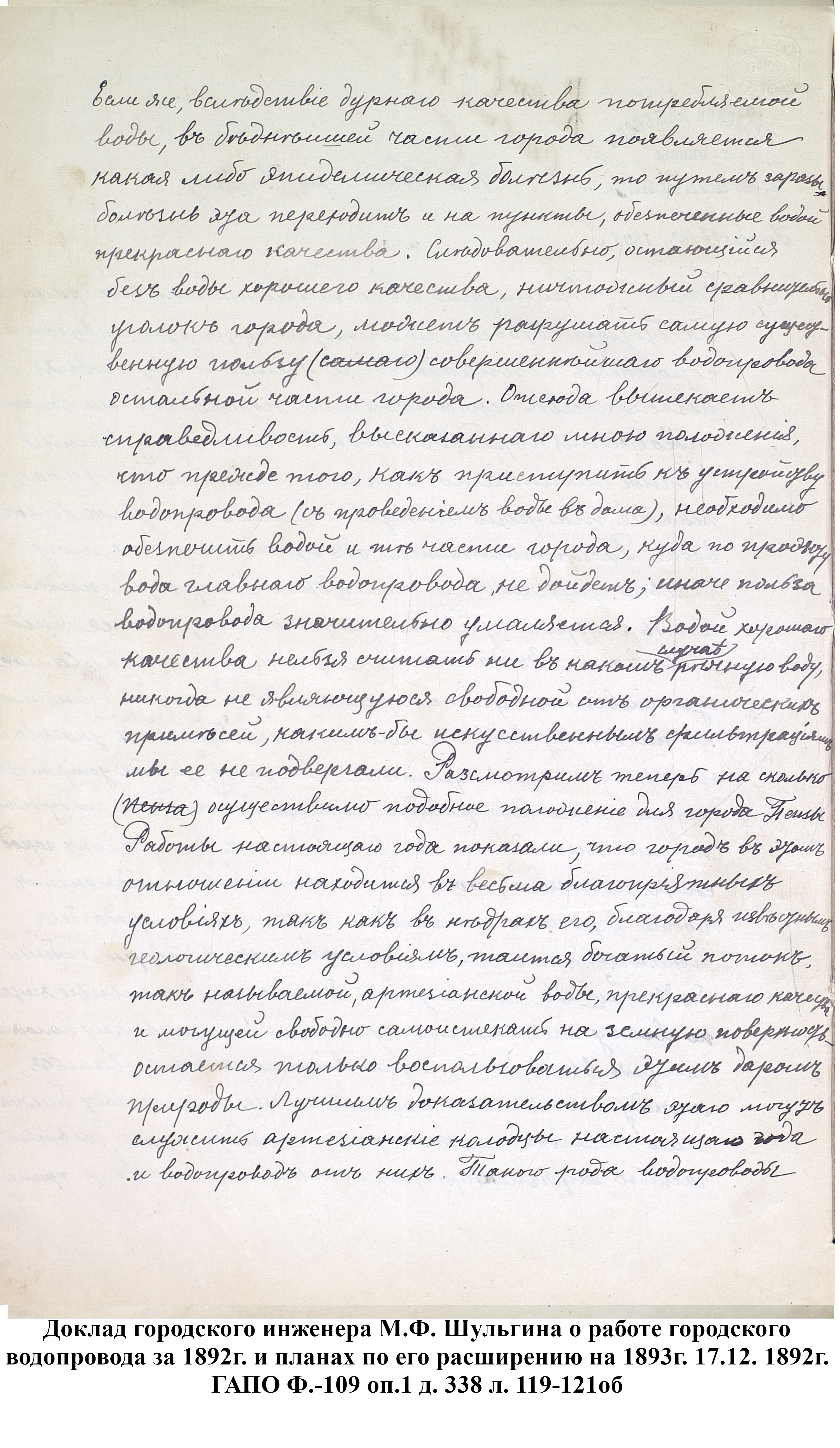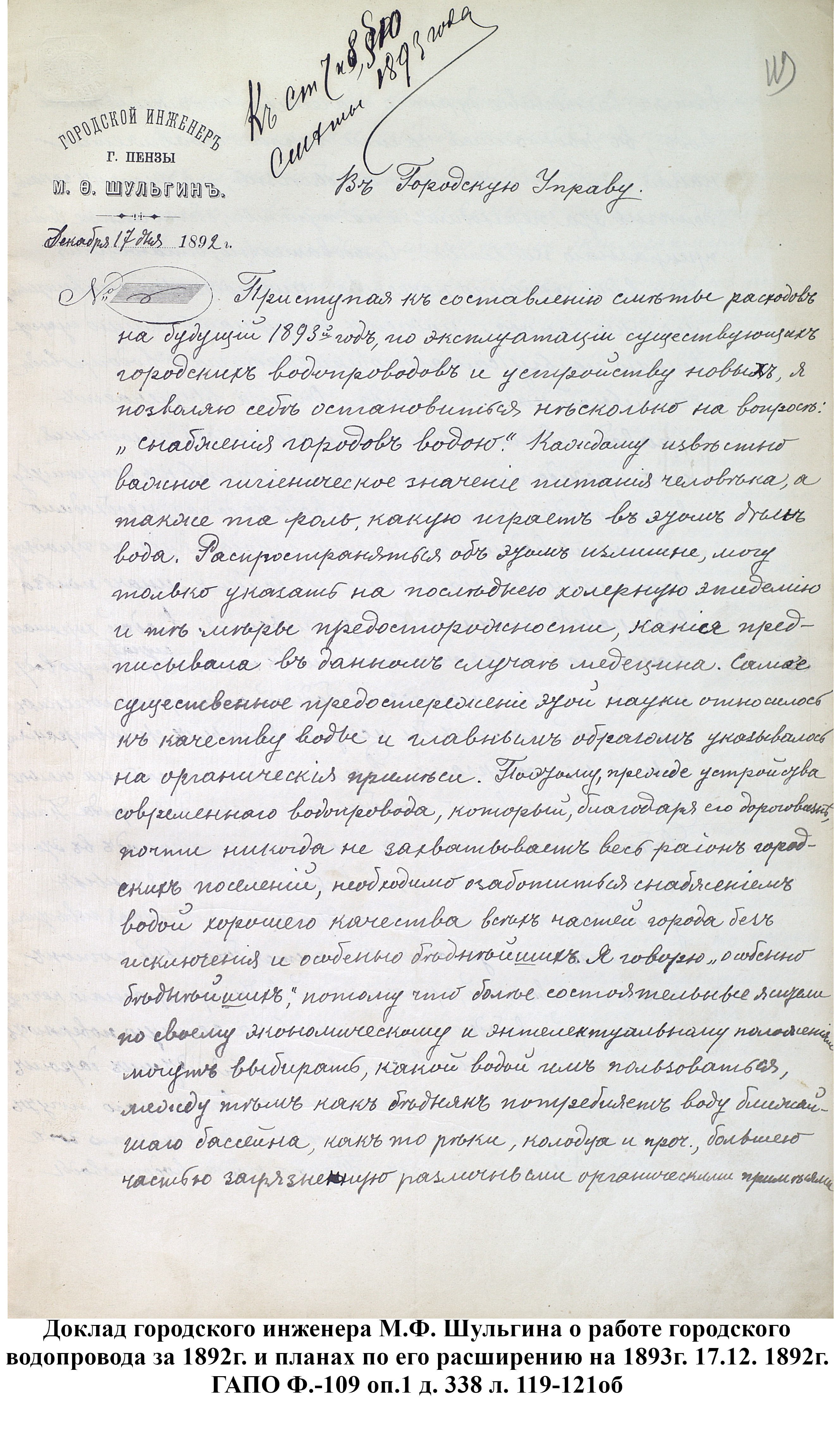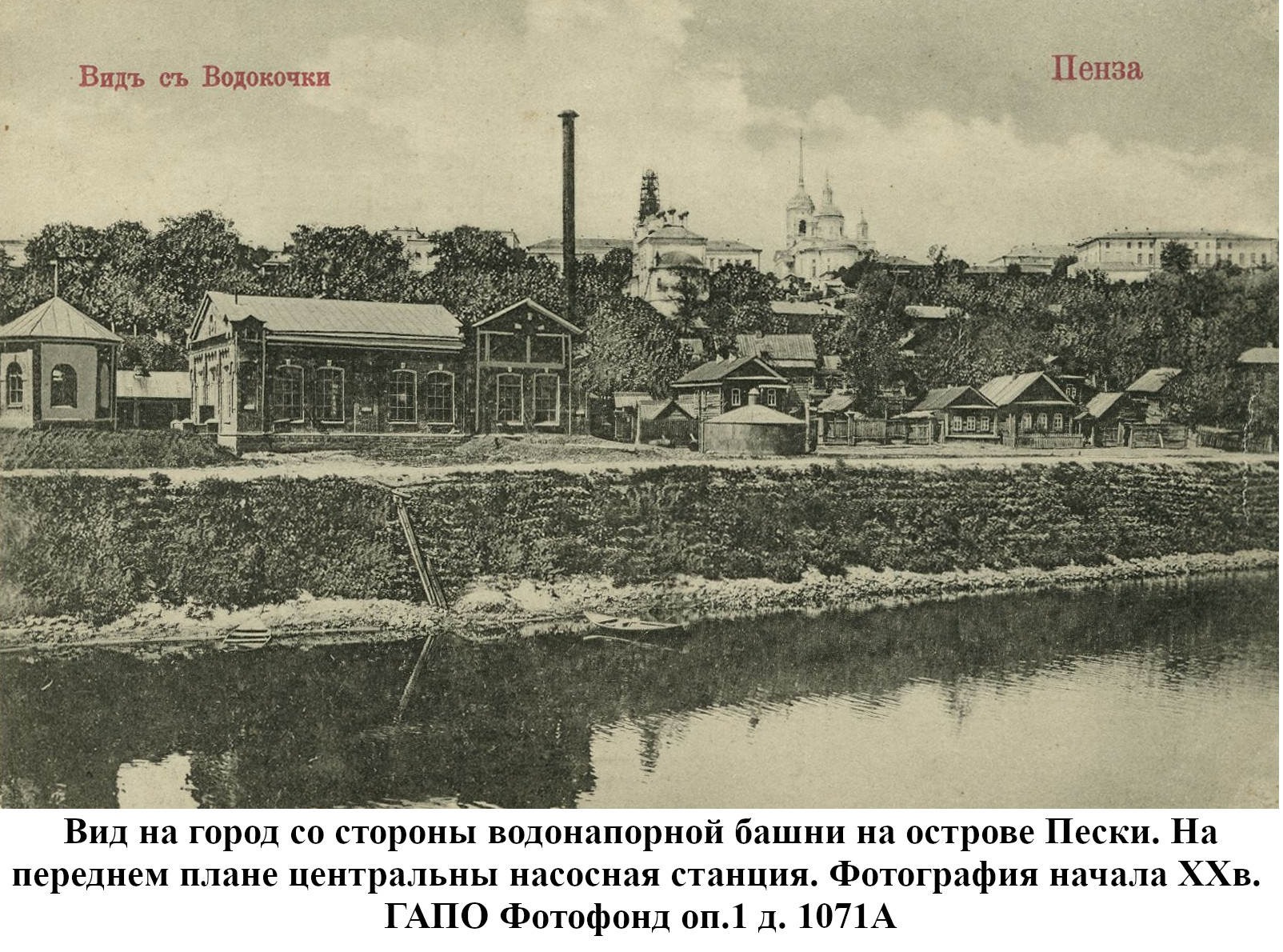До 1889 года бедное население города Пензы, живущее по преимуществу в нижней части и в его заречной стороне пользовалось исключительно водой из реки Пензы; состоятельный же класс жителей был в более счастливых условиях: он снабжался вполне здоровой водой, получаемой из нескольких колодцев, устроенных в нагорной части города. Но эти колодцы давали слишком ограниченное количество хорошей воды, которой едва хватало для питья и приготовления пищи, вследствие чего для других надобностей приходилось пользоваться водой плохого качества, подвозимой водовозами из реки Пензы. Остальная часть города из реки брала воду для всех нужд.