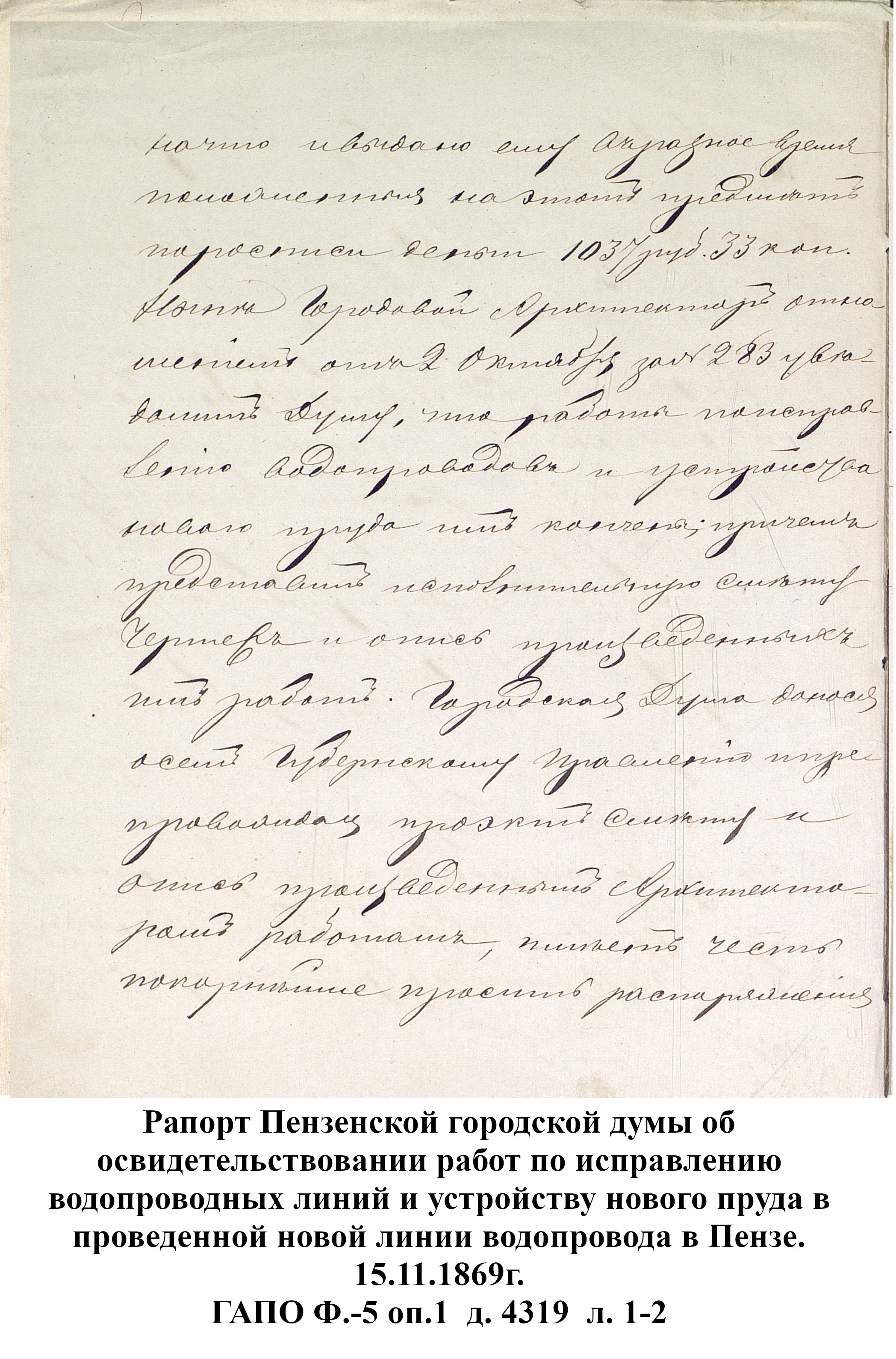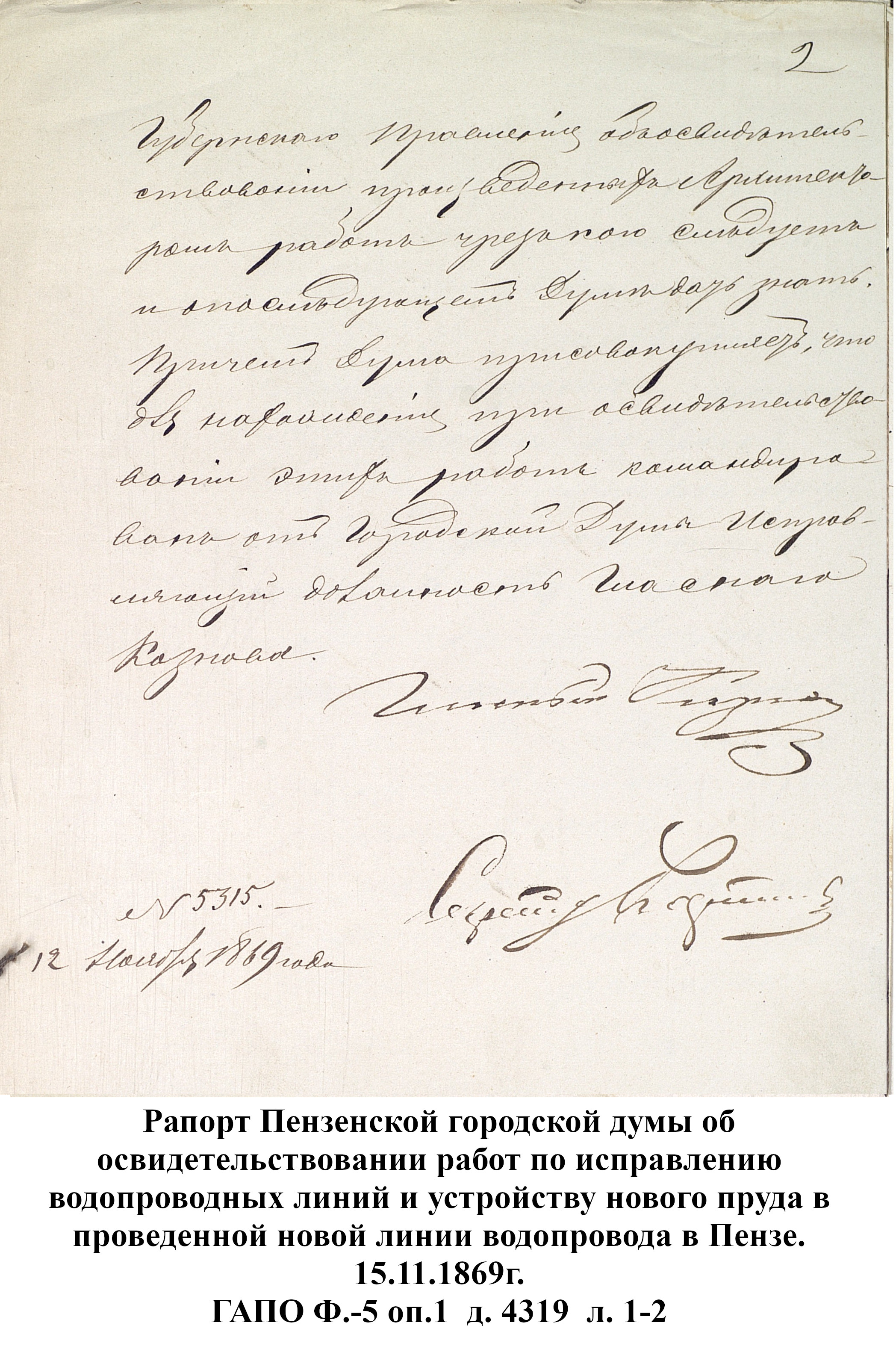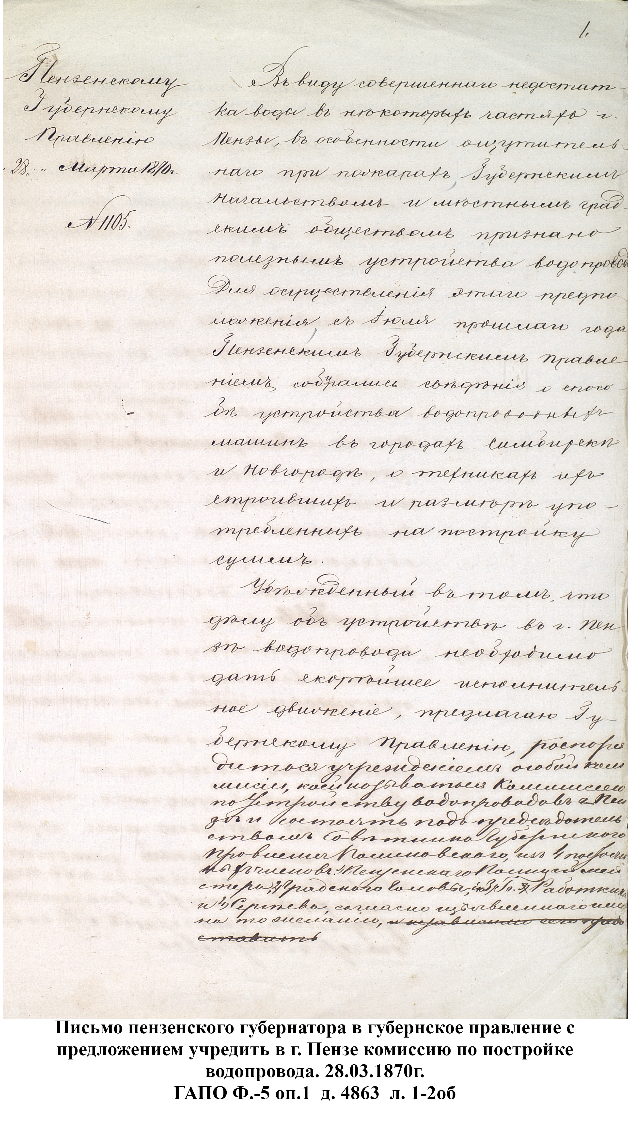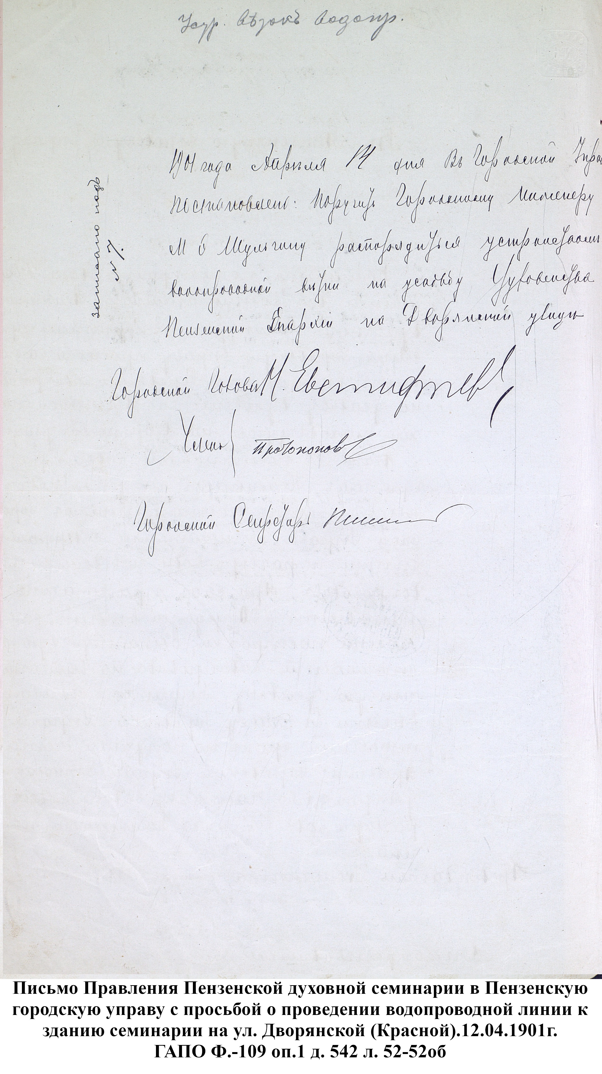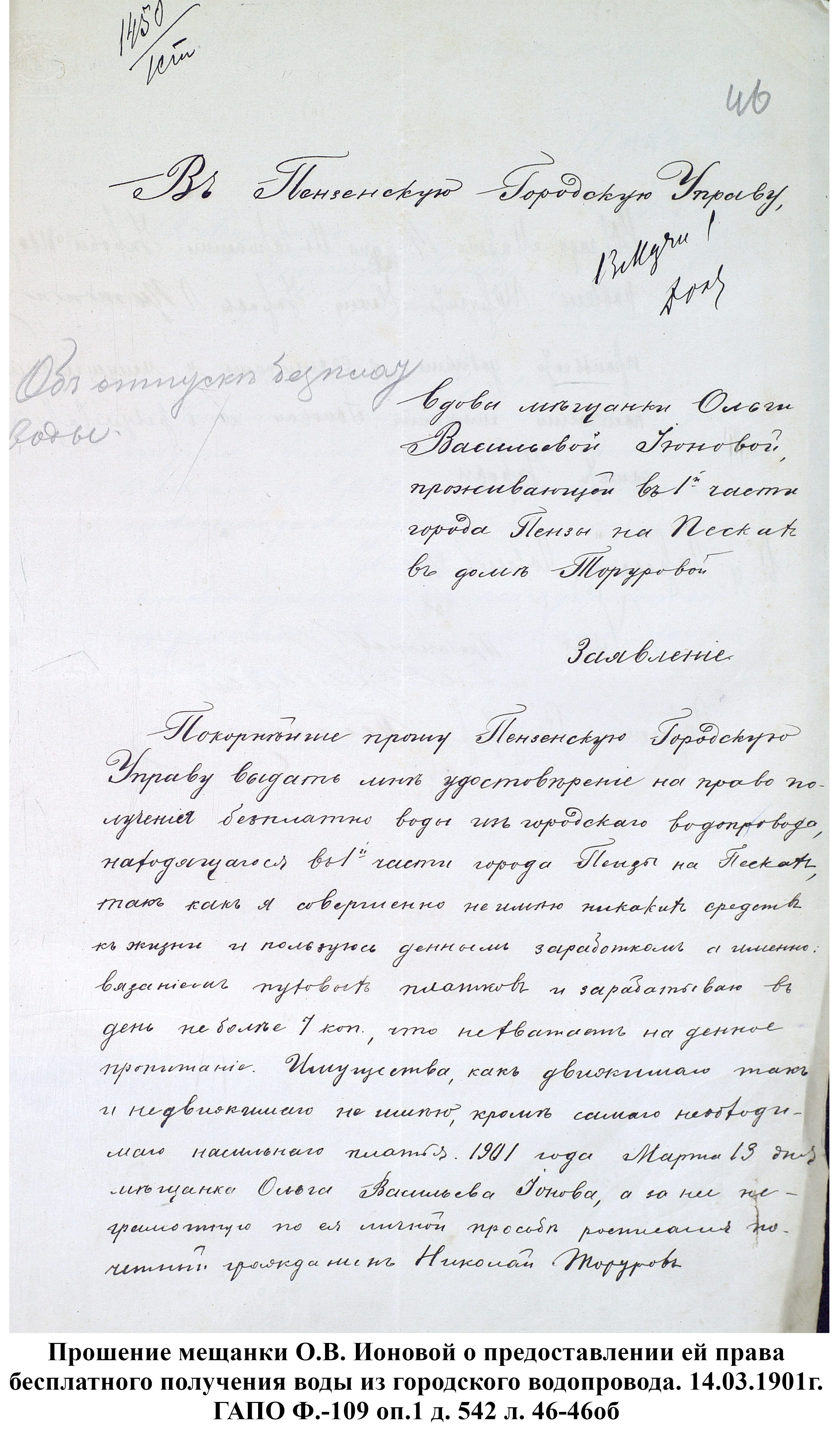 До 1889 года бедное население города Пензы, живущее по преимуществу в нижней части и в его заречной стороне пользовалось исключительно водой из реки Пензы; состоятельный же класс жителей был в более счастливых условиях: он снабжался вполне здоровой водой, получаемой из нескольких колодцев, устроенных в нагорной части города. Но эти колодцы давали слишком ограниченное количество хорошей воды, которой едва хватало для питья и приготовления пищи, вследствие чего для других надобностей приходилось пользоваться водой плохого качества, подвозимой водовозами из реки Пензы. Остальная часть города из реки брала воду для всех нужд.