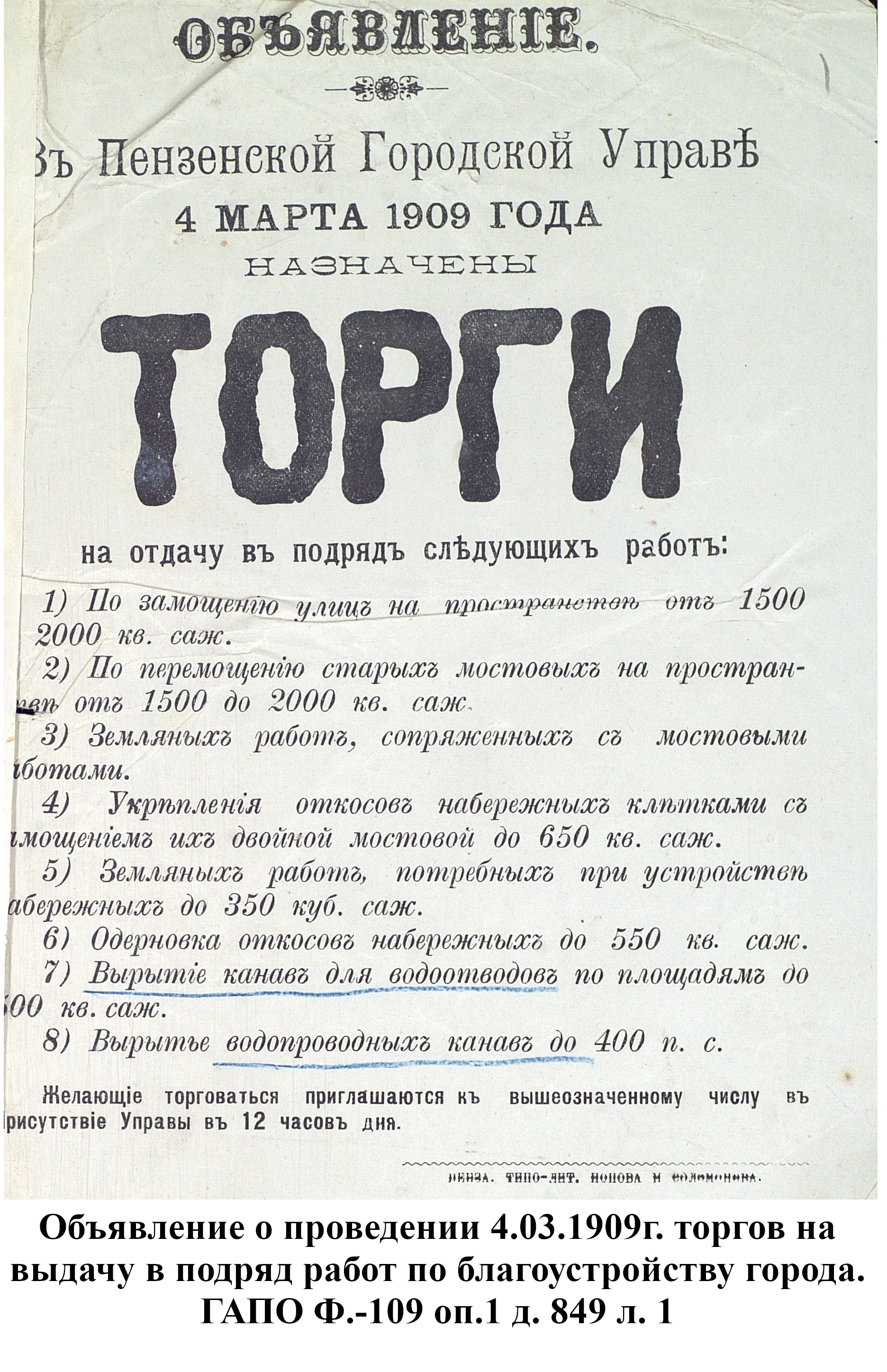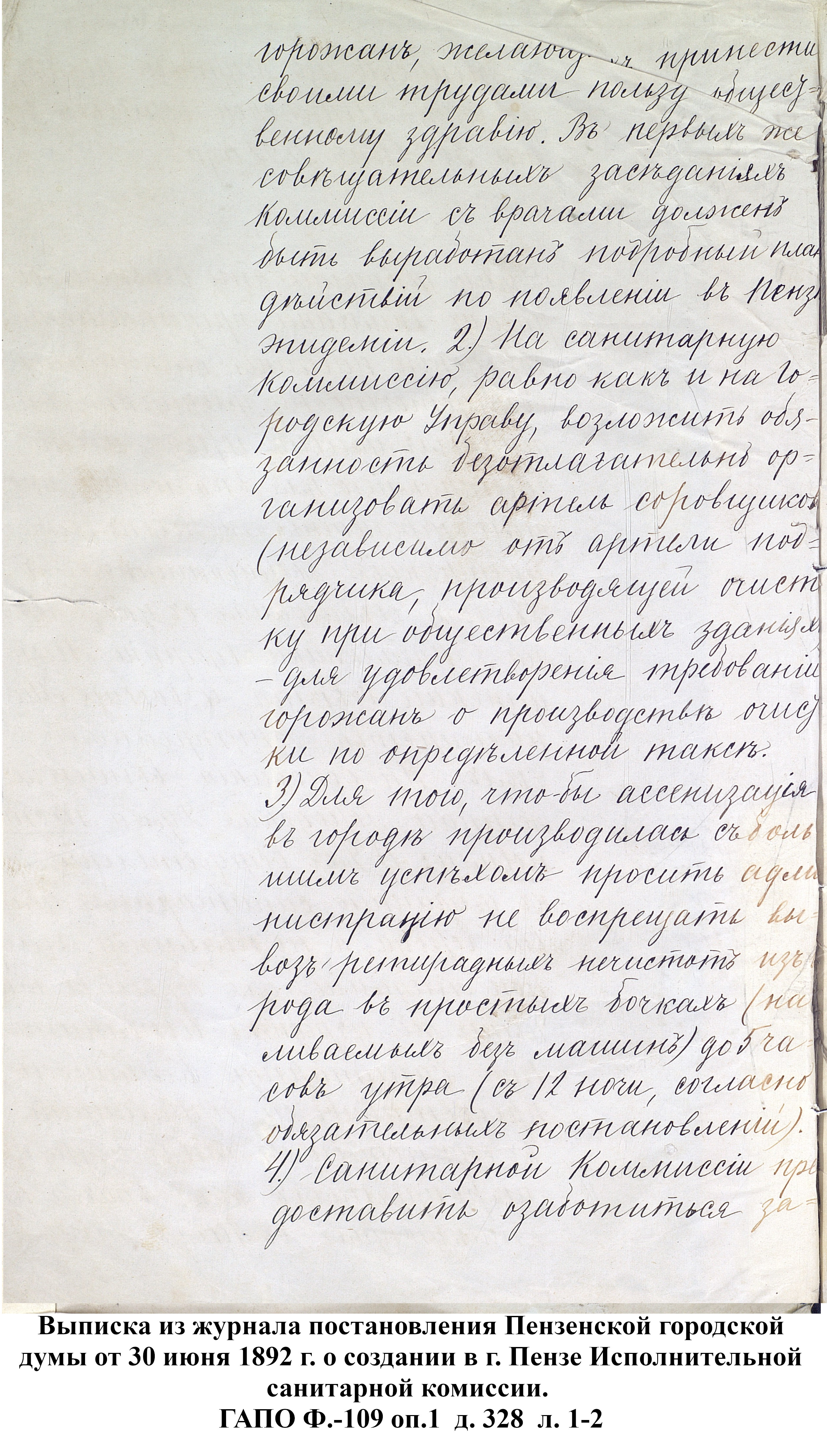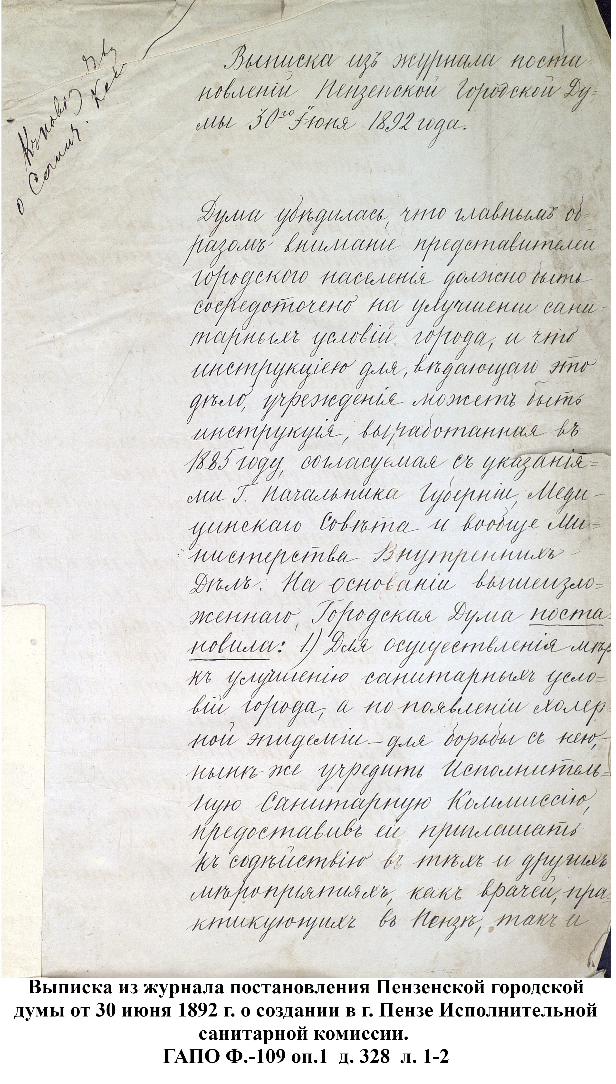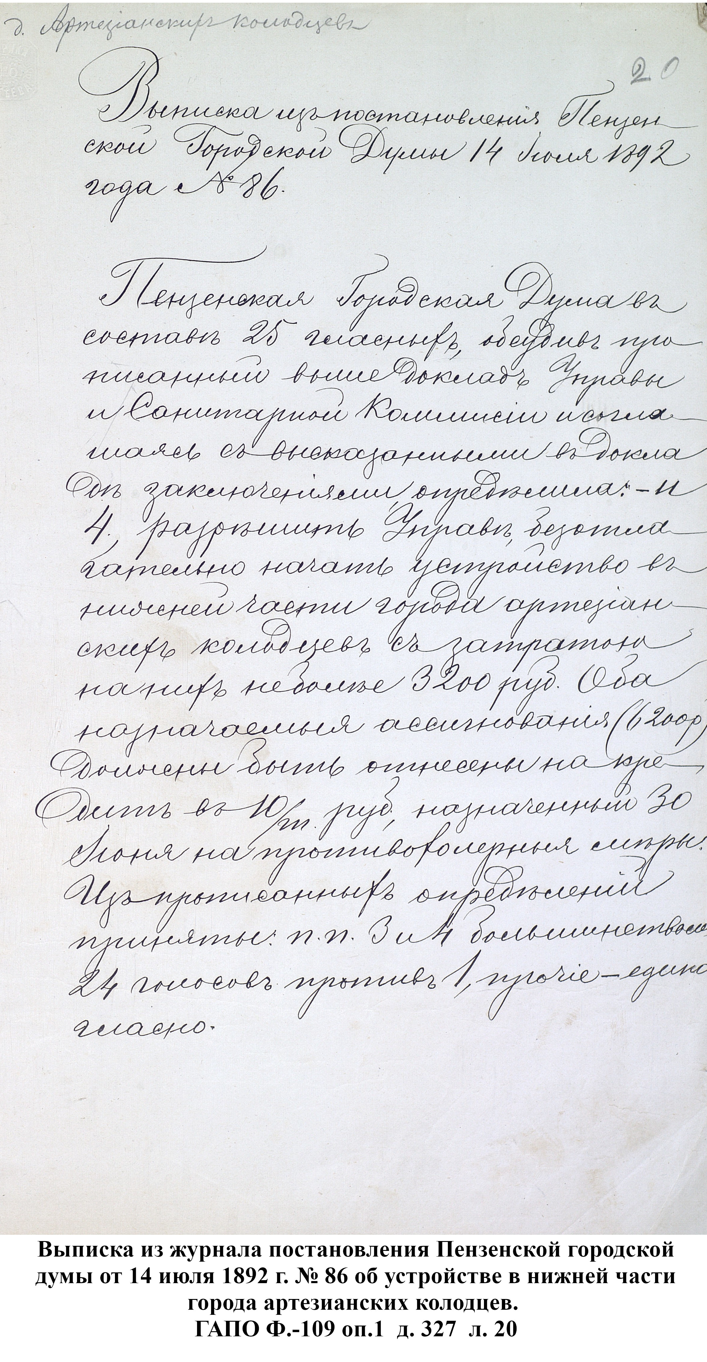 Холерная эпидемия, появившаяся в Пензе в 1892г., и панический ужас, охвативший население, заставили власти города принять меры к скорейшему осуществлению проекта о водоснабжении артезианскими колодцами. Был приглашен горный инженер, под руководством которого начали производить бурение скважин. После нескольких неудачных попыток, вырыты были в 1892 г. три артезианских колодца: