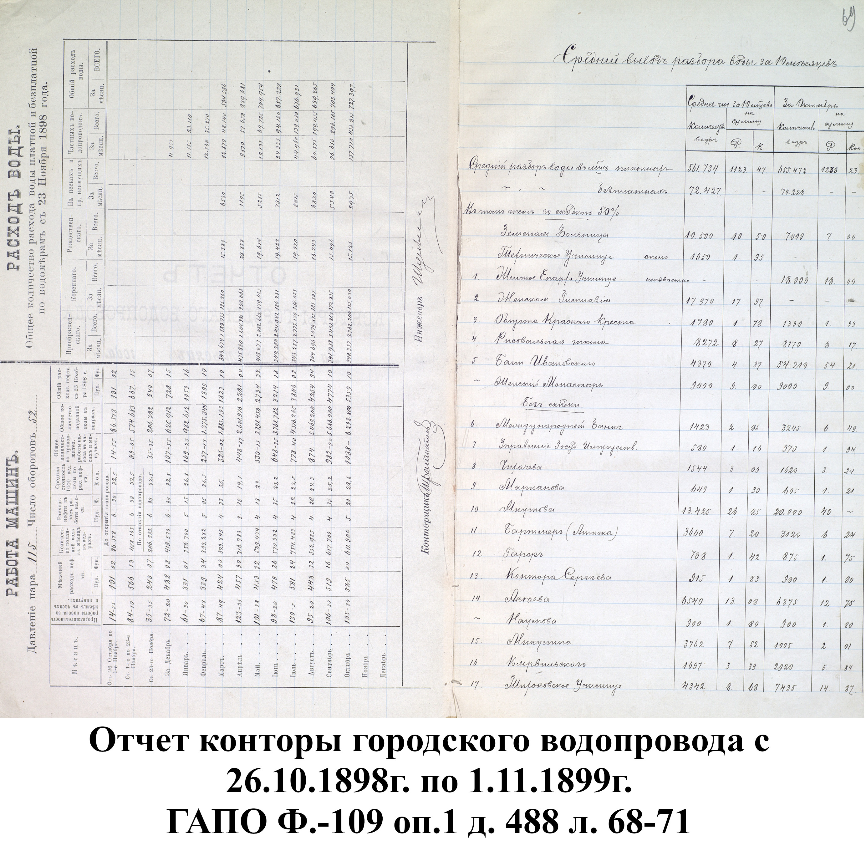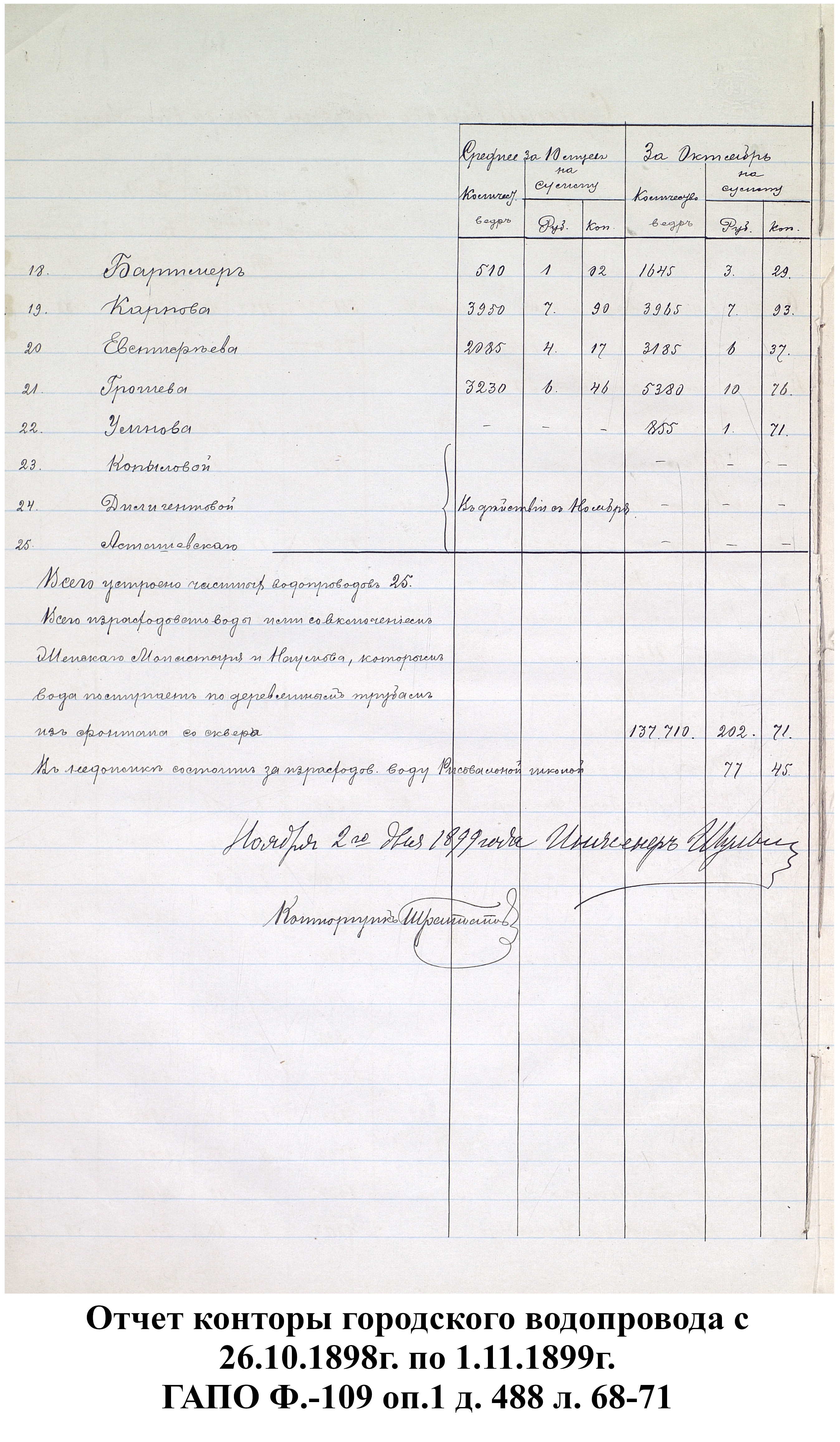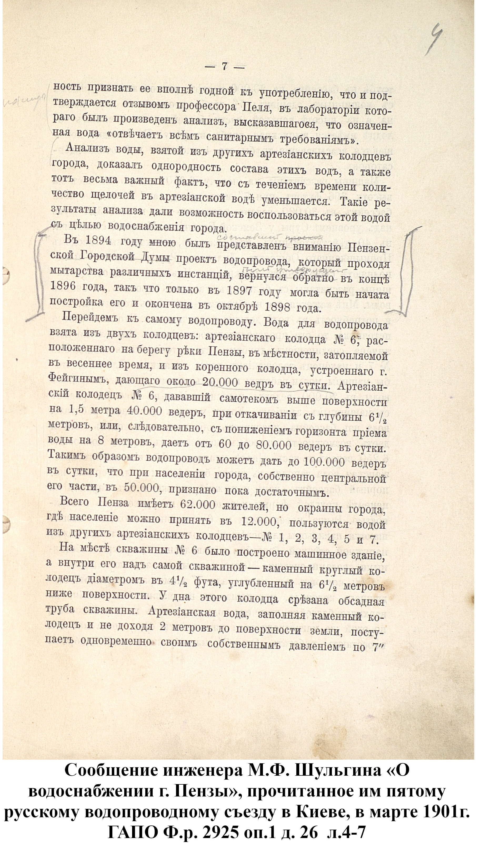 Таким образом, к 1898 году город получал в день со скважин 173 тысячи ведер воды из 26 водоразборных будок (22 будки от 5 скважин и 4 от «Коренного» колодца). Так как в Пензе в то время проживало около 60 тысяч человек, то получалось, что на каждого жителя в сутки приходилось менее 3 ведер чистой воды, если не брать в расчет использование воды из рек.