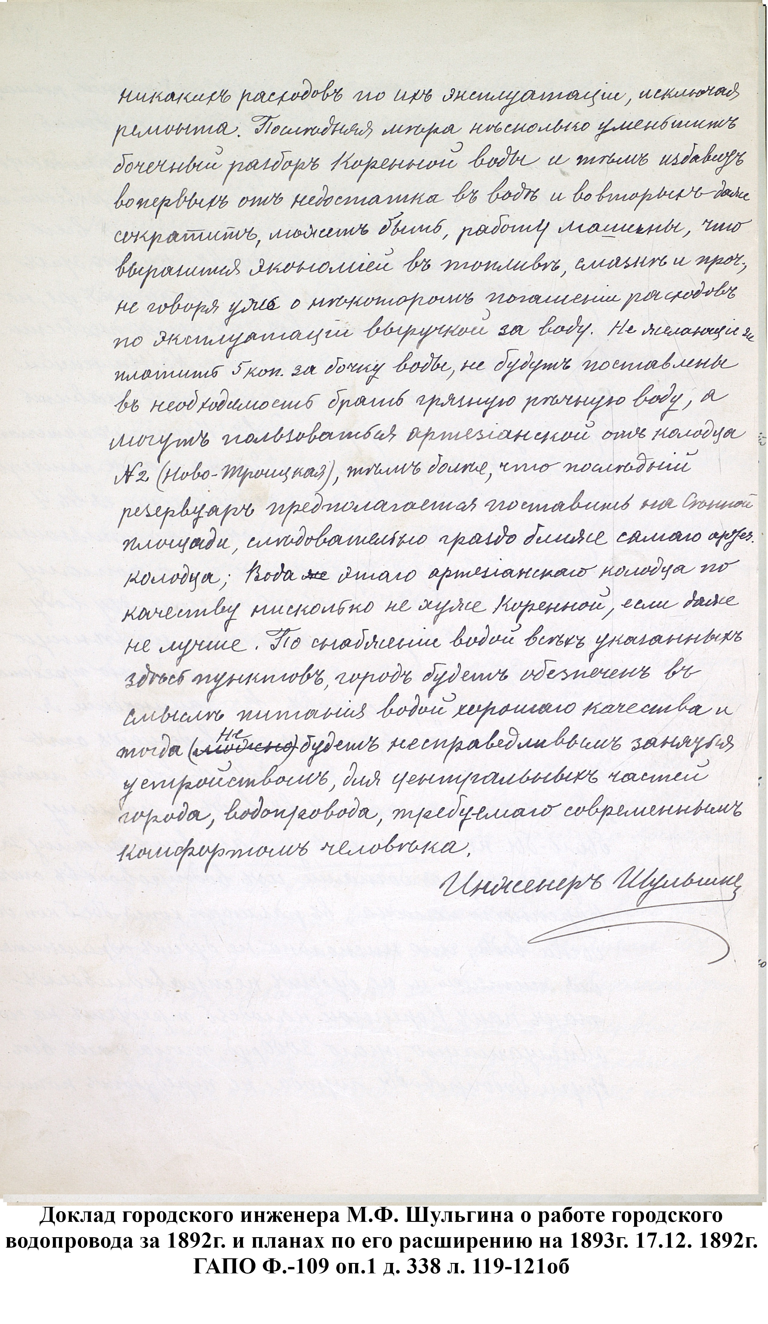 Хорошее качество воды этого колодца привлекло к нему внимание городского общественного управления, и он был постепенно углубляем и расширяем. В конце 1880-х годов глубина его достигла 27 — 32 метра. Была поставлена небольшая паровая машина для накачивания воды, которая затем по деревянным трубам пропускалась в город. Проекты по возможному увеличению объемов получаемой воды с восемнадцати тысяч ведер в сутки до ста тысяч ведер так и остались проектами М.Ф.Шульгина, однако колодцем решено было воспользоваться для устройства водопровода в нескольких кварталах нижней части города и в 1890г. он был ремонтирован.