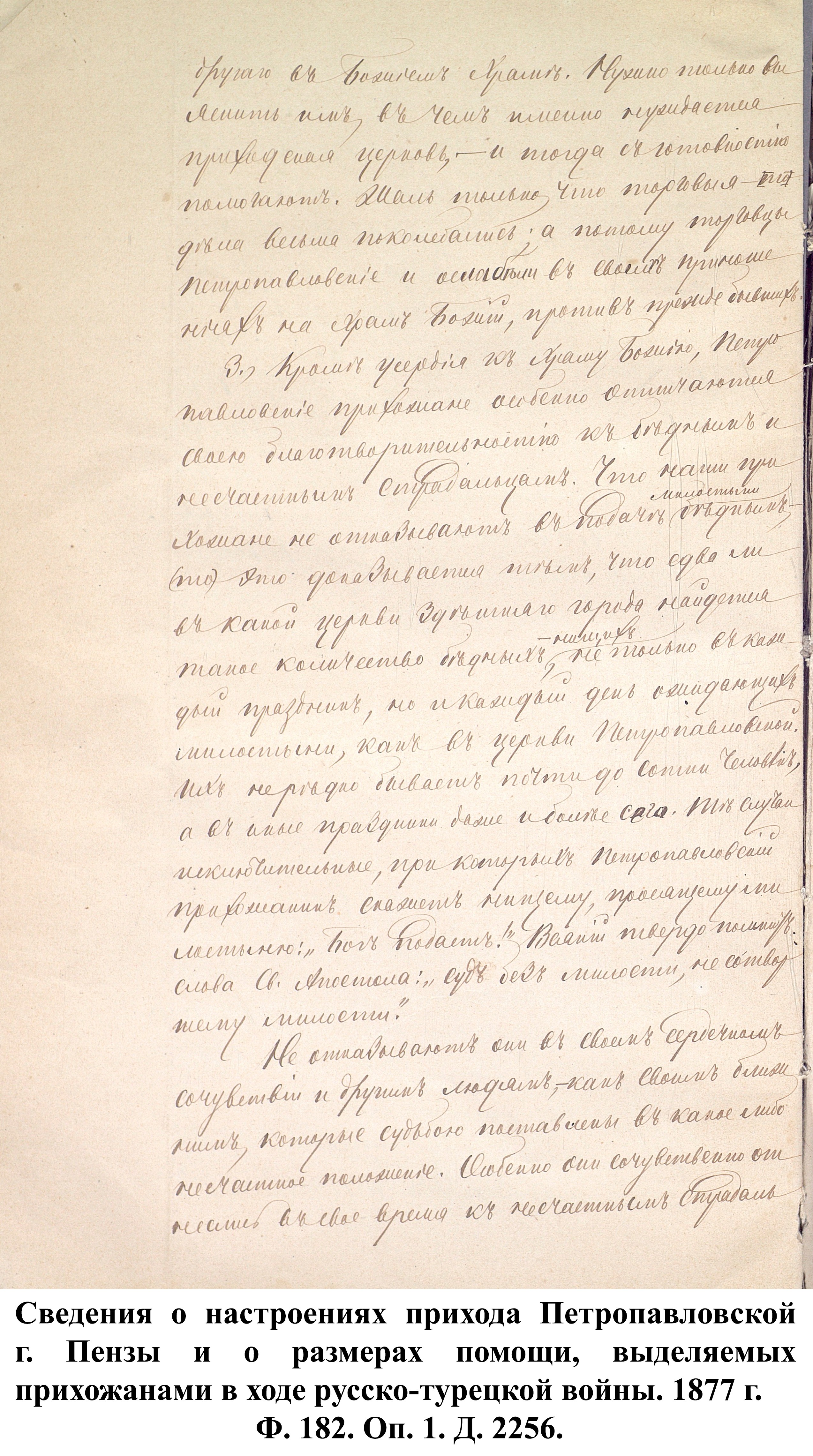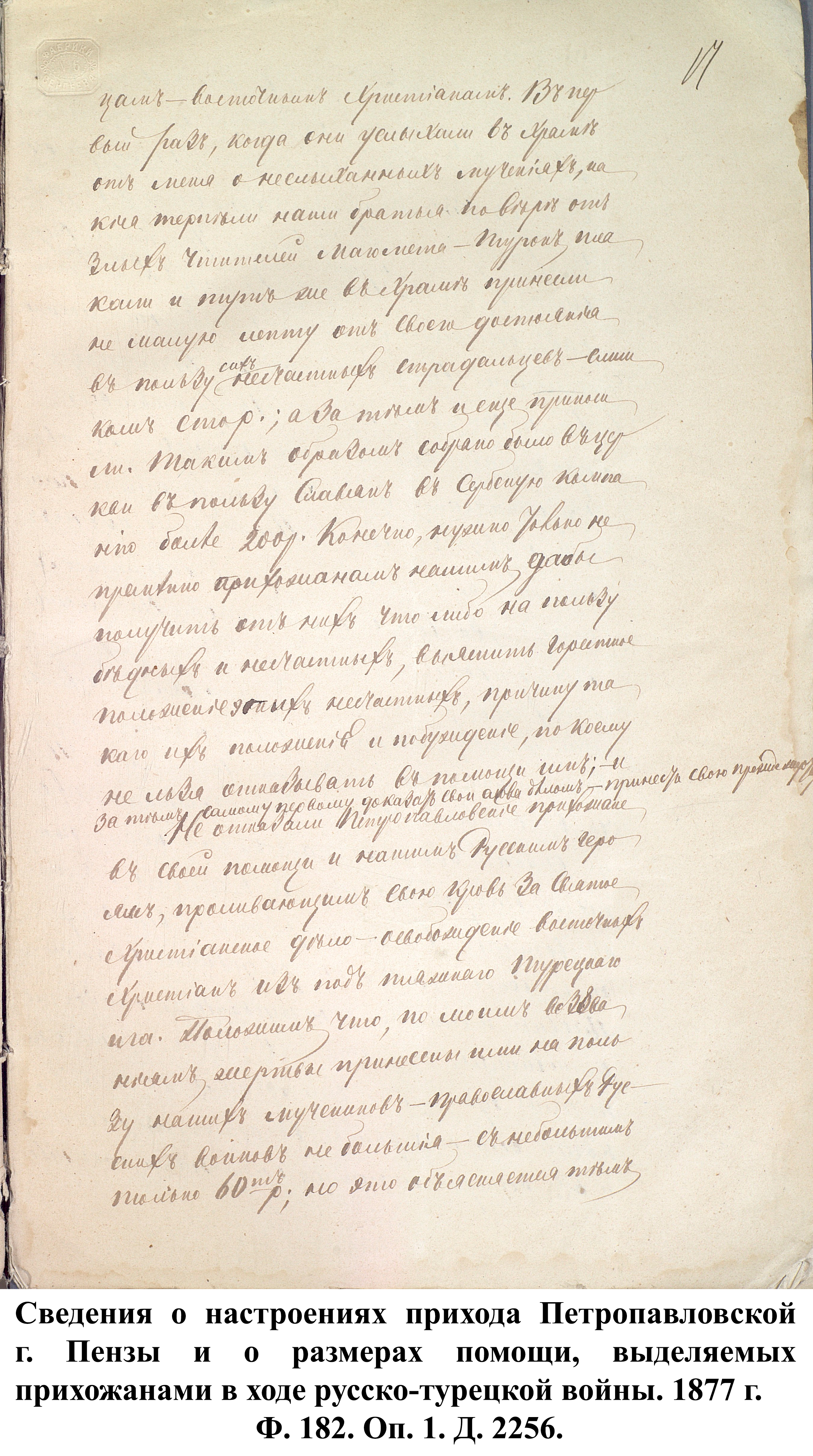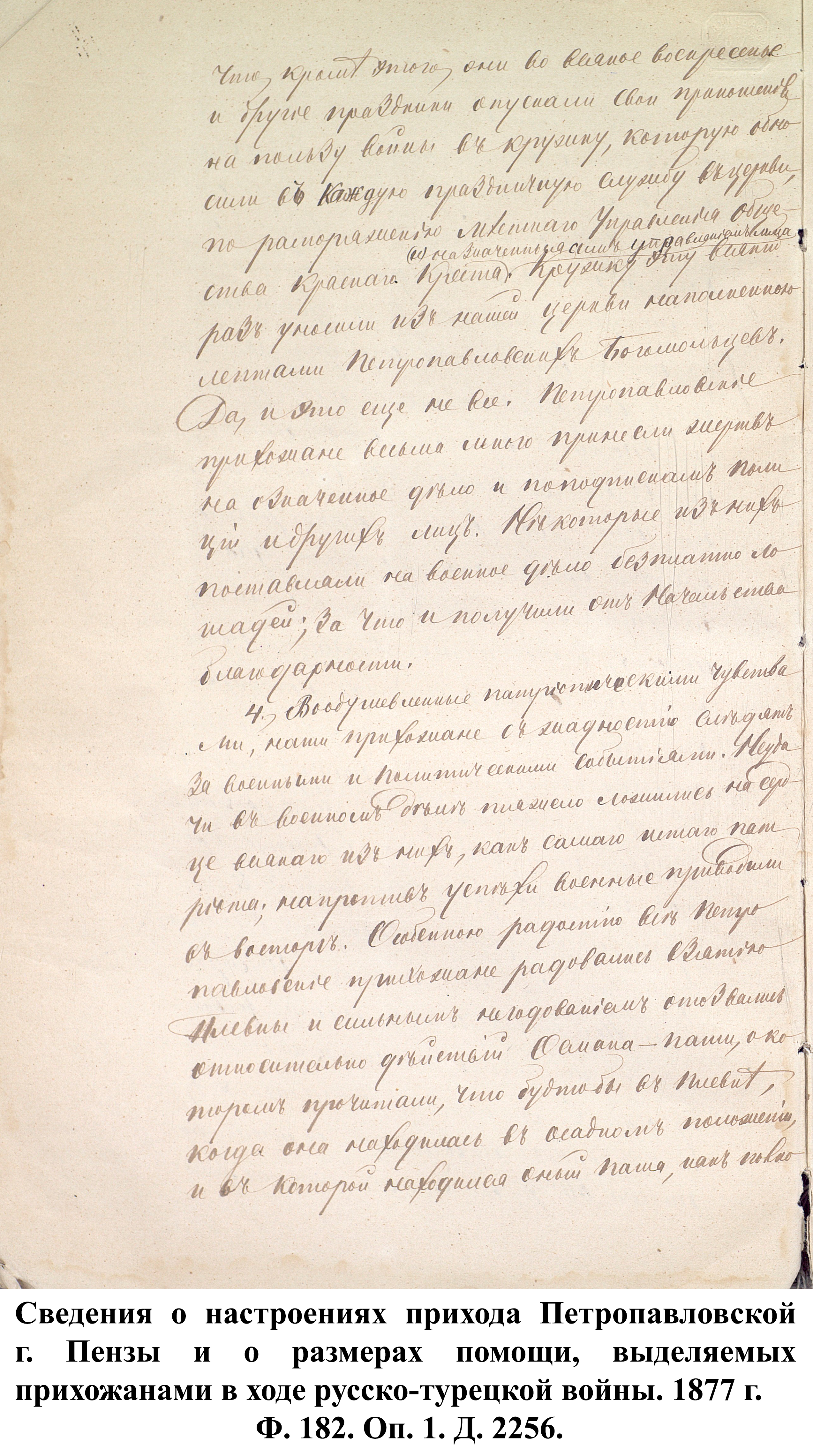 Простые жители Пензенской губернии не оставались безучастными в желании помочь солдатам, участвовавшим в боевых действиях. Описывая религиозно-нравственное состояние прихода в 1877 г., протоирей Петропавловской церкви г. Пензы Пётр Секторов указывал, что, несмотря на то, что по его воззванию в пользу воинов была пожертвована небольшая сумма в размере 60 руб., «кроме того, они во всякое воскресенье и другие праздники опускали свои приношения на пользу войны в кружку, которую обносили в каждую праздничную службу в церкви, по распоряжению местного управления Красного креста… Некоторые из них поставляли на военное дело бесплатно лошадей; за что и получили от начальства благодарности». «Воодушевлённые патриотическими чувствами, наши прихожане с хладностию следят за военными и политическими событиями. Неудачи в военном деле тяжело ложились на сердце всякого из них, как самого истового патриота; напротив, успехи военные приводили в восторг. Особенно радостно все петропавловские прихожане радовались взятию Плевны и сильным негодованием отозвались относительно действий [в Плевне] Османа-Паши …». Резюмируя, Пётр Секторов заявил, что все его прихожане желают мира, но мира прочного и достойного России. Схожие чувства патриотизма описывал священник Иоанно-Богословской церкви г. Троицка Матвей Дилигентов, заключив, что «настоящая война близка для сердца русского народа».