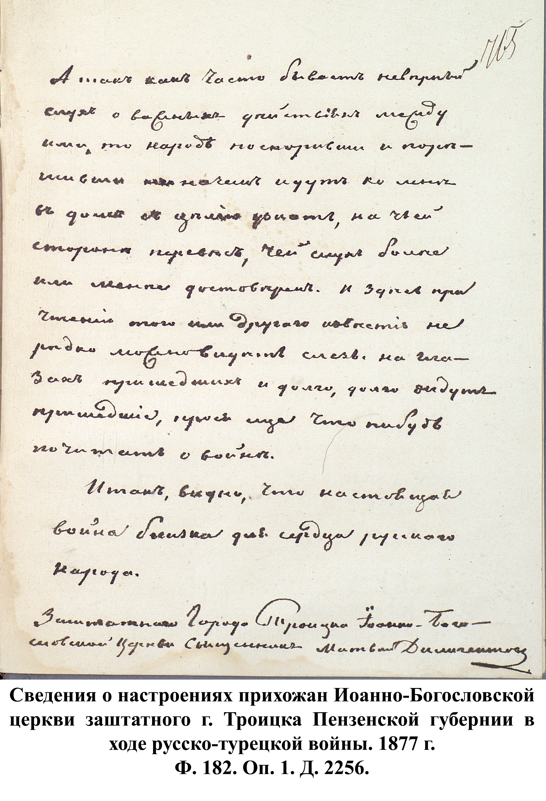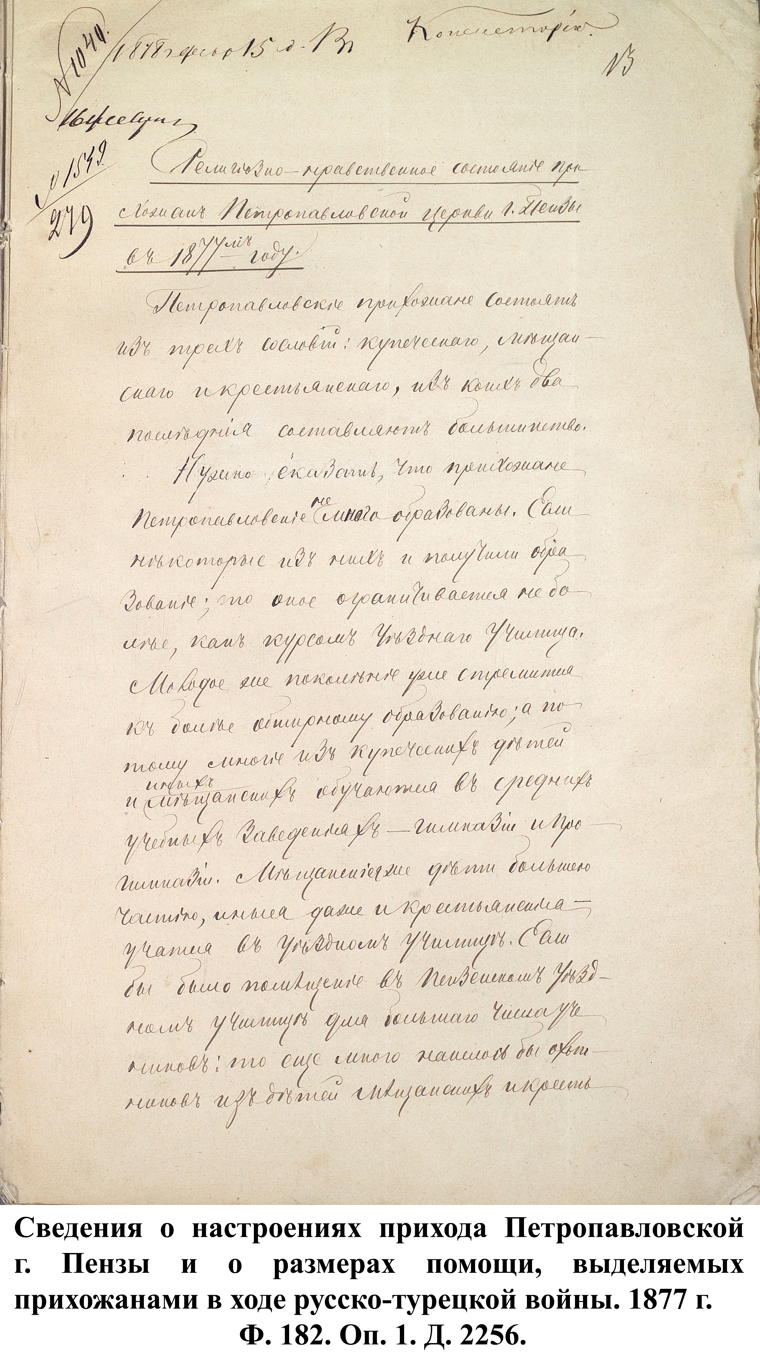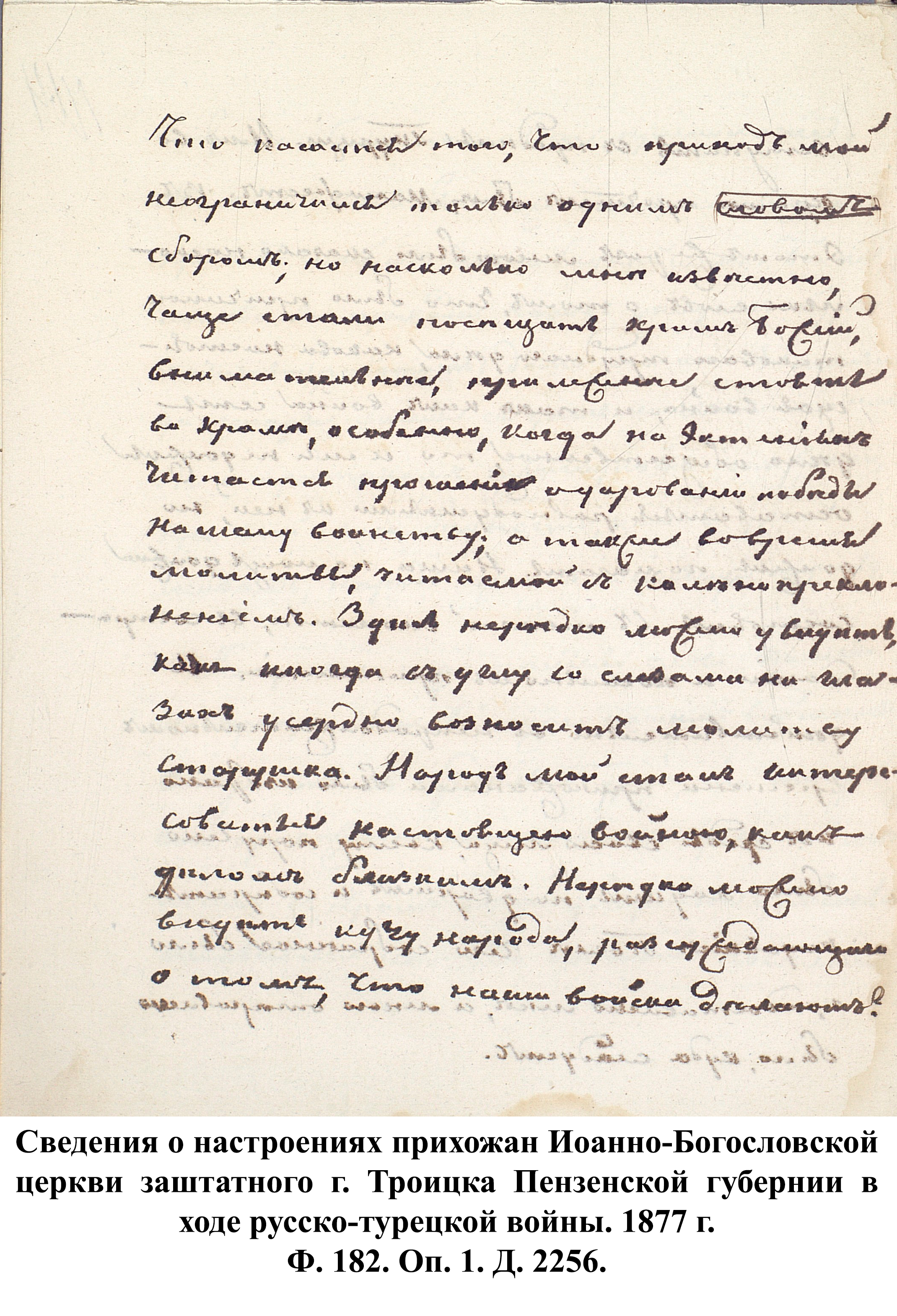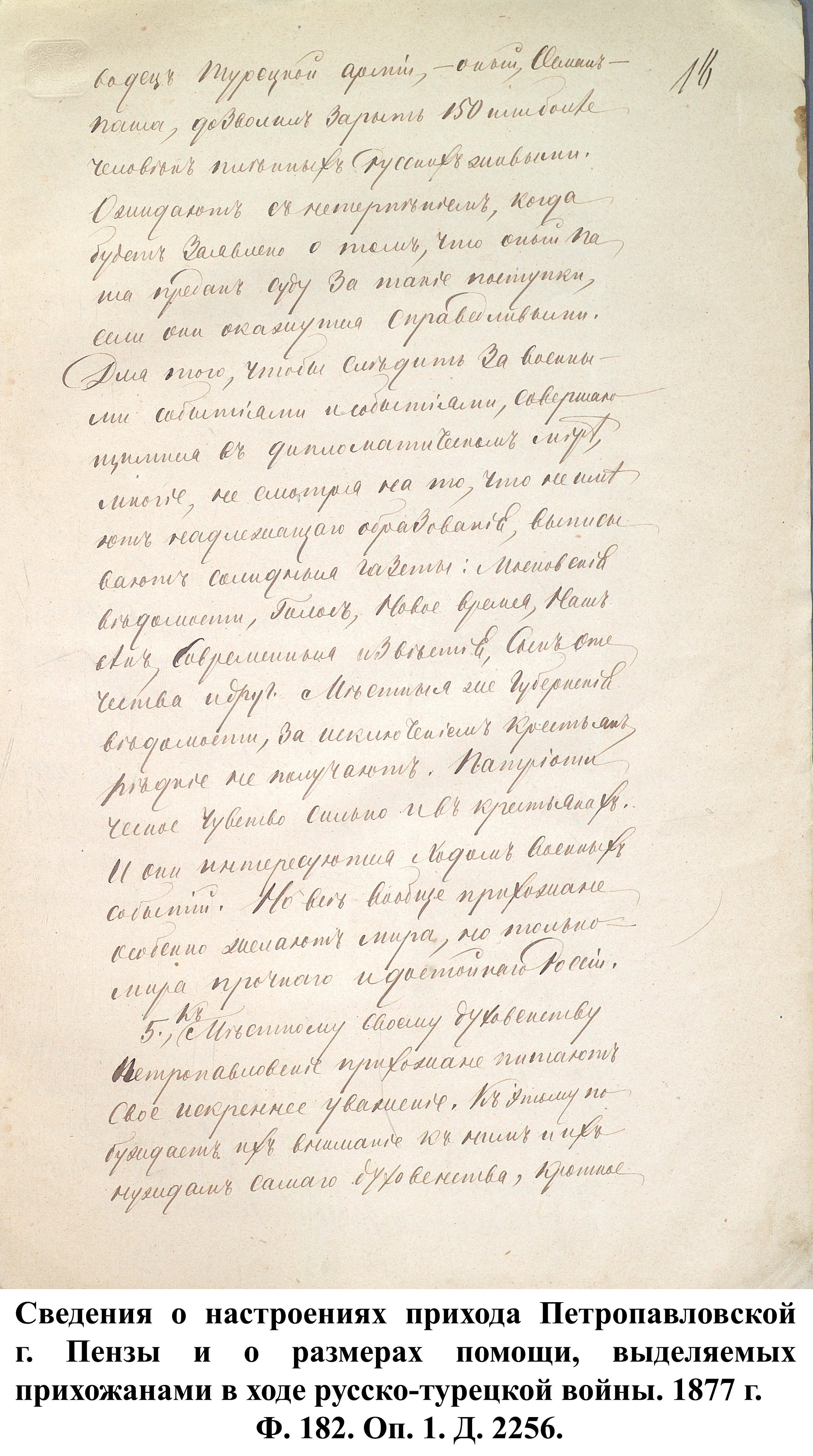 Простые жители Пензенской губернии не оставались безучастными в желании помочь солдатам, участвовавшим в боевых действиях. Описывая религиозно-нравственное состояние прихода в 1877 г., протоирей Петропавловской церкви г. Пензы Пётр Секторов указывал, что, несмотря на то, что по его воззванию в пользу воинов была пожертвована небольшая сумма в размере 60 руб., «кроме того, они во всякое воскресенье и другие праздники опускали свои приношения на пользу войны в кружку, которую обносили в каждую праздничную службу в церкви, по распоряжению местного управления Красного креста… Некоторые из них поставляли на военное дело бесплатно лошадей; за что и получили от начальства благодарности». «Воодушевлённые патриотическими чувствами, наши прихожане с хладностию следят за военными и политическими событиями. Неудачи в военном деле тяжело ложились на сердце всякого из них, как самого истового патриота; напротив, успехи военные приводили в восторг. Особенно радостно все петропавловские прихожане радовались взятию Плевны и сильным негодованием отозвались относительно действий [в Плевне] Османа-Паши …». Резюмируя, Пётр Секторов заявил, что все его прихожане желают мира, но мира прочного и достойного России. Схожие чувства патриотизма описывал священник Иоанно-Богословской церкви г. Троицка Матвей Дилигентов, заключив, что «настоящая война близка для сердца русского народа».