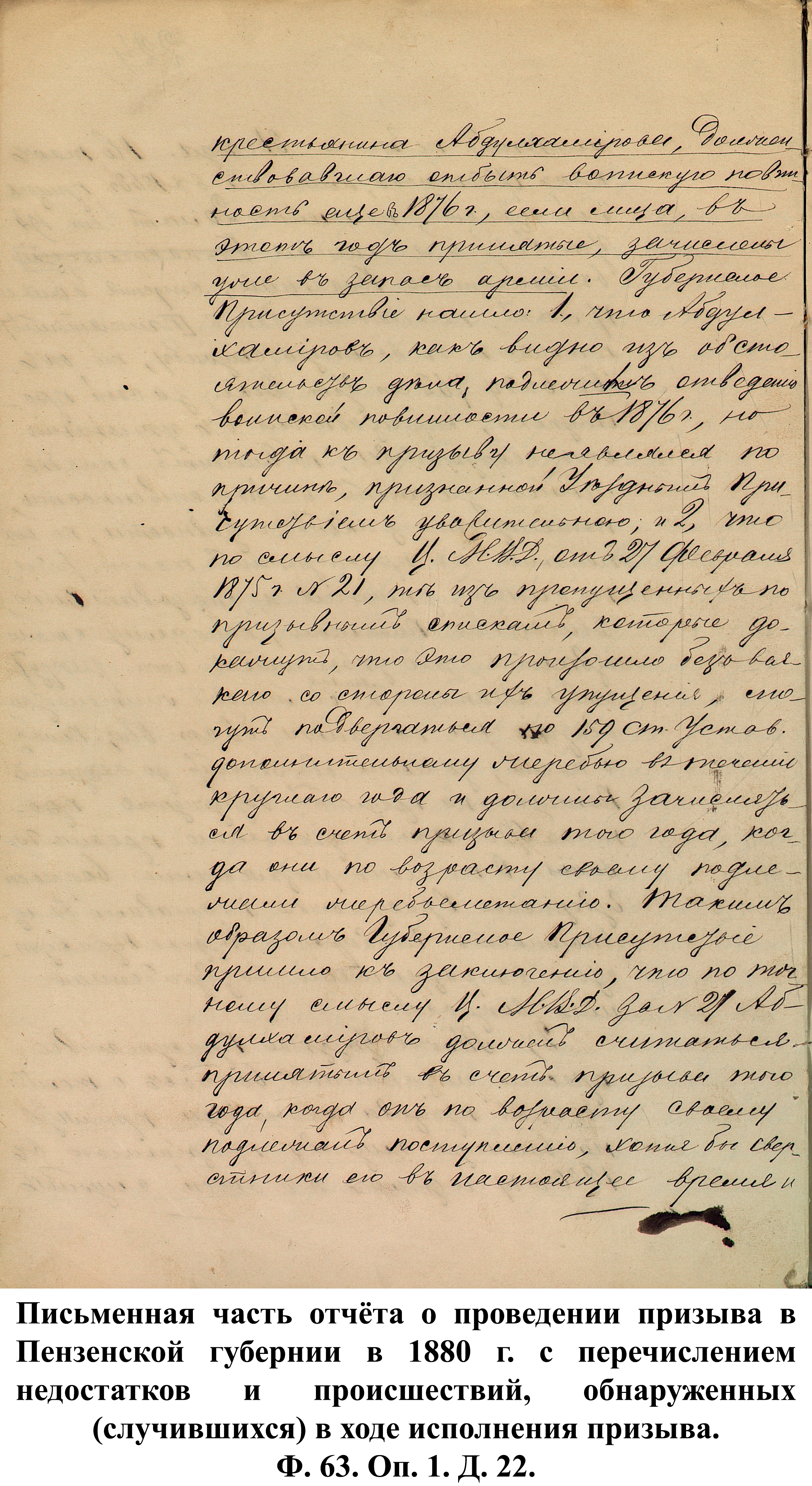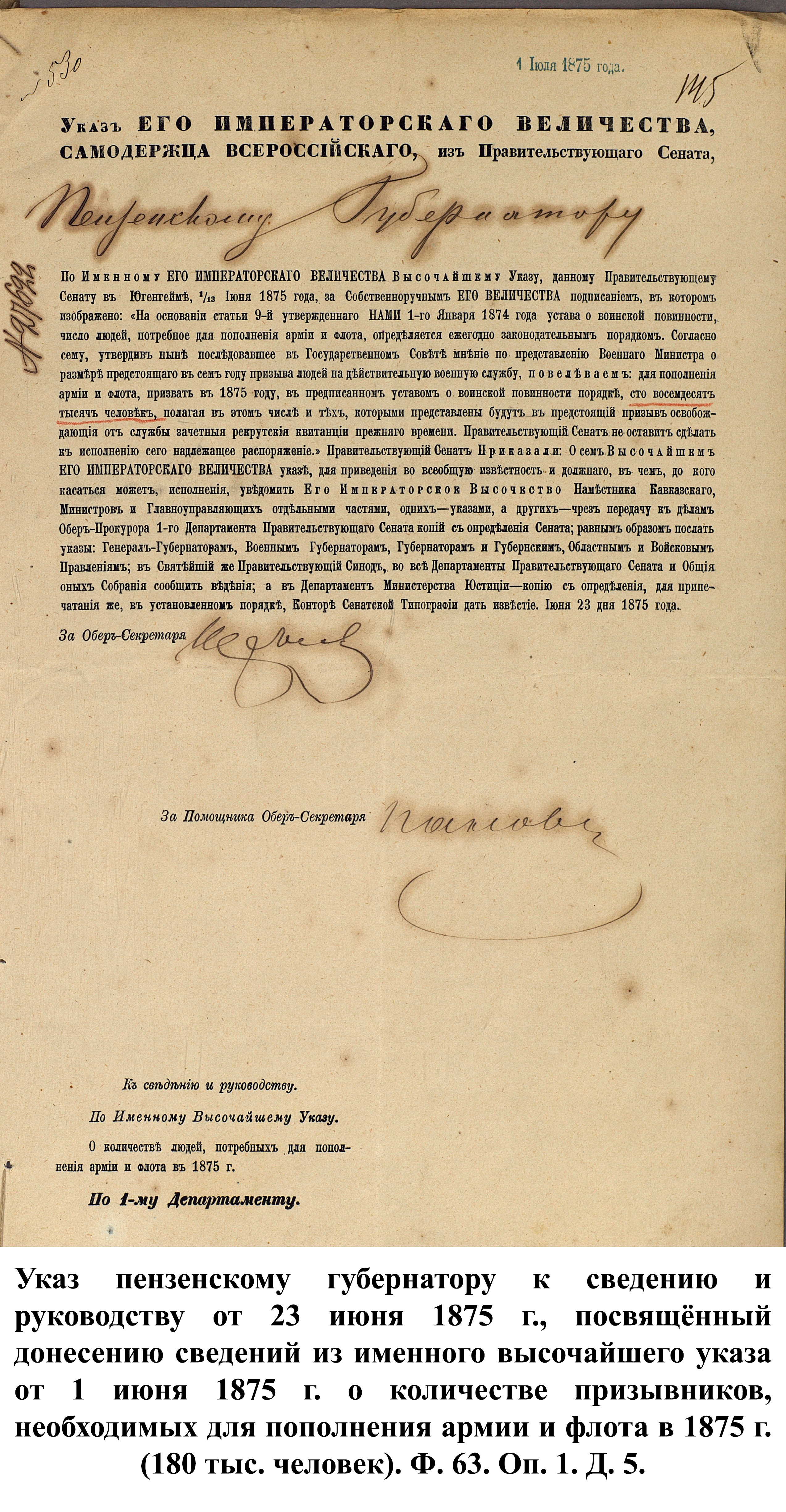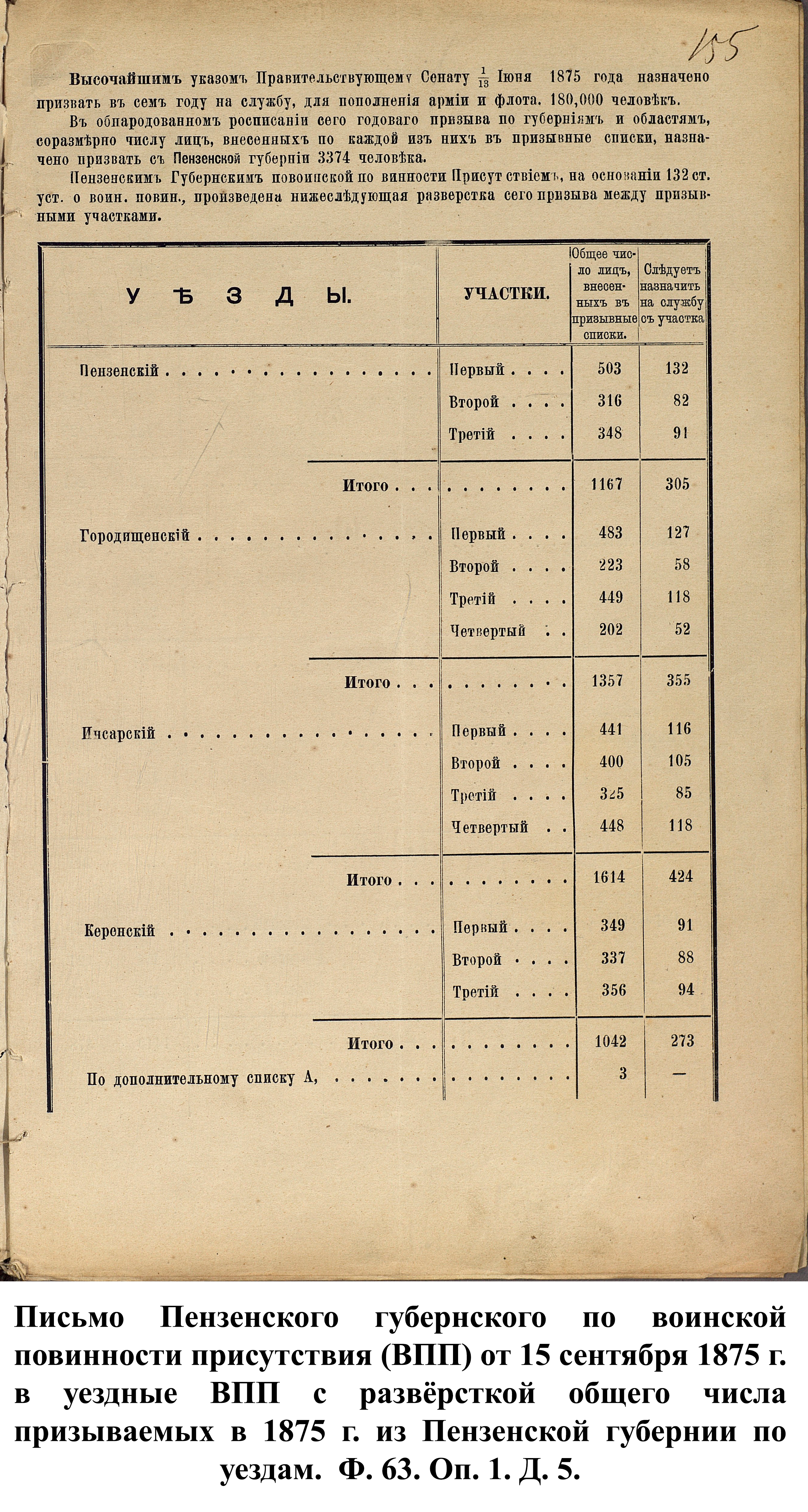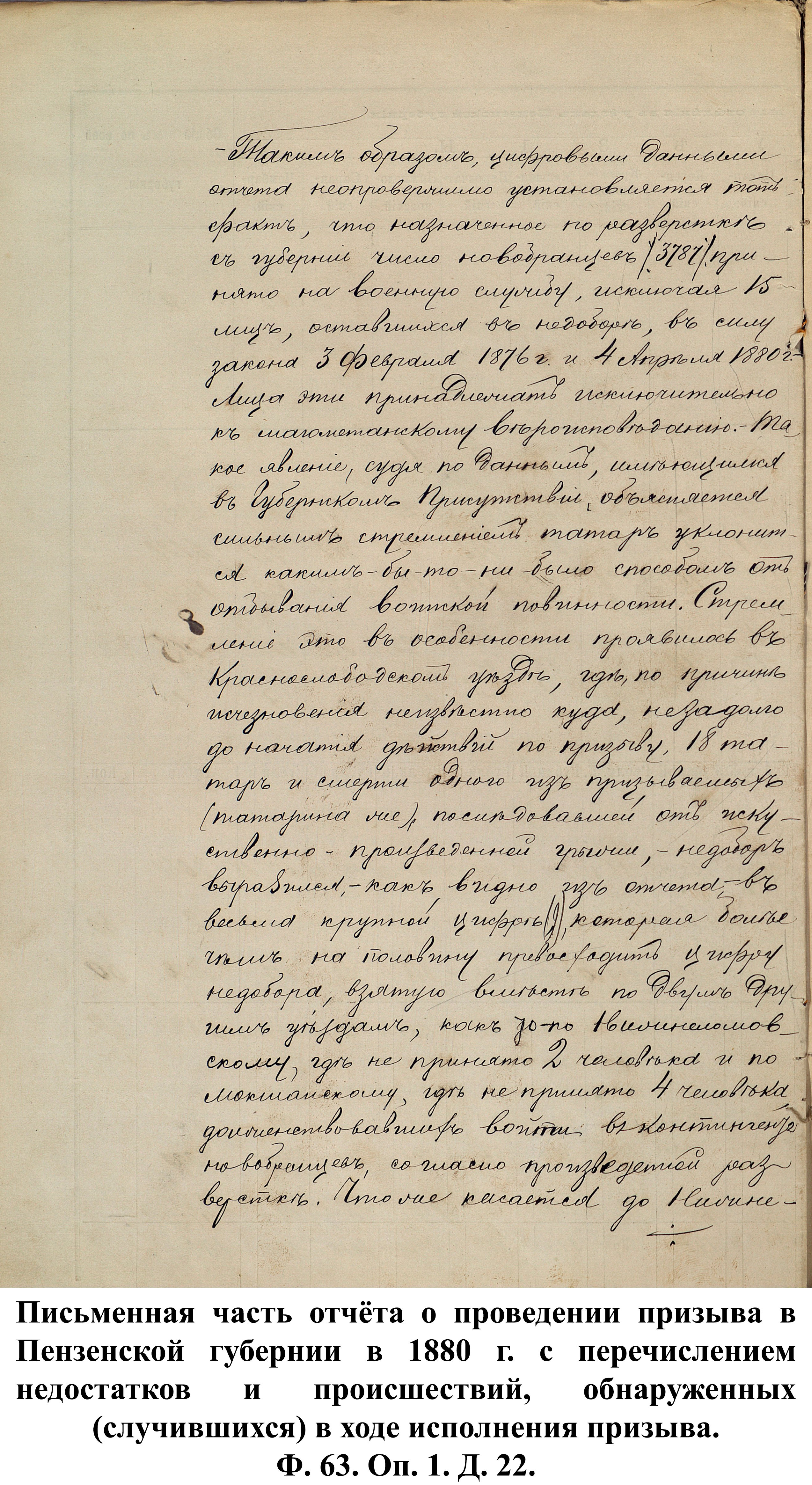 По указам императора Александра II от 23 июня и 25 августа 1875 г. к службе в армии должны были быть призваны 180000 чел., из них 3374 – из Пензенской губернии. 30 ноября 1875 г. пензенский губернатор А.А. Татищев выслал отчёт министру иностранных дел А.Е. Тимашеву и военному министру Д.А. Милюкову о полном выполнении набора необходимого числа новобранцев.