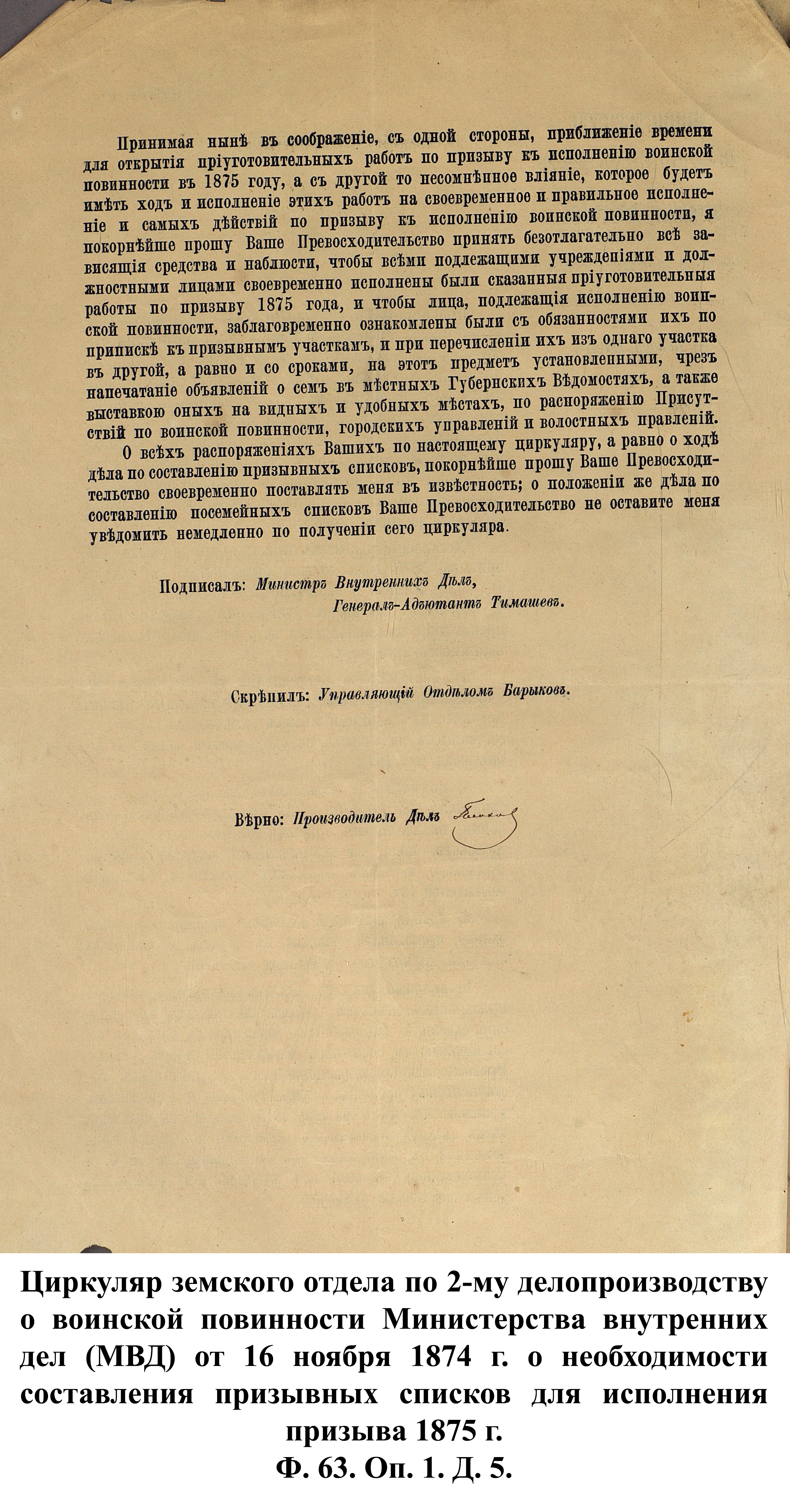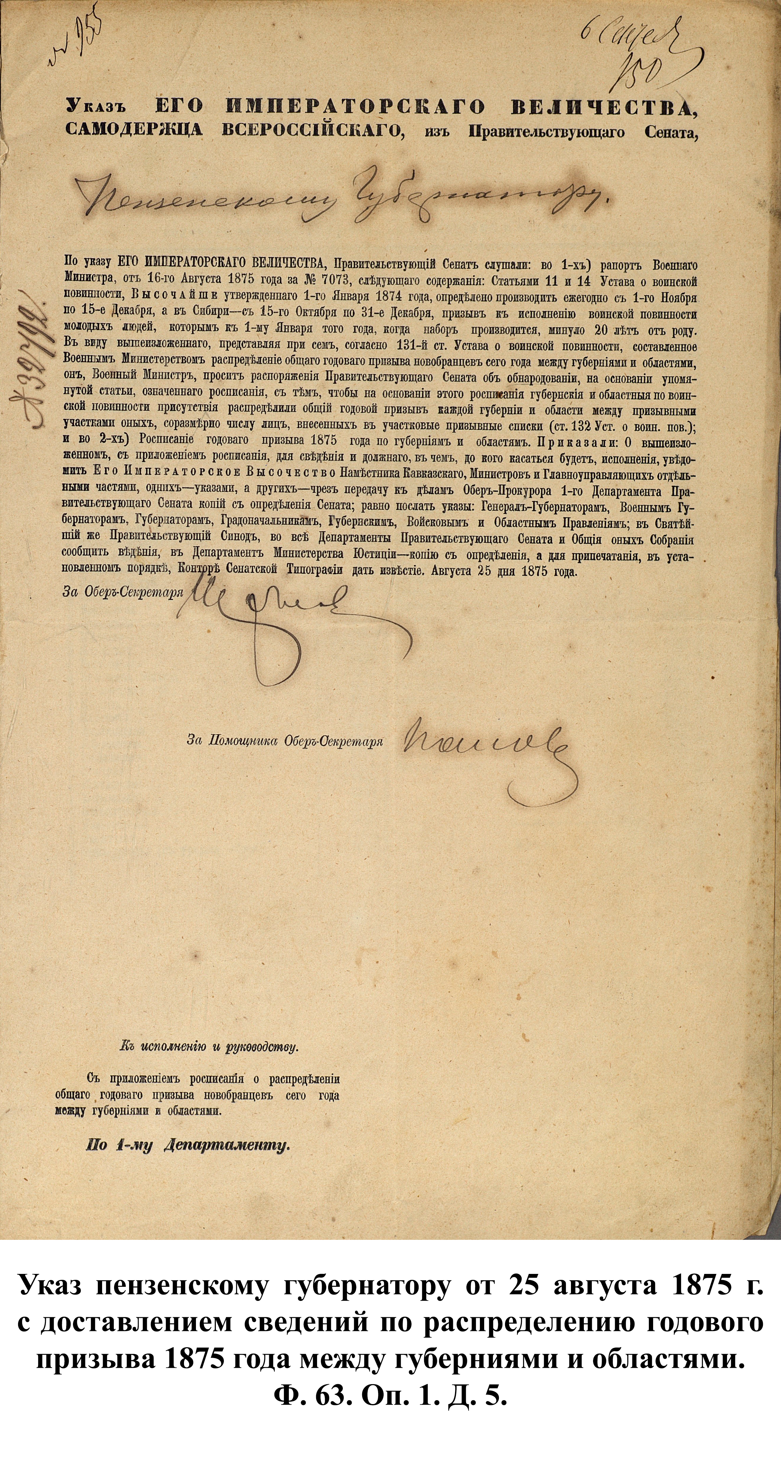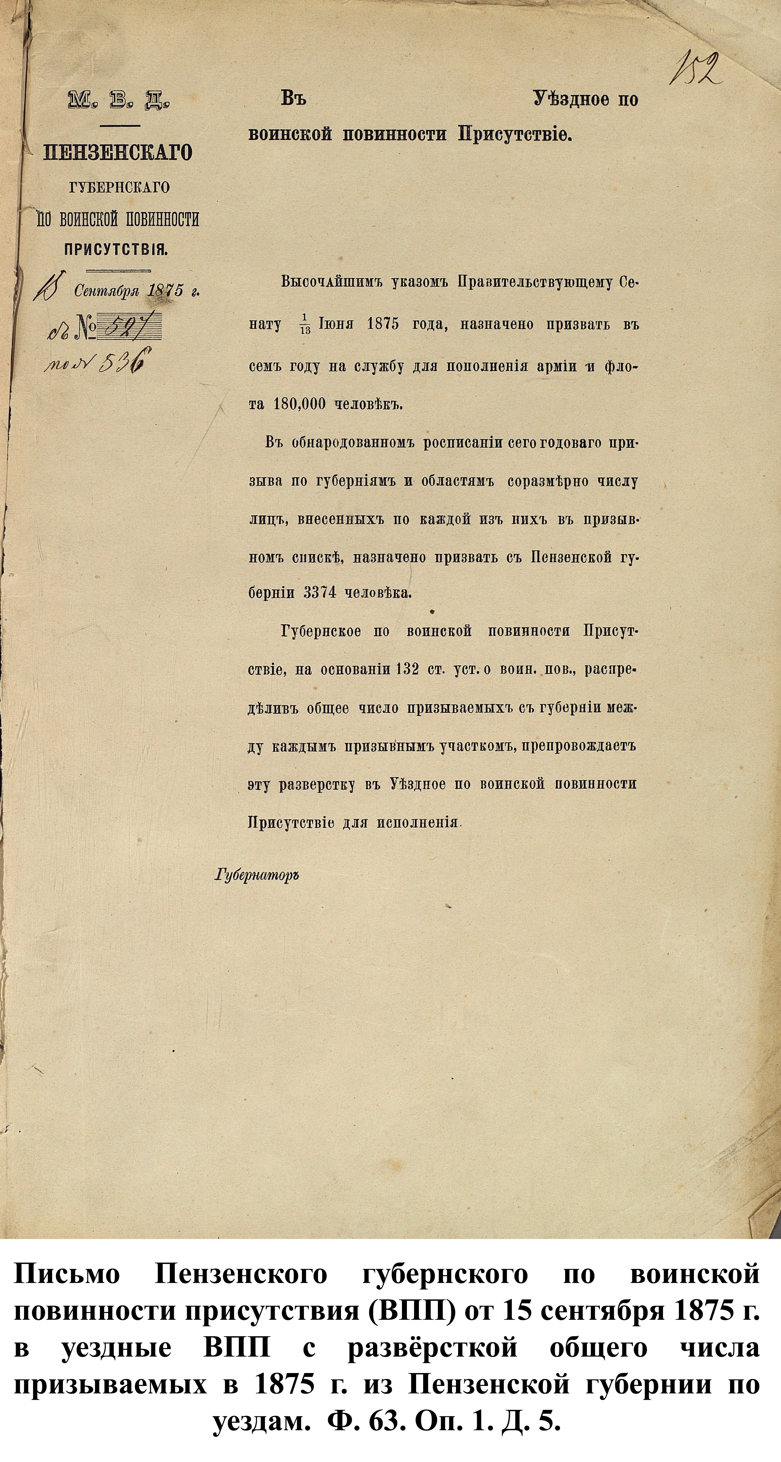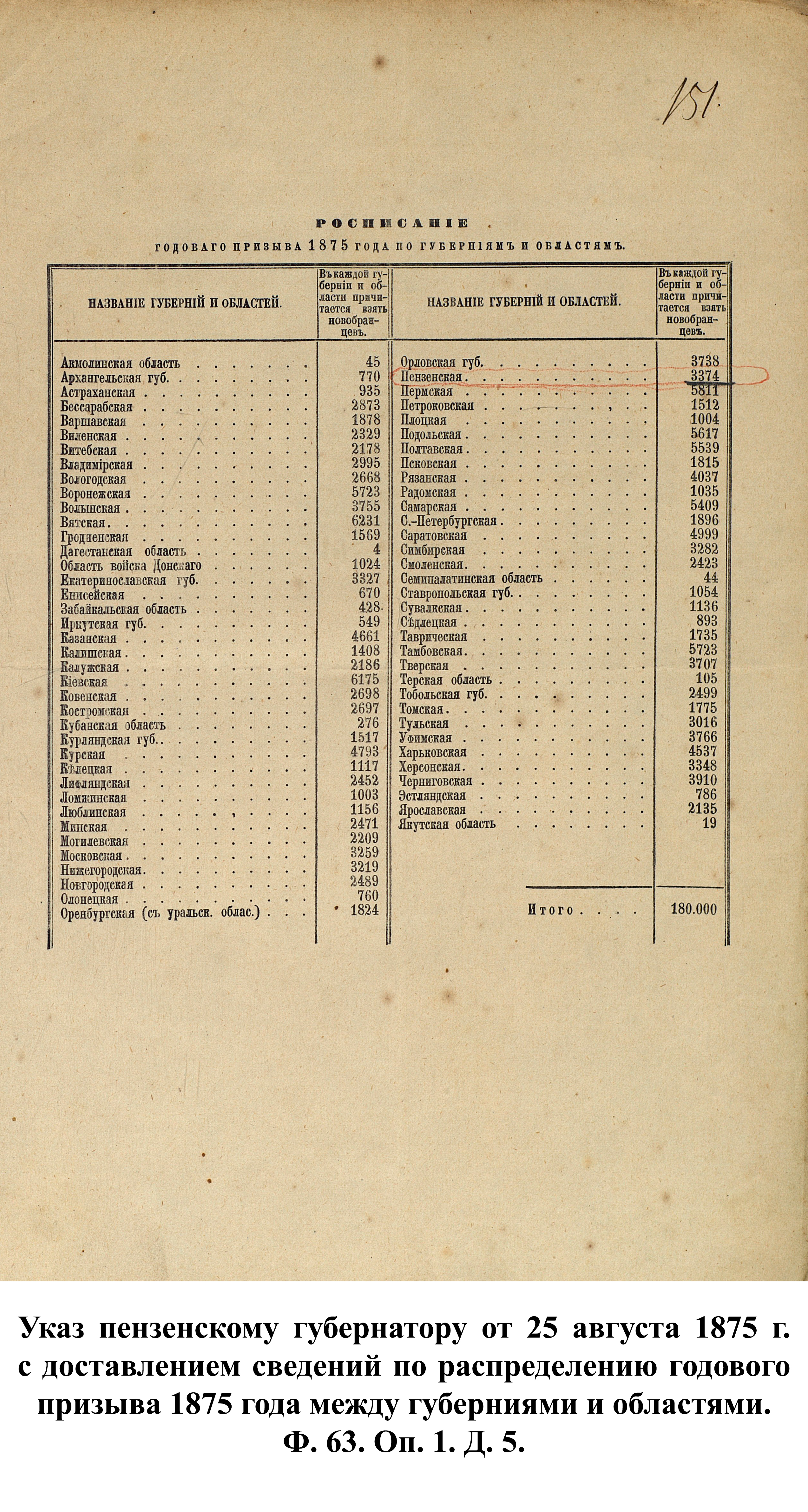 По указам императора Александра II от 23 июня и 25 августа 1875 г. к службе в армии должны были быть призваны 180000 чел., из них 3374 – из Пензенской губернии. 30 ноября 1875 г. пензенский губернатор А.А. Татищев выслал отчёт министру иностранных дел А.Е. Тимашеву и военному министру Д.А. Милюкову о полном выполнении набора необходимого числа новобранцев.