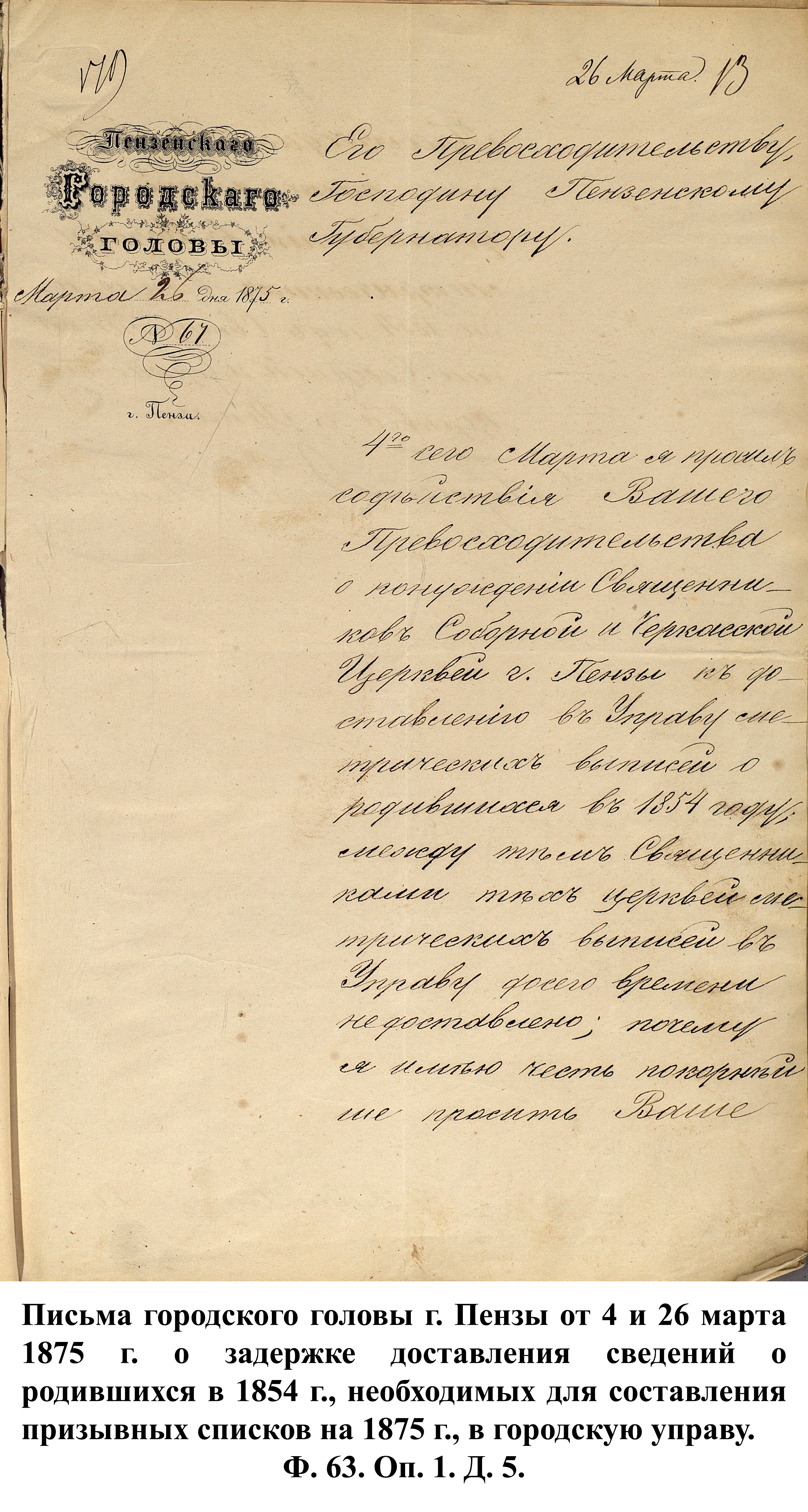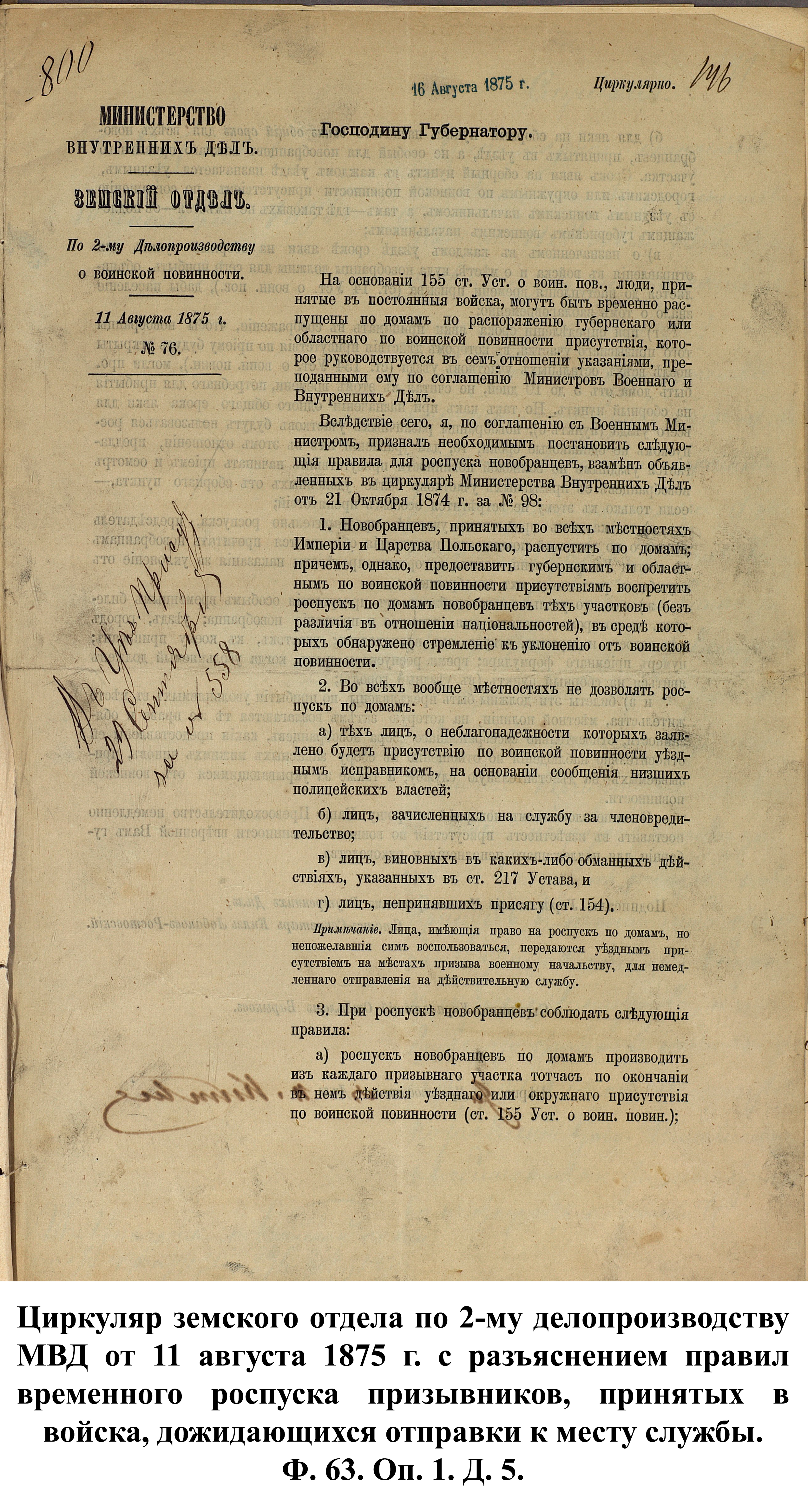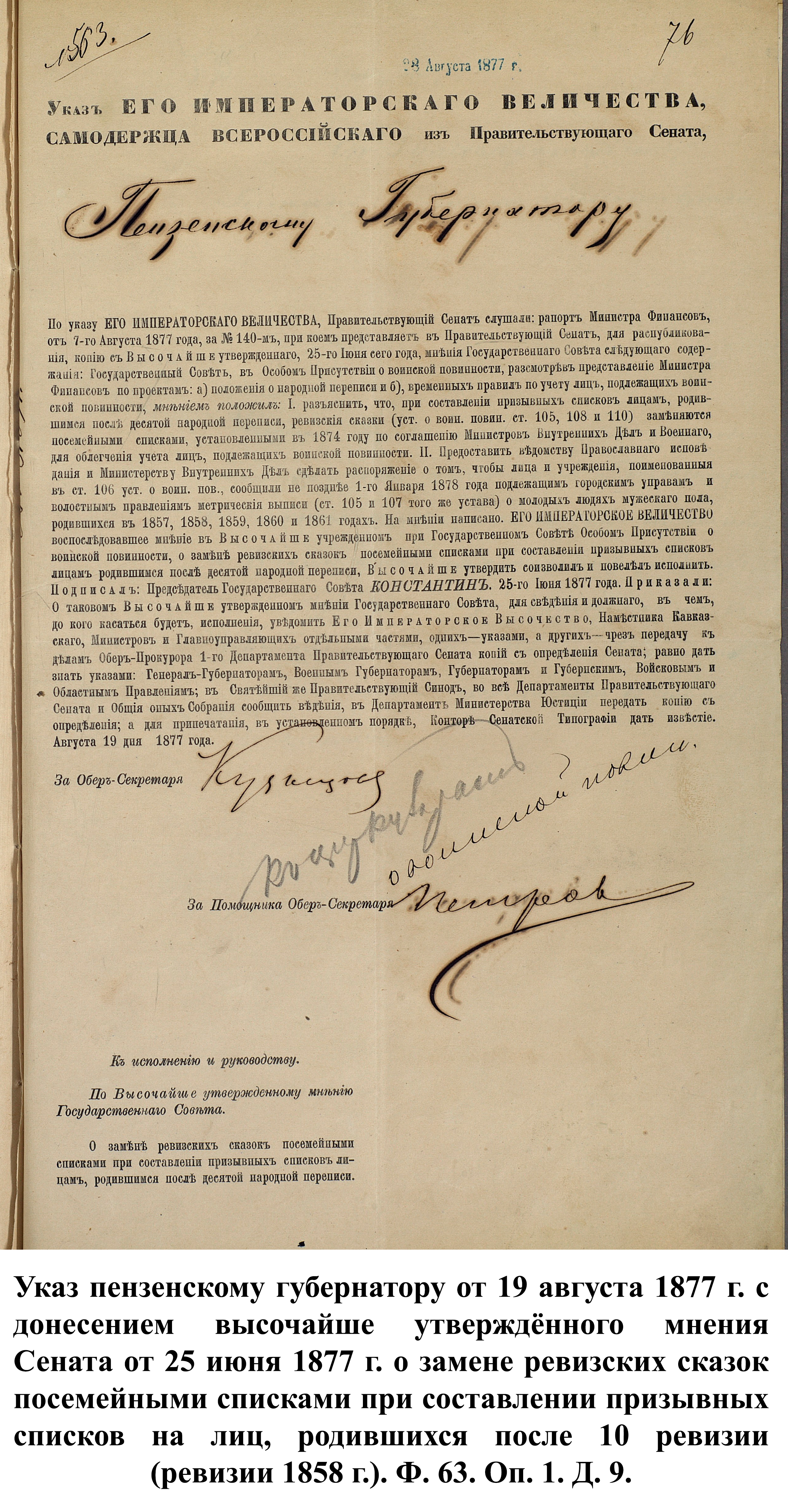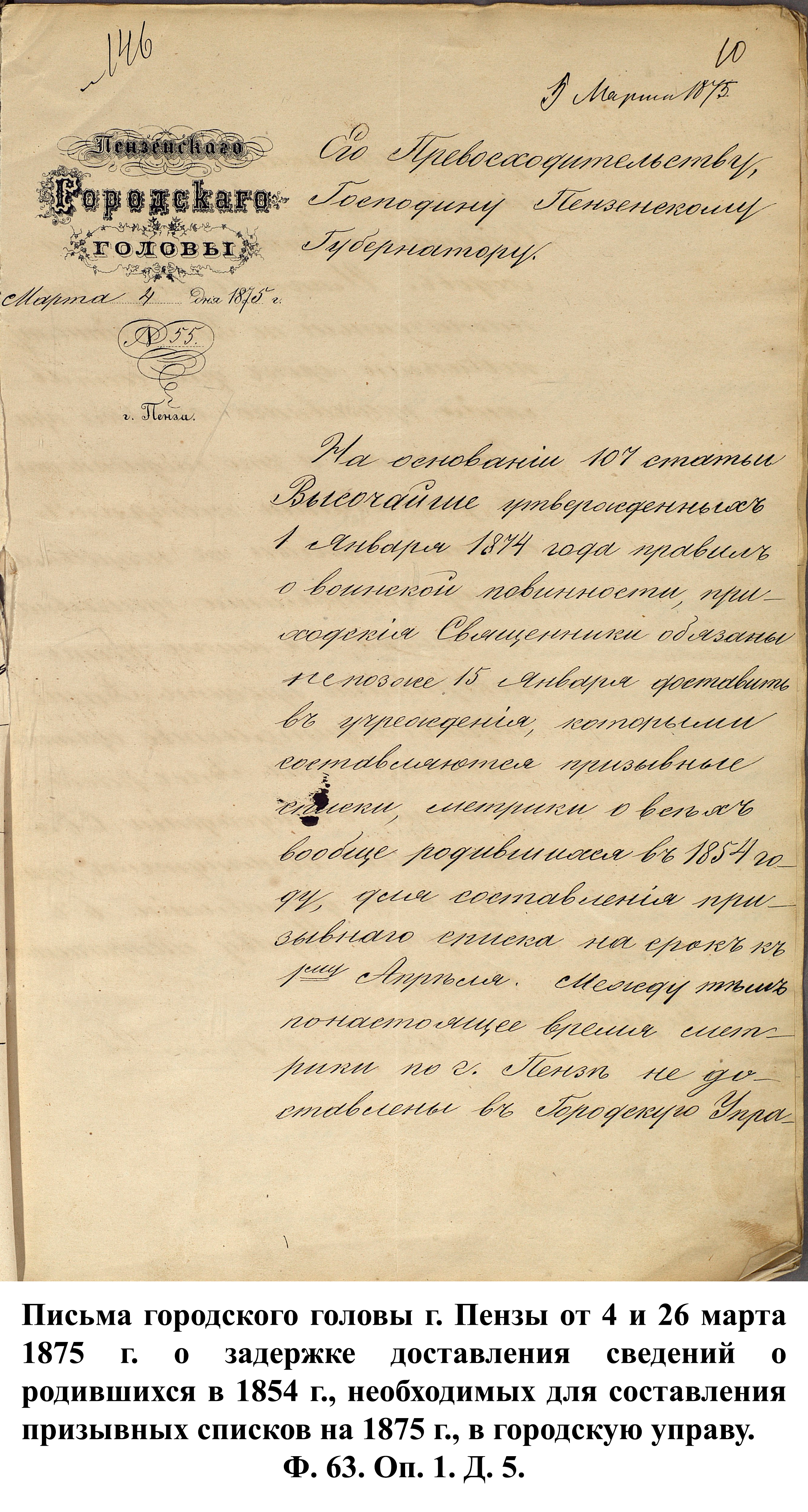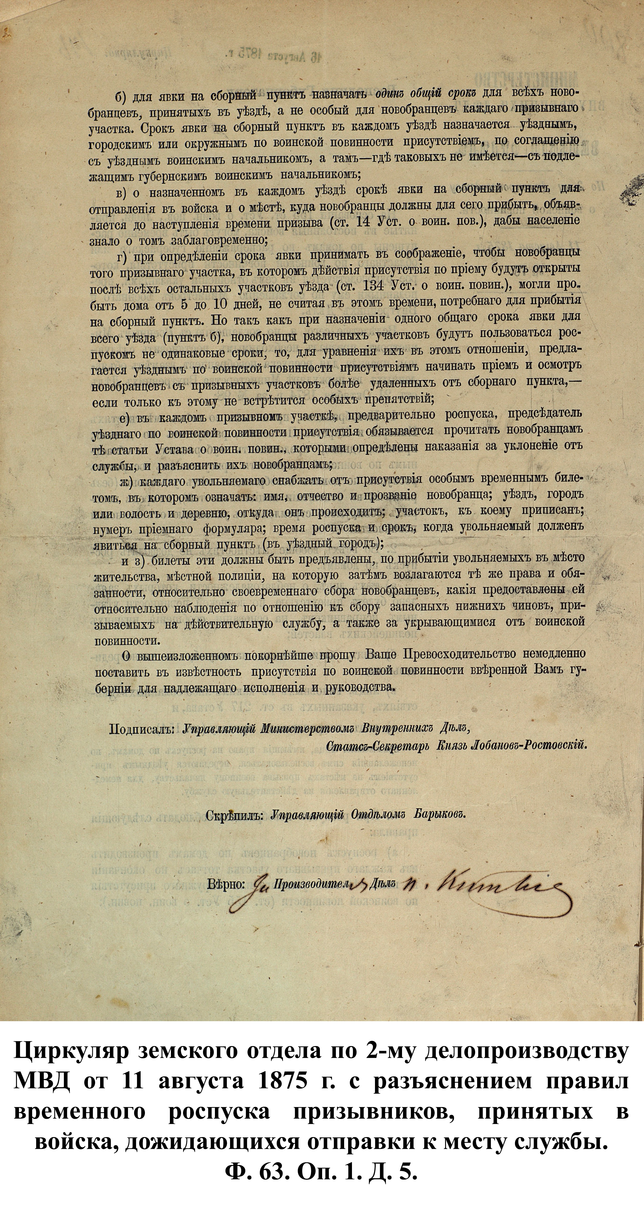 По указам императора Александра II от 23 июня и 25 августа 1875 г. к службе в армии должны были быть призваны 180000 чел., из них 3374 – из Пензенской губернии. 30 ноября 1875 г. пензенский губернатор А.А. Татищев выслал отчёт министру иностранных дел А.Е. Тимашеву и военному министру Д.А. Милюкову о полном выполнении набора необходимого числа новобранцев.