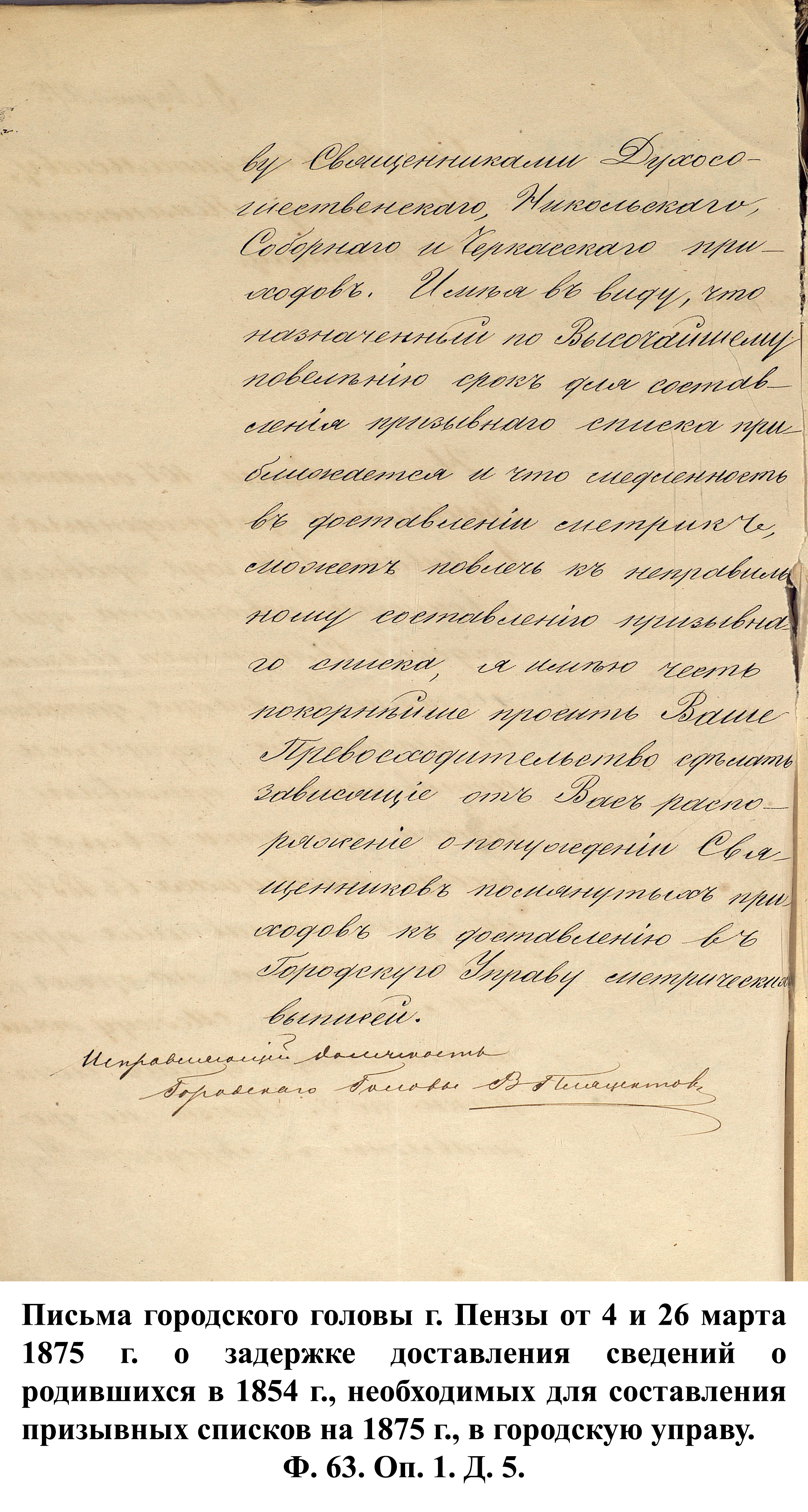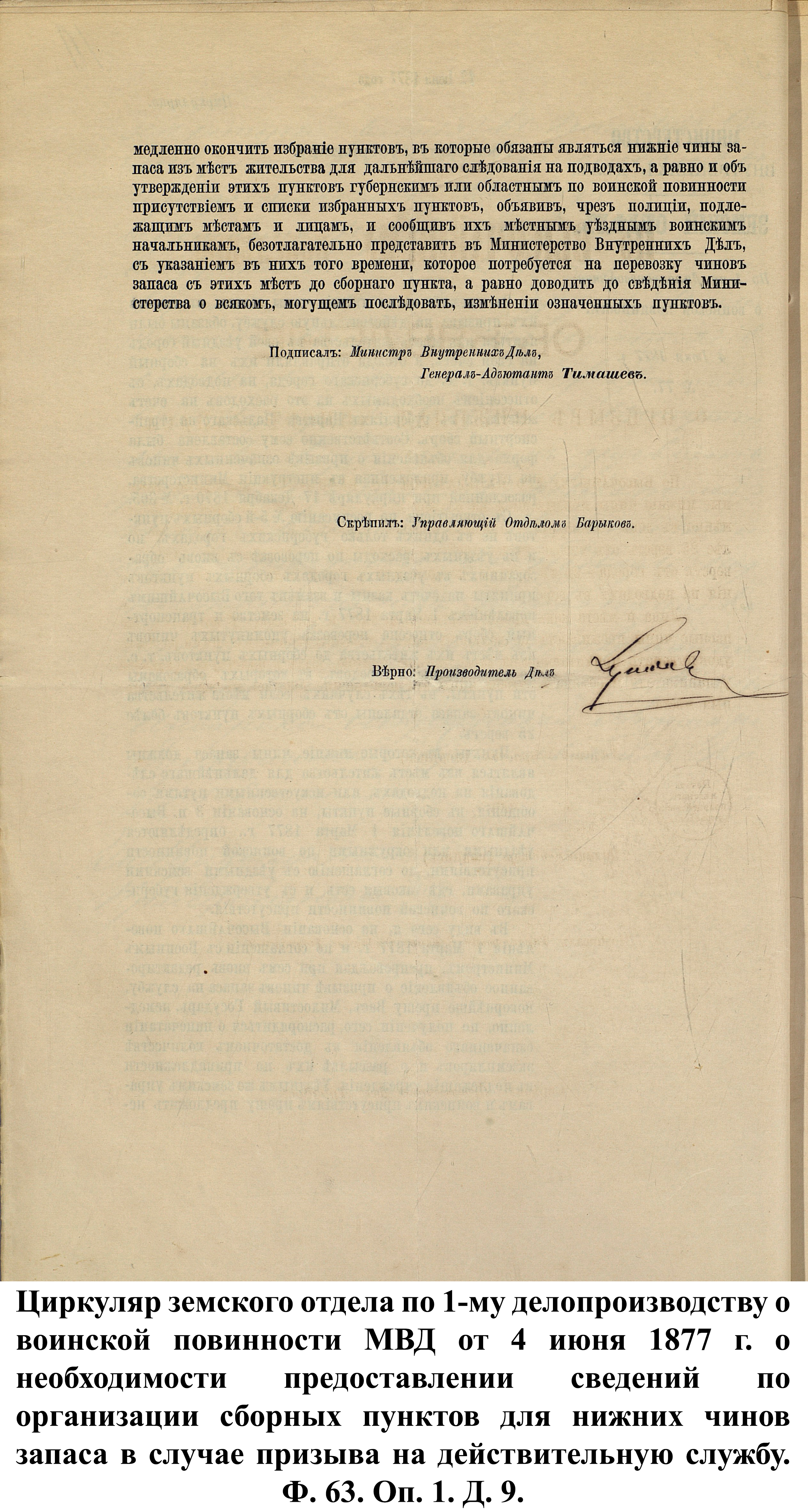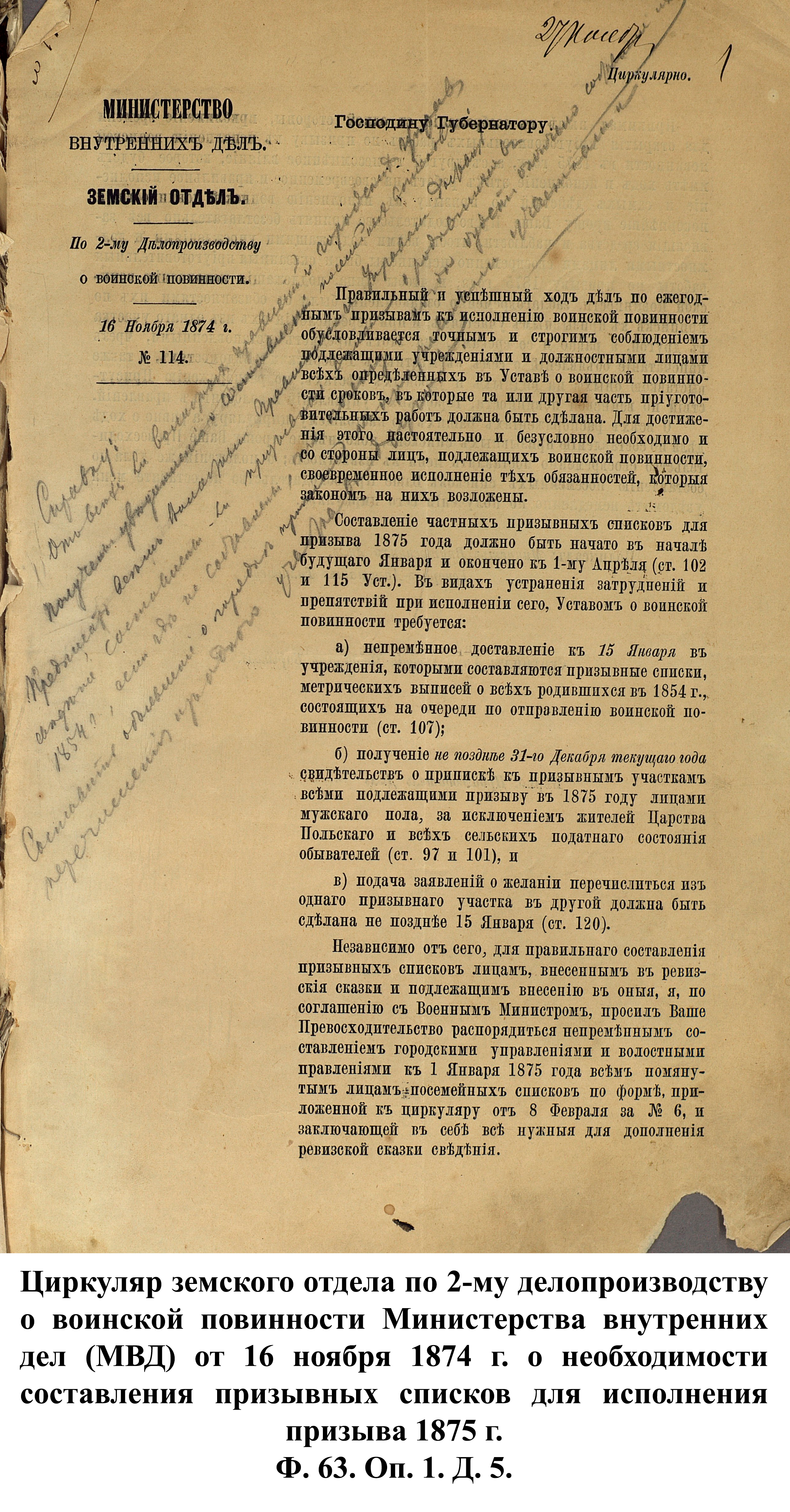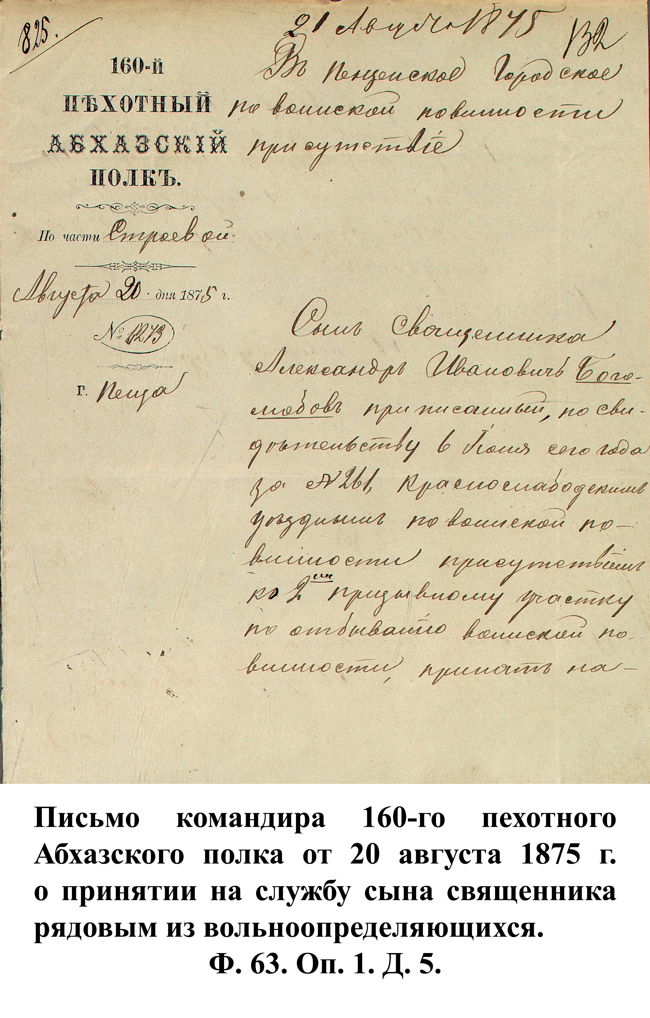По указам императора Александра II от 23 июня и 25 августа 1875 г. к службе в армии должны были быть призваны 180000 чел., из них 3374 – из Пензенской губернии. 30 ноября 1875 г. пензенский губернатор А.А. Татищев выслал отчёт министру иностранных дел А.Е. Тимашеву и военному министру Д.А. Милюкову о полном выполнении набора необходимого числа новобранцев.