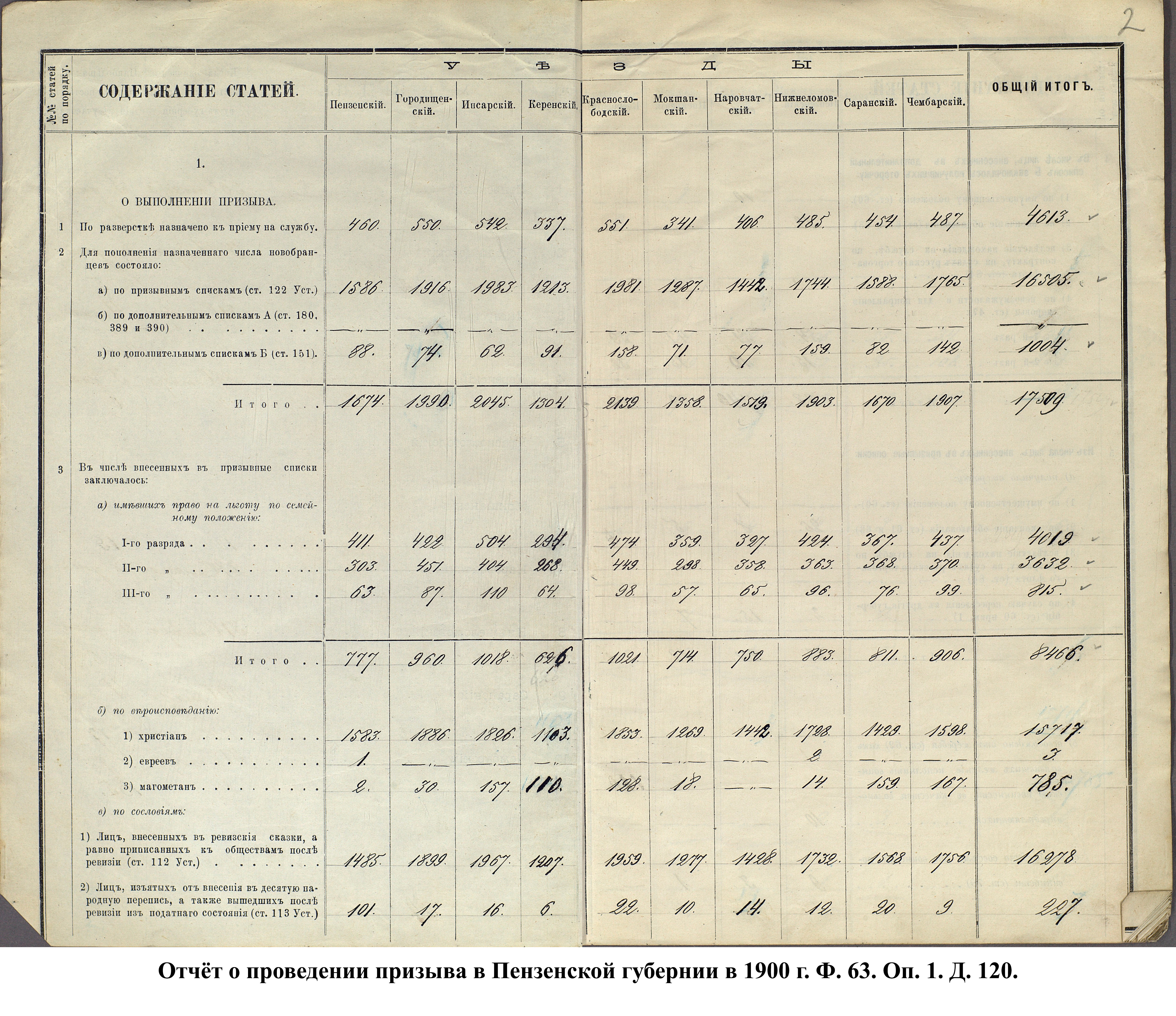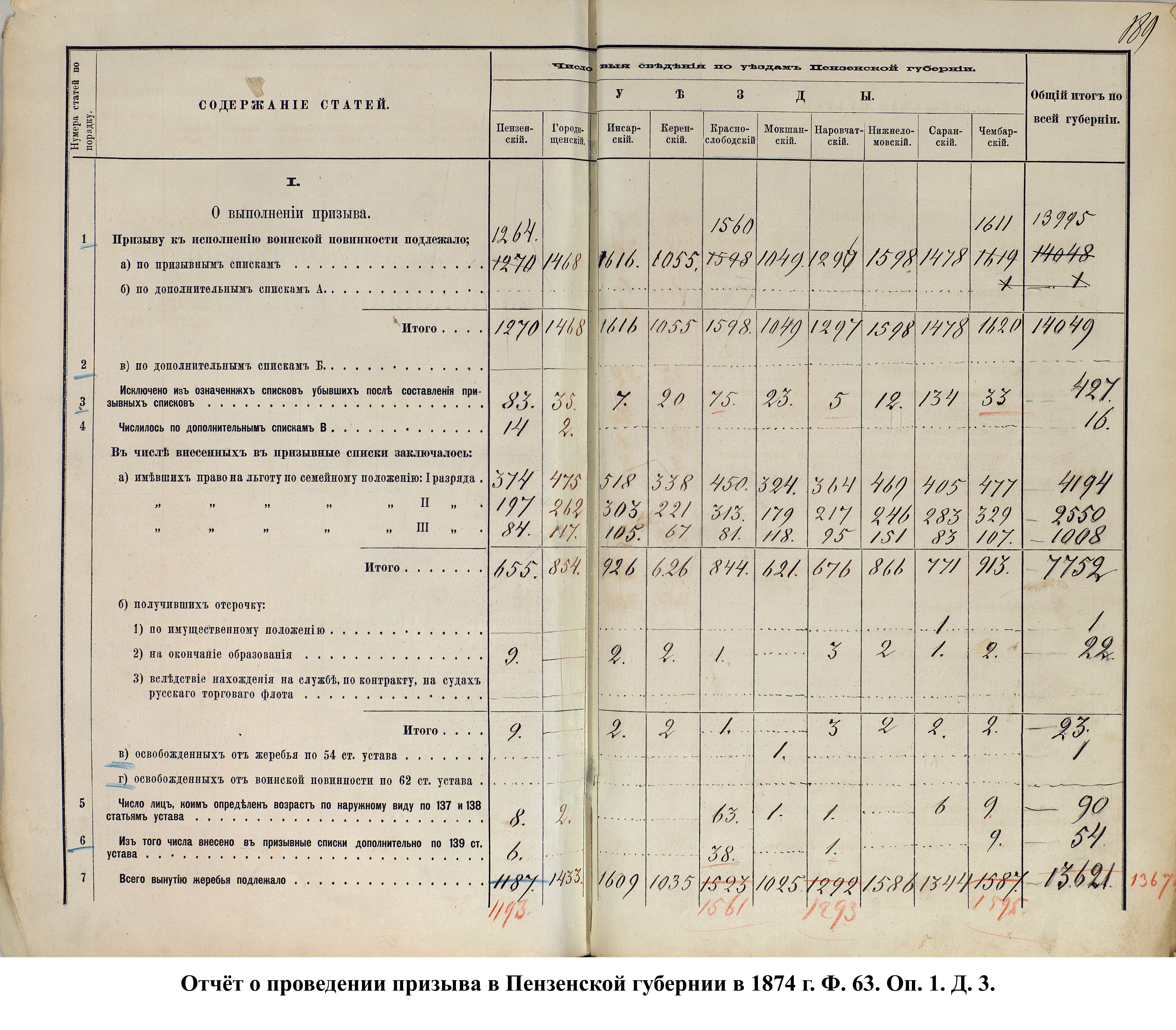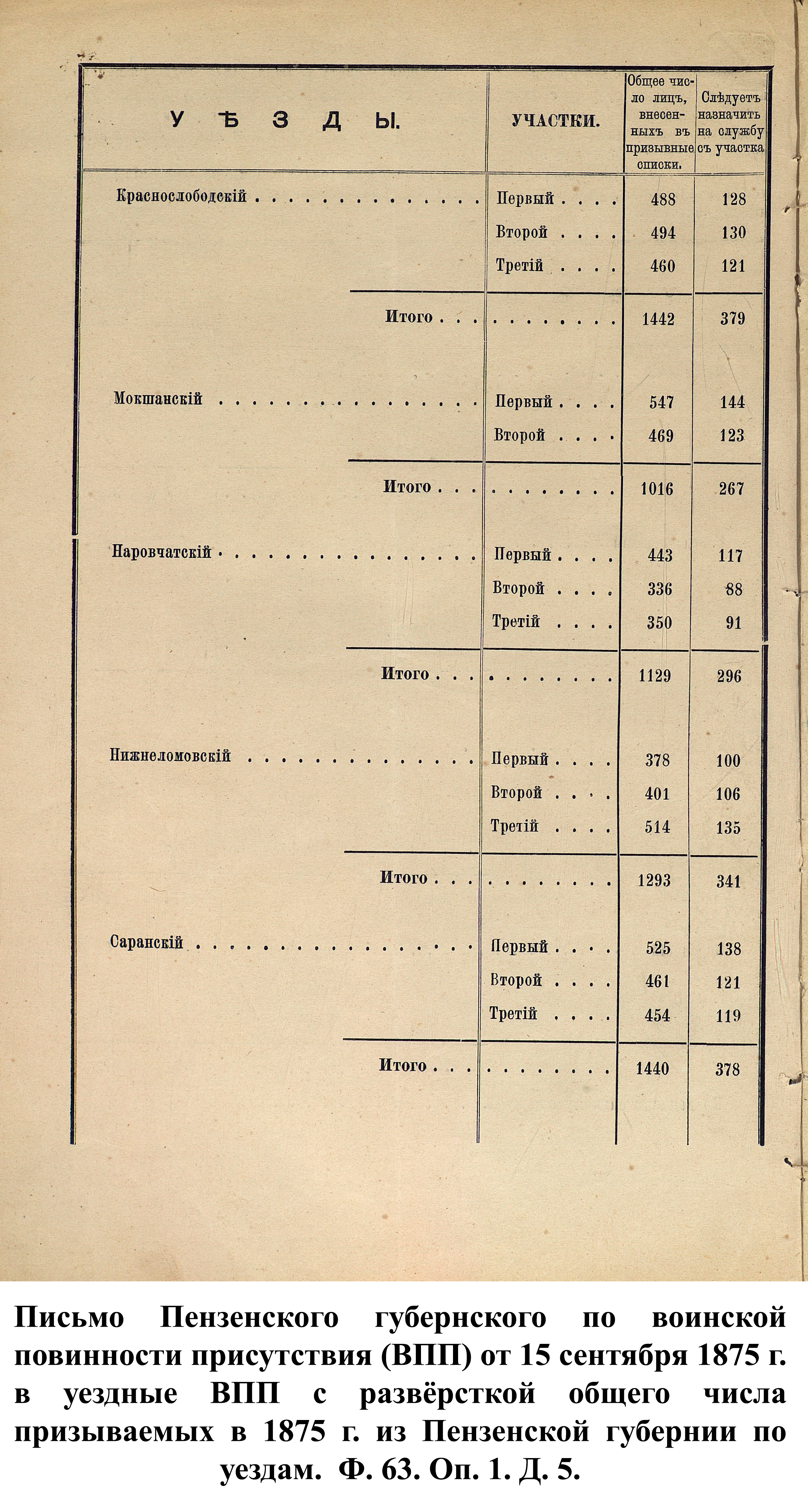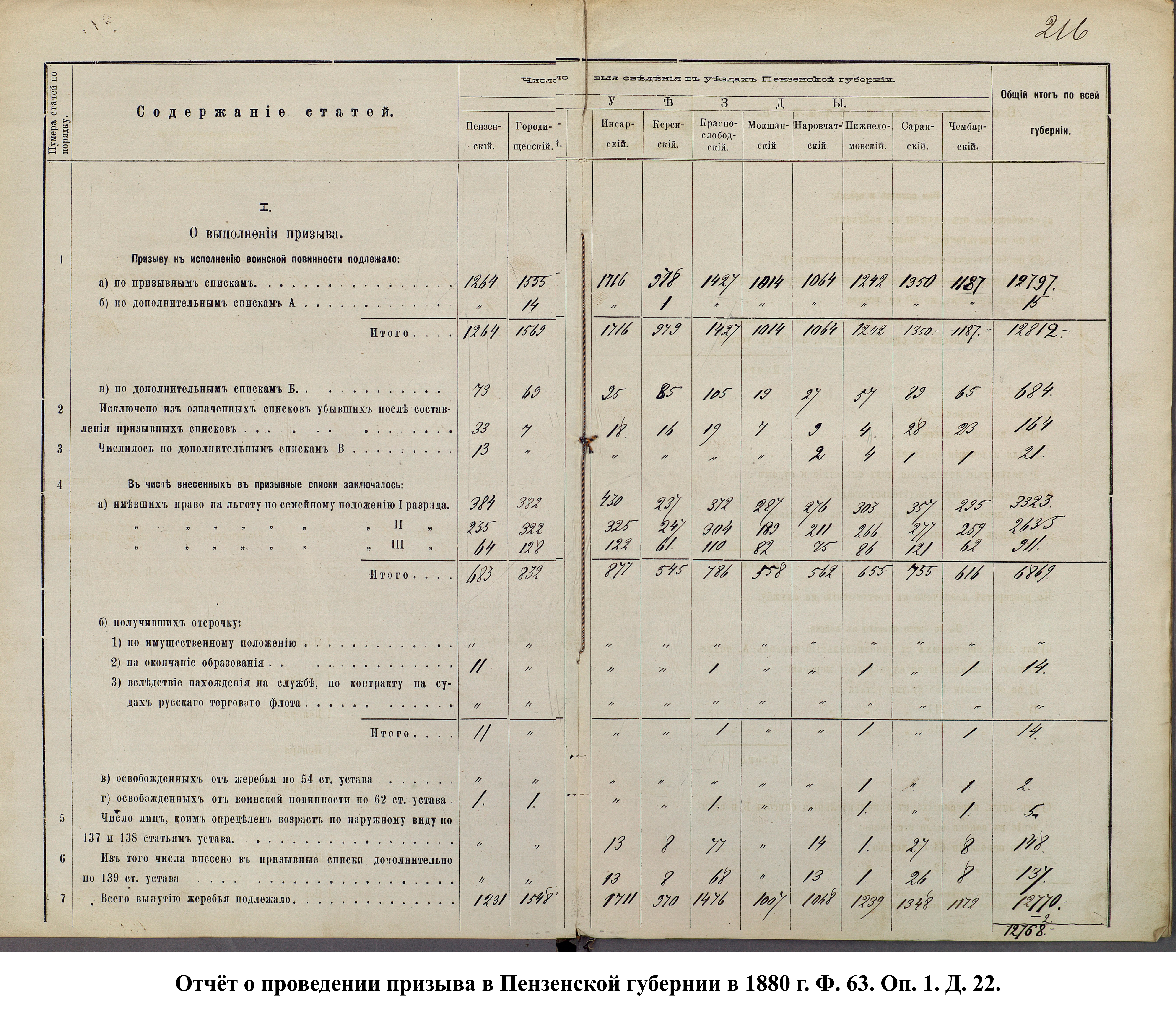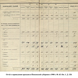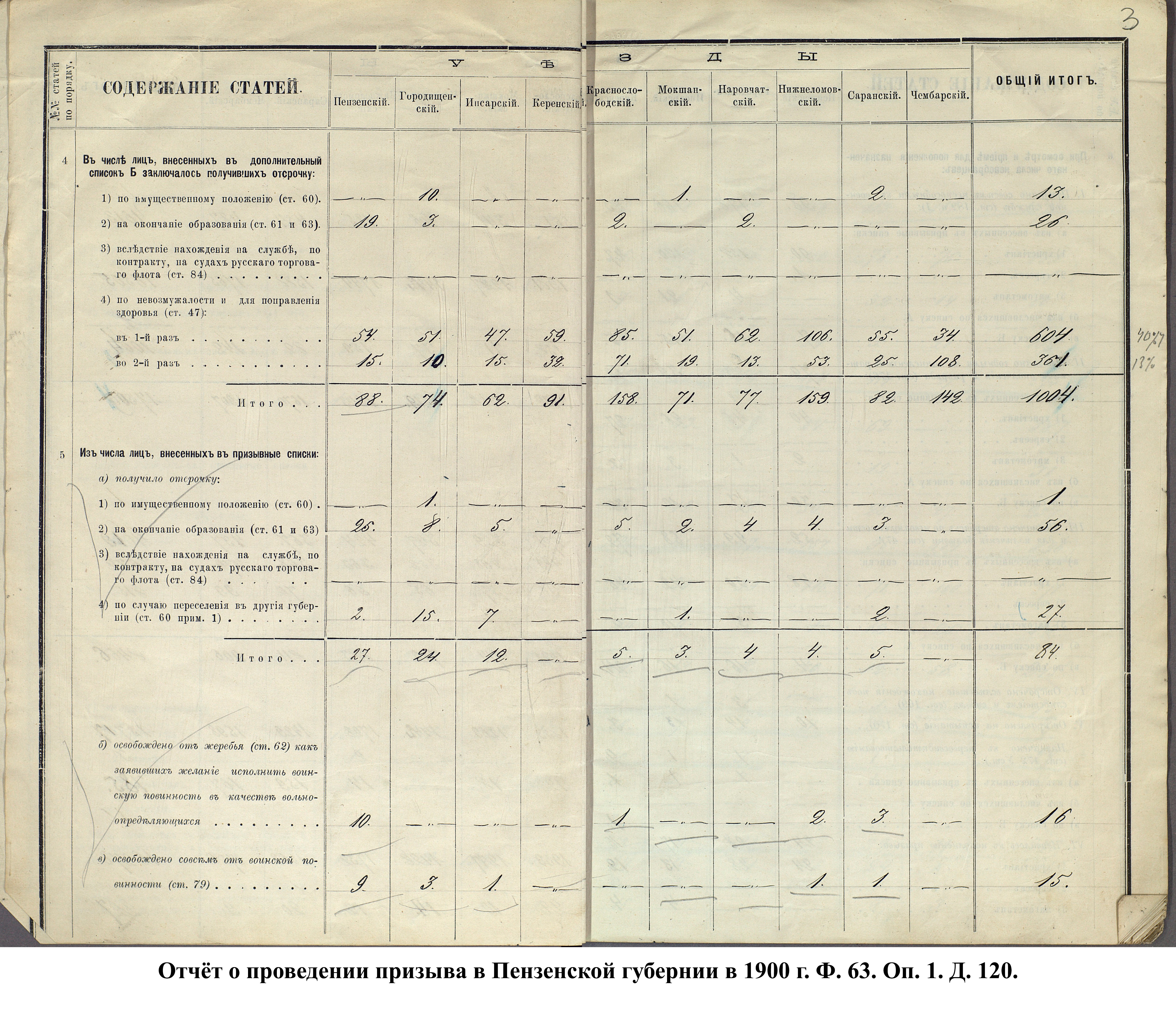 Согласно отчёту Пензенского ВПП от 1885 г., по призывным спискам вытягиванию жребия подлежало 12050 призывников. К исполнению службы было представлено 3248 чел. (см. табл. 3). 162 призывника не явилось к освидетельствованию, из них 61 – из Краснослободского уезда.