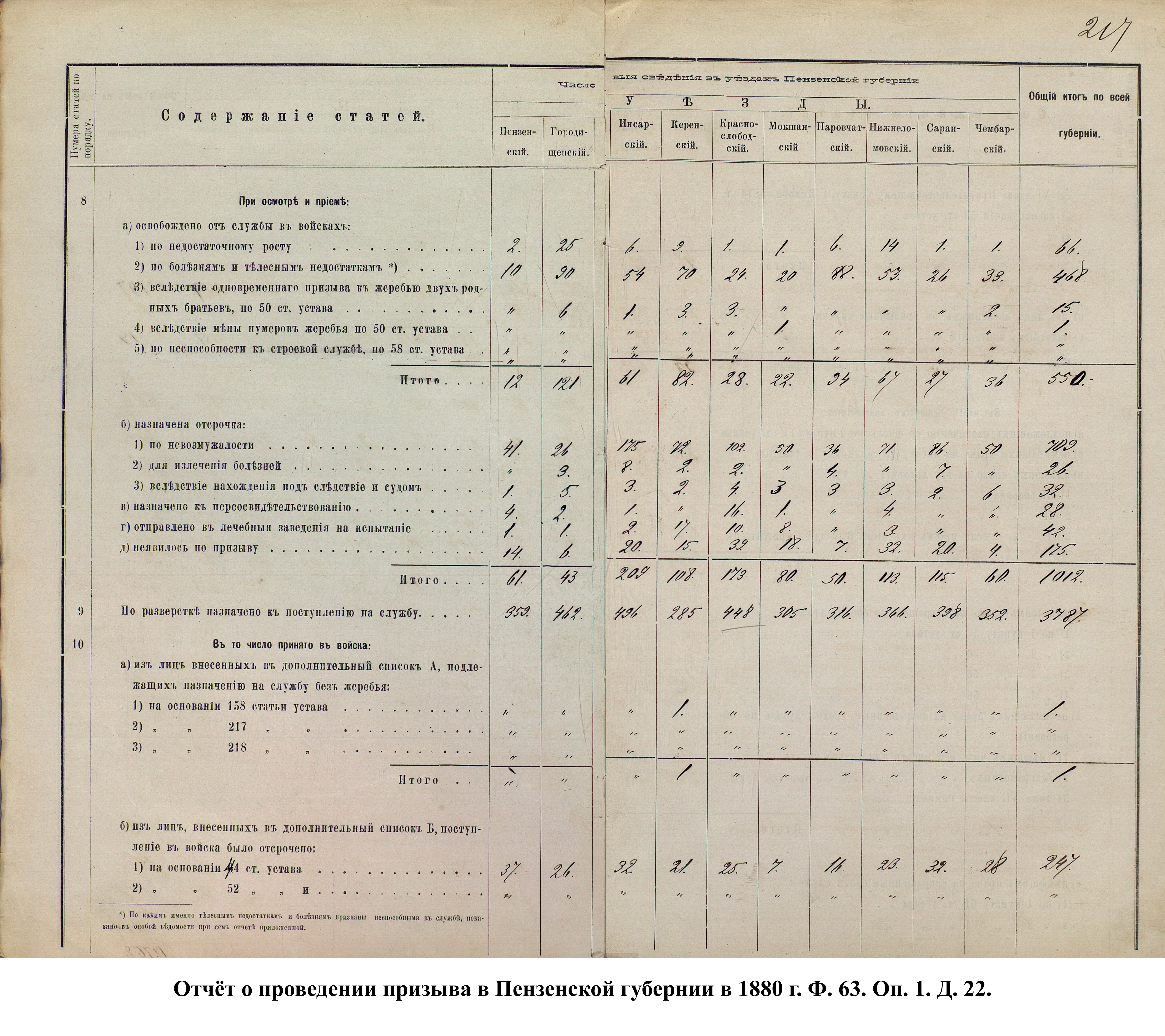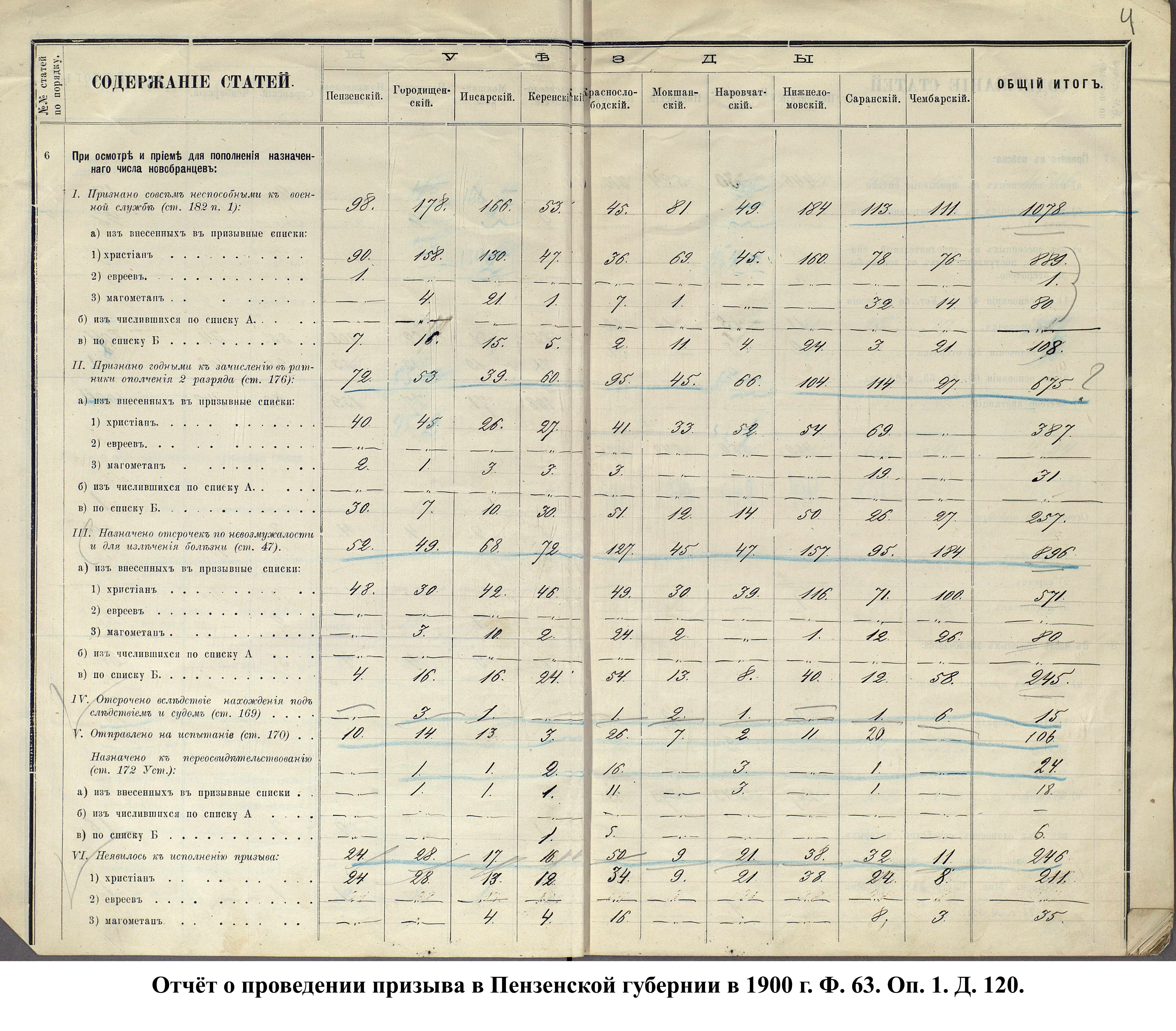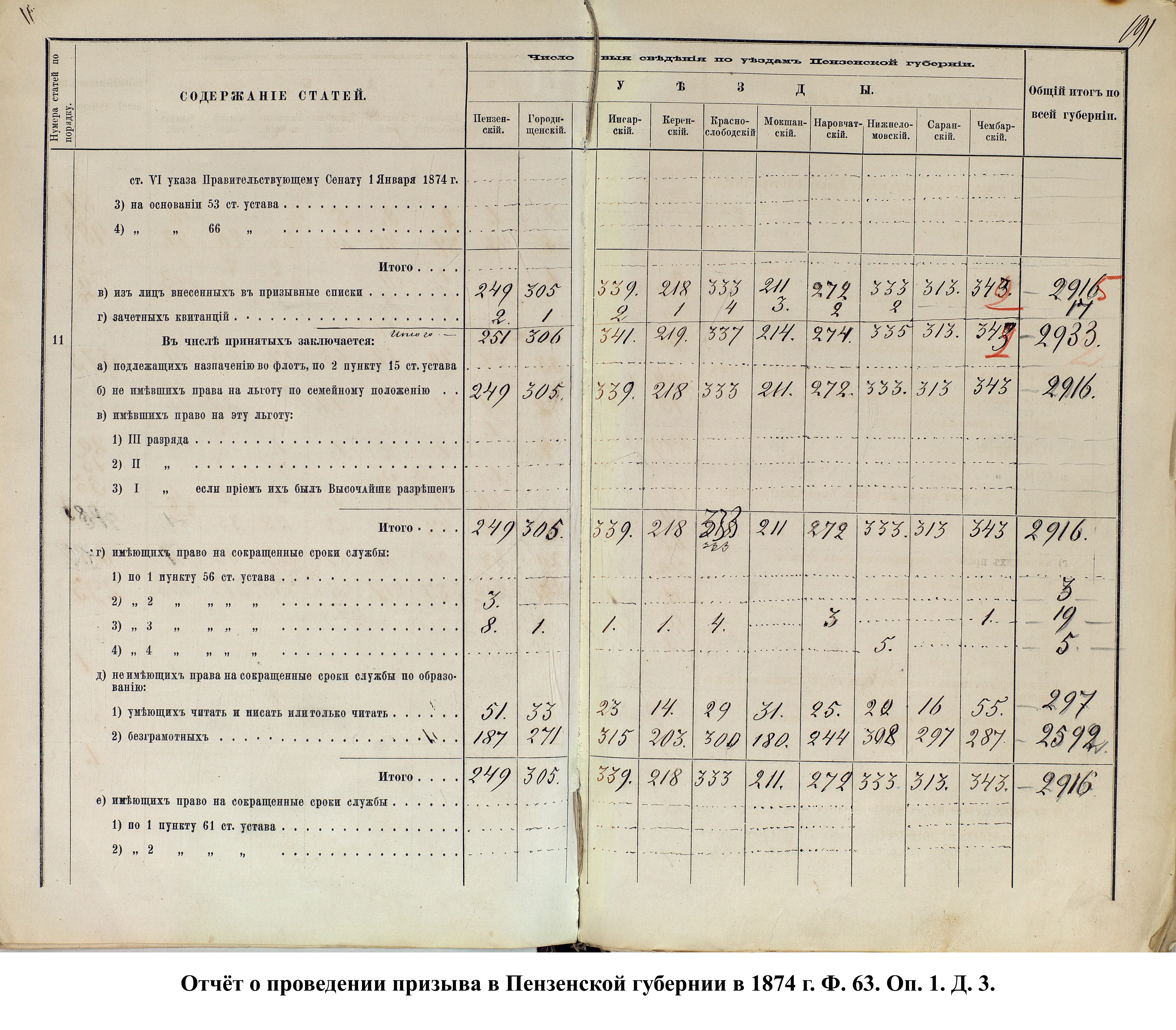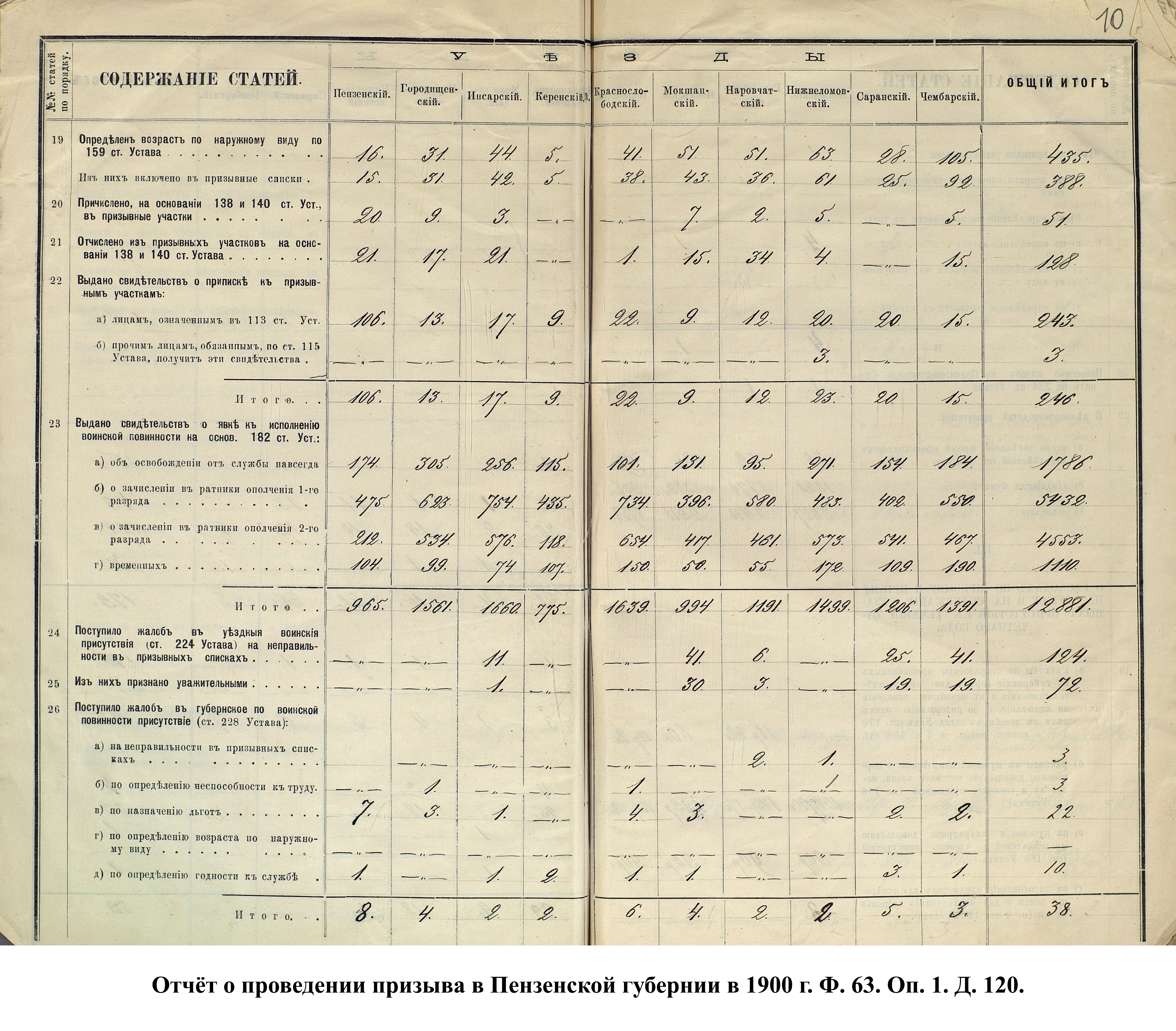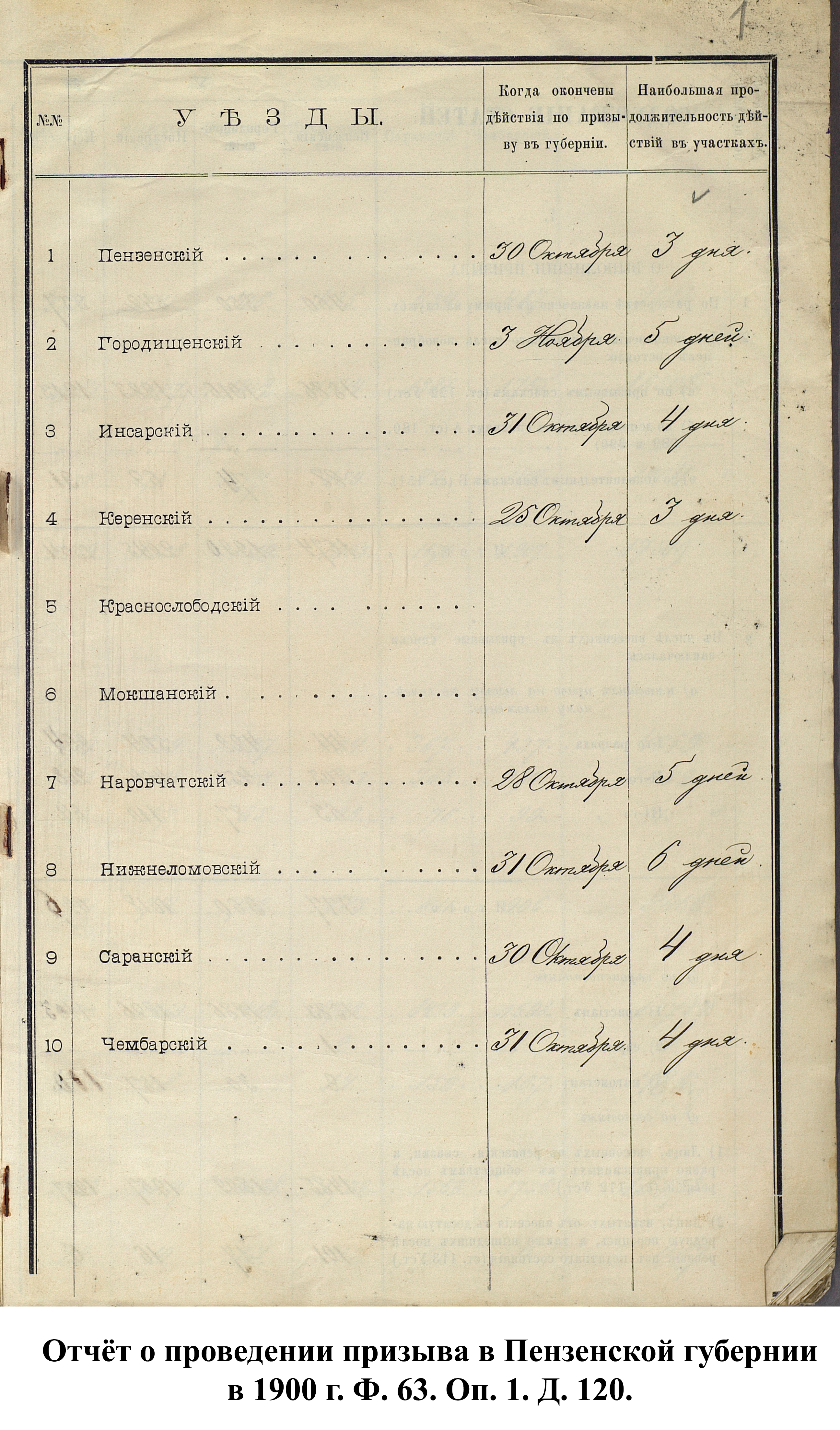 Согласно отчёту Пензенского ВПП от 1885 г., по призывным спискам вытягиванию жребия подлежало 12050 призывников. К исполнению службы было представлено 3248 чел. (см. табл. 3). 162 призывника не явилось к освидетельствованию, из них 61 – из Краснослободского уезда.