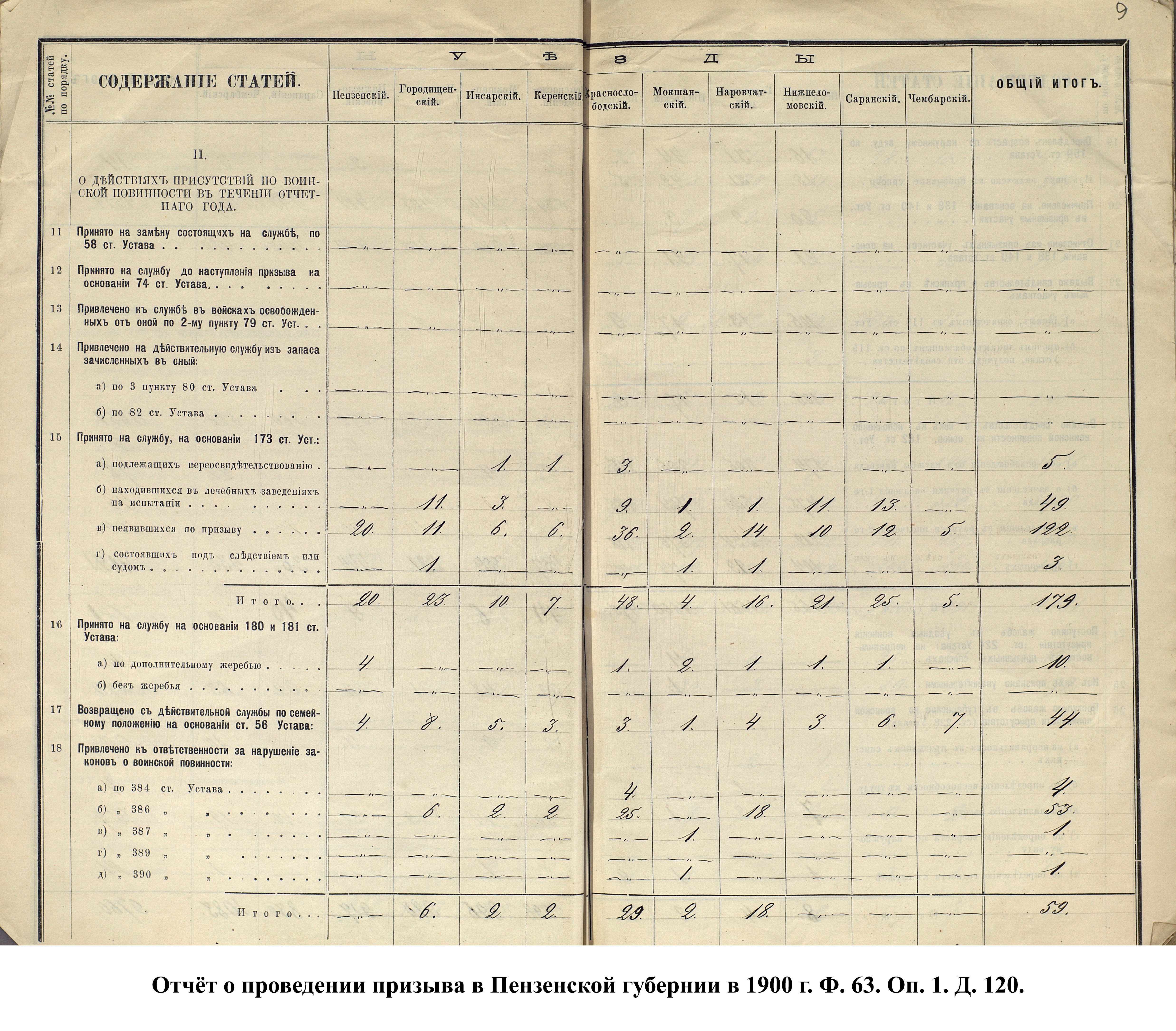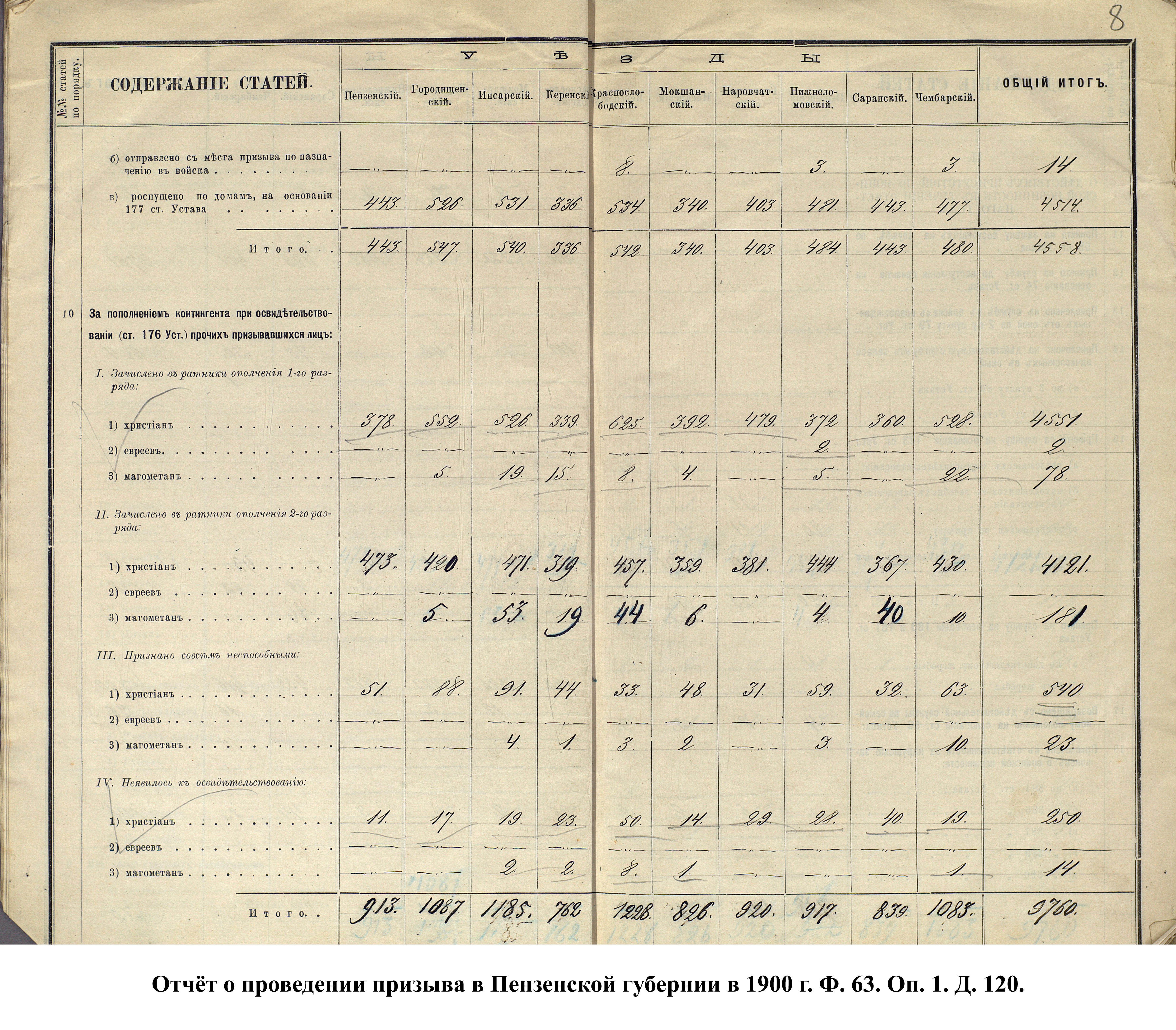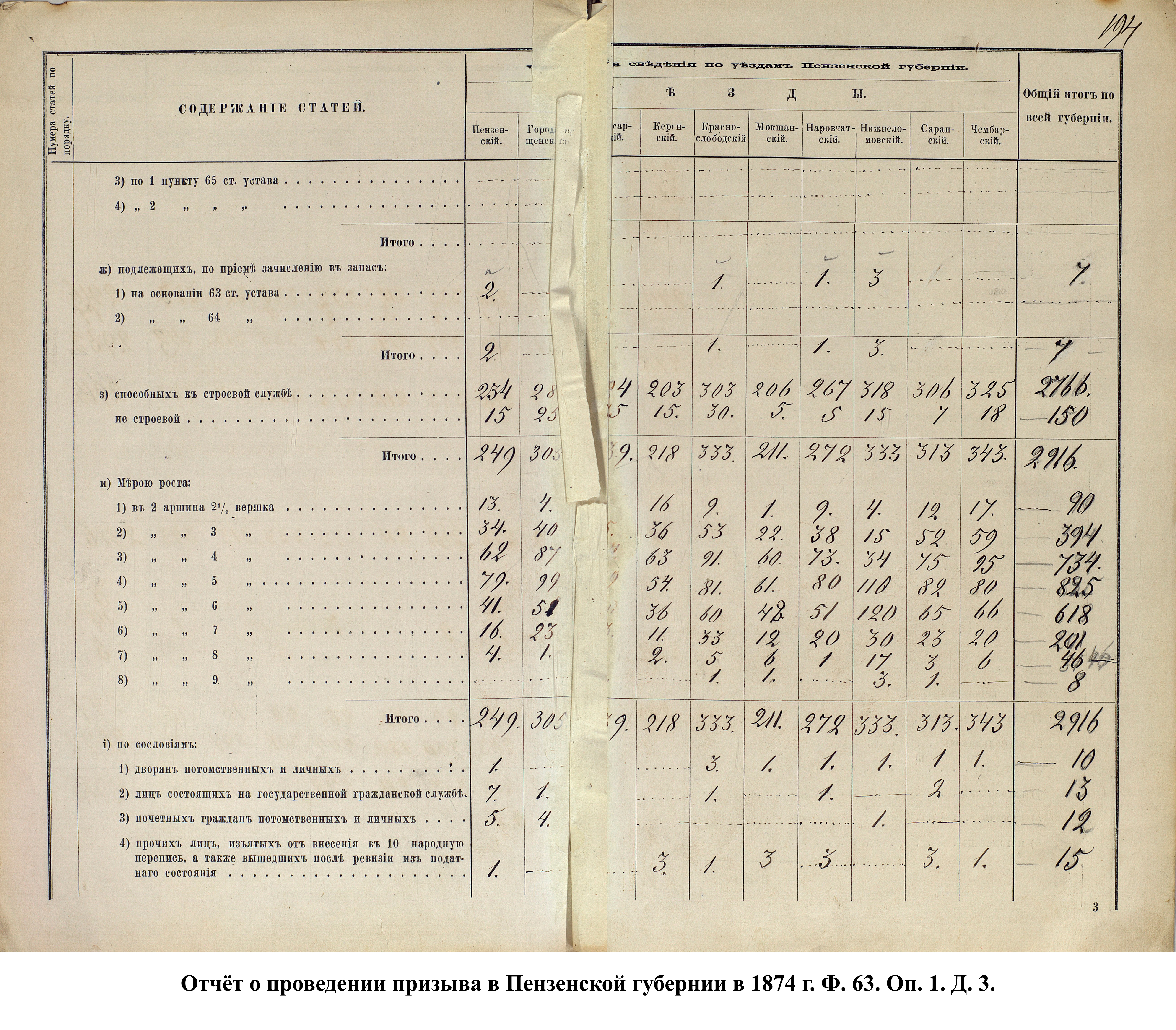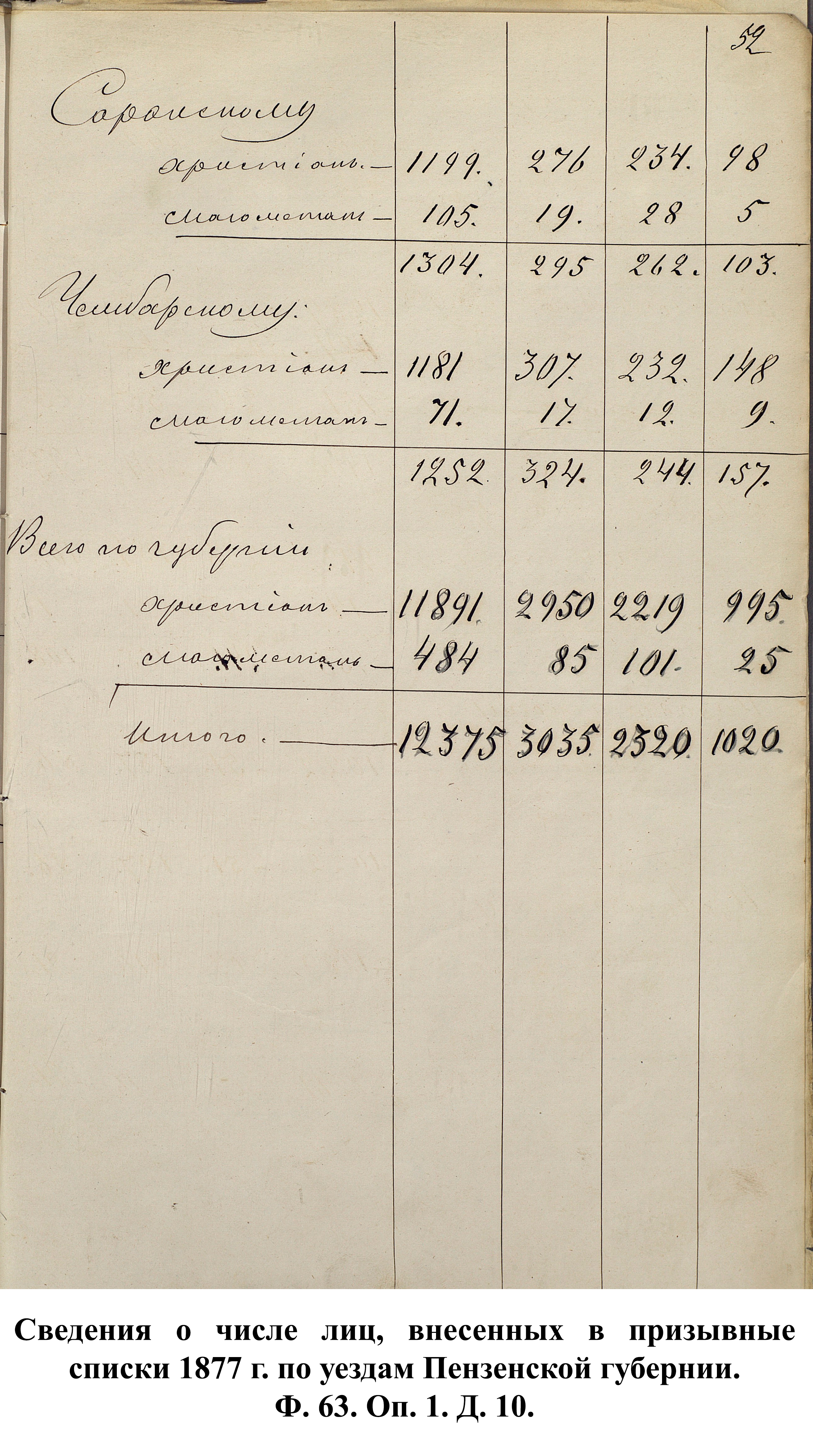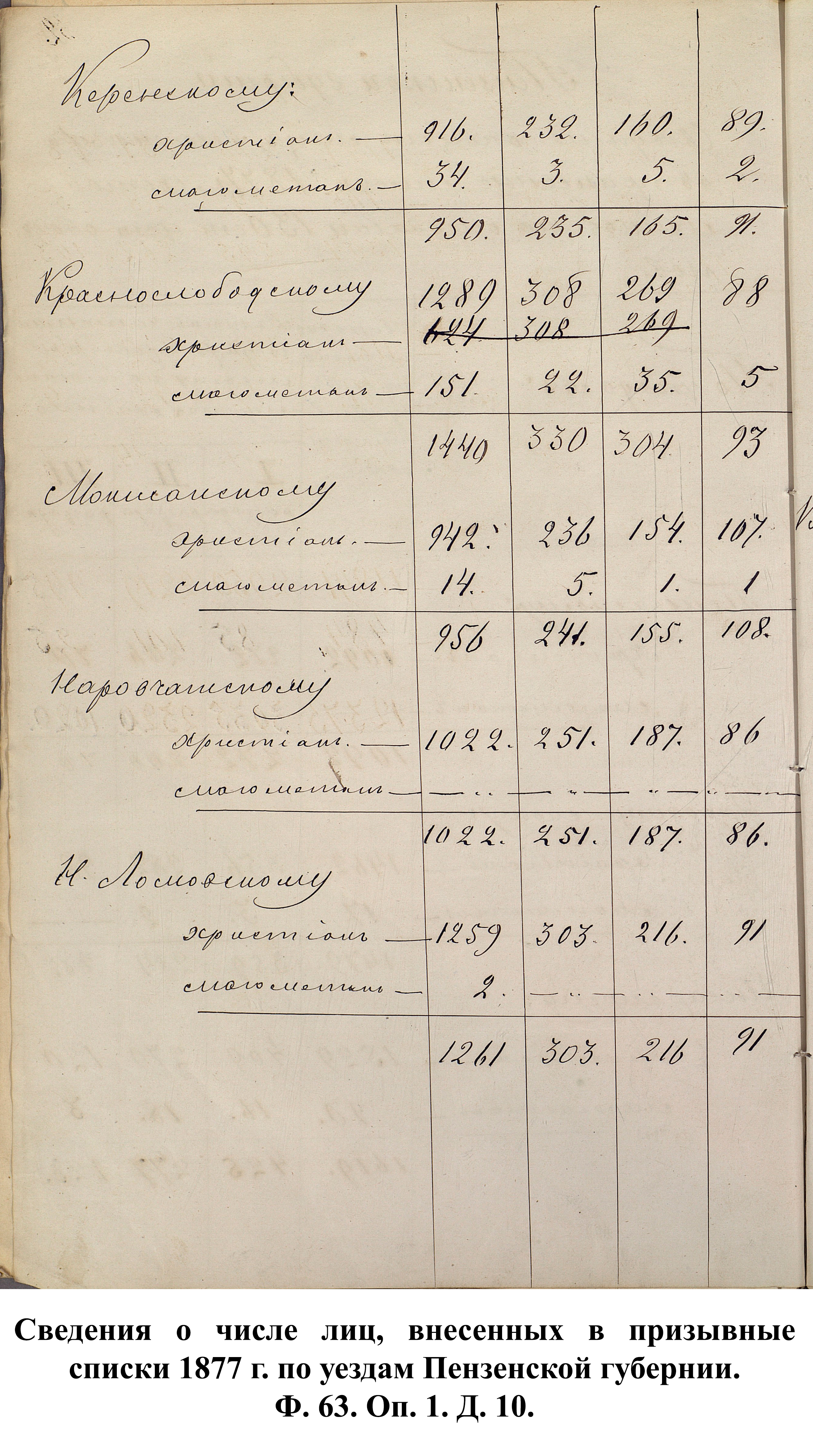 Согласно отчёту Пензенского ВПП от 1885 г., по призывным спискам вытягиванию жребия подлежало 12050 призывников. К исполнению службы было представлено 3248 чел. (см. табл. 3). 162 призывника не явилось к освидетельствованию, из них 61 – из Краснослободского уезда.